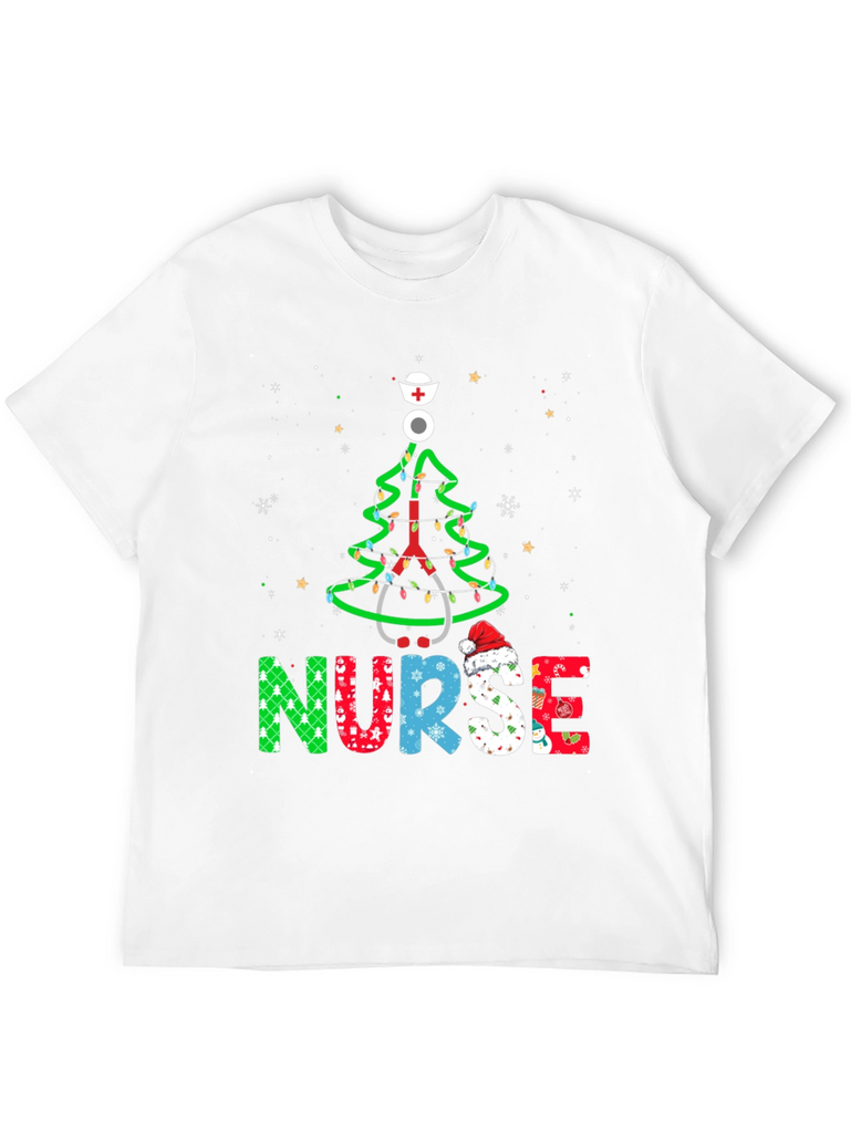 Celebrate the holidays with this festive Nurse Christmas Tree T-Shirt! This black tee features a unique design incorporating a stethoscope shaped Christmas tree adorned with lights, topped with a nurse's cap. The word "NURSE" is emblazoned below the tree with playful patterned letters and a Santa hat on the E. Made from a soft, comfortable fabric, this shirt is perfect for wearing during the Christmas season. Show your appreciation for the healthcare heroes in your life with this fun and festive t-shirt. Great for holiday parties, casual wear, or as a thoughtful gift for nurses!