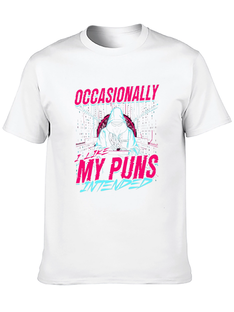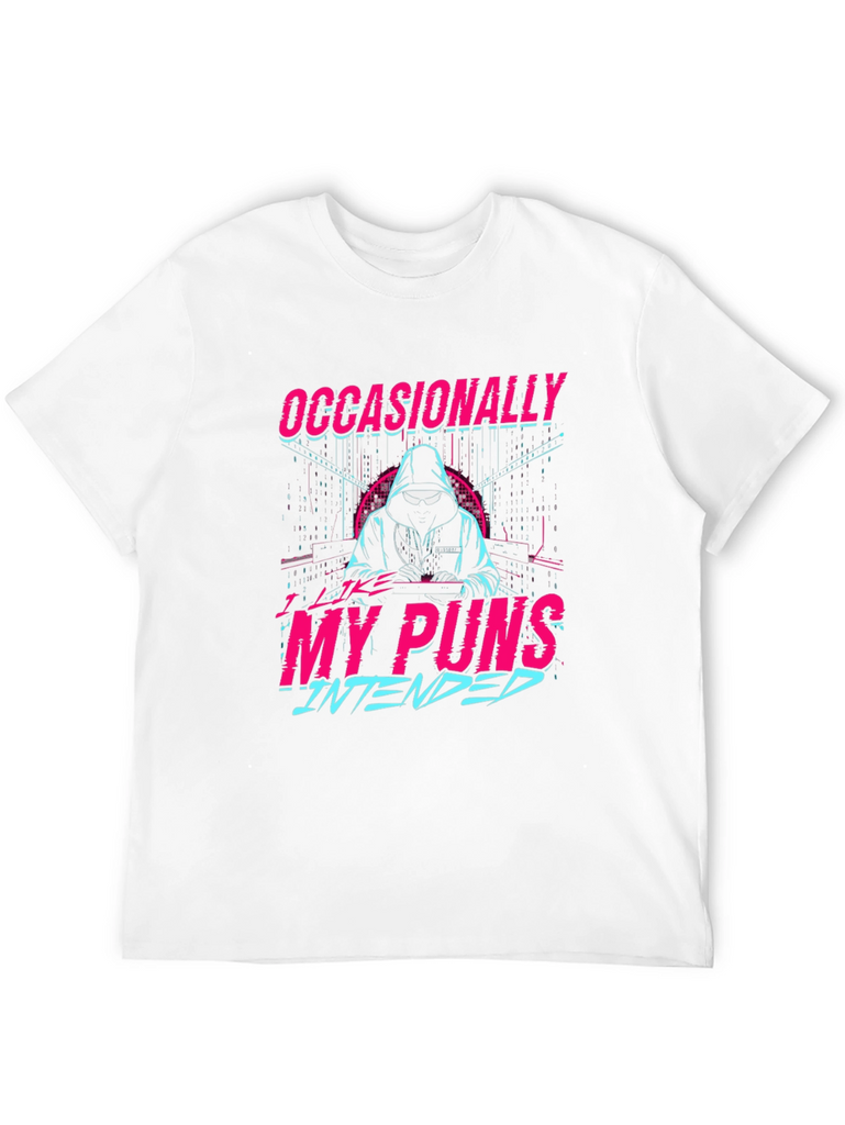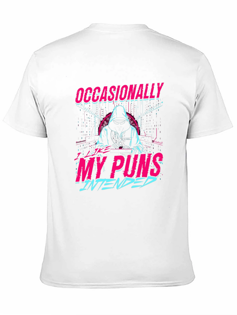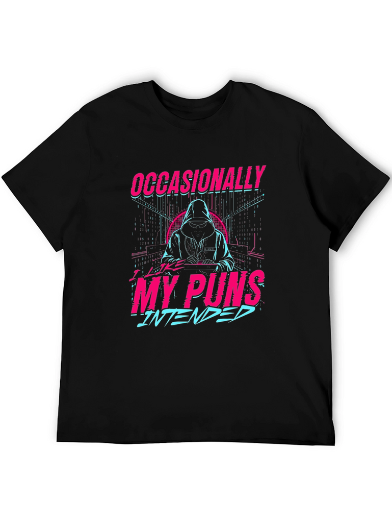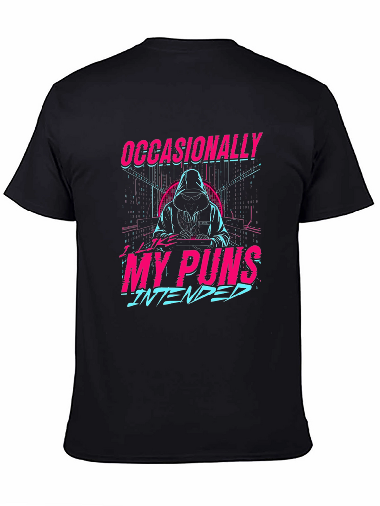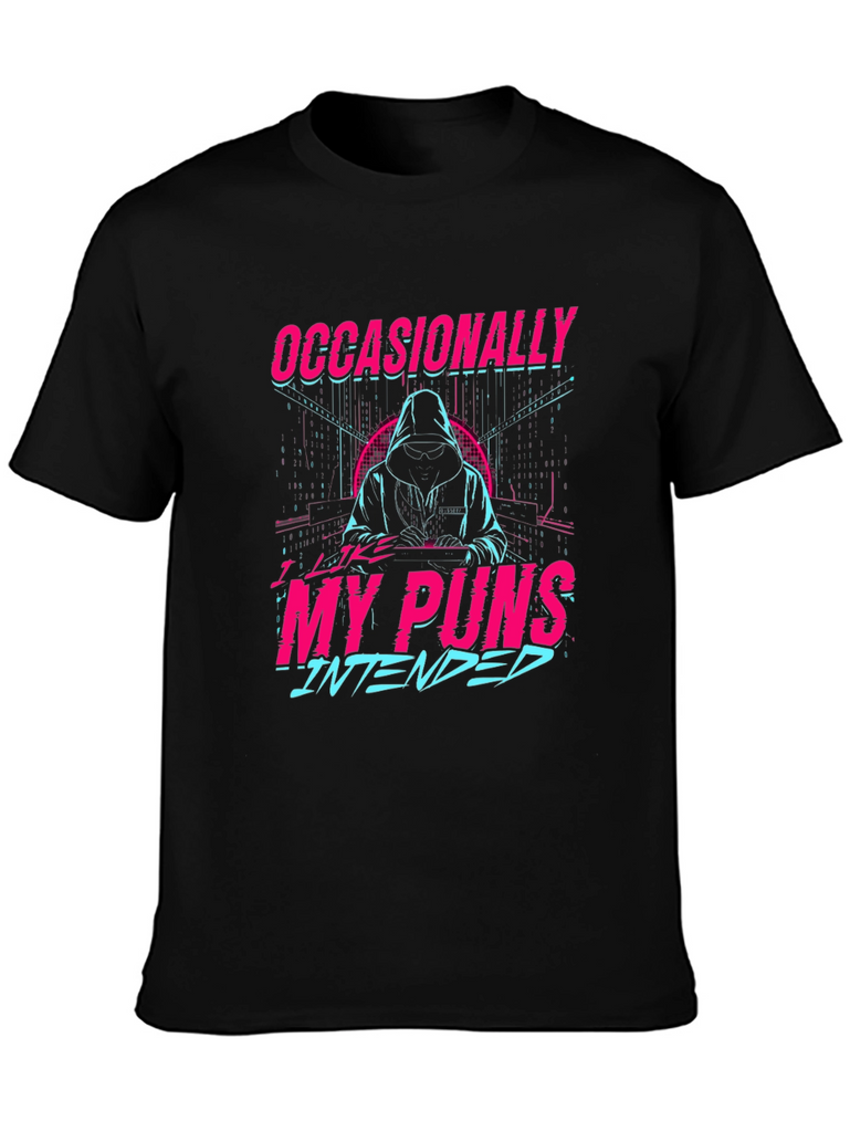 Make a statement with this eye-catching black t-shirt featuring a unique graphic design. The design showcases a stylized figure in a hoodie amidst a digital-inspired backdrop, with the clever text "Occasionally My Puns Intended" in vibrant pink and blue, creating a retro-futuristic aesthetic. Perfect for casual wear, this tee offers a comfortable fit and allows you to express your playful side with a touch of humor. Ideal for everyday outings, social gatherings, or as a gift for the pun-loving person in your life. Embrace your witty side with this distinctive t-shirt!