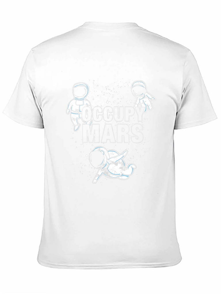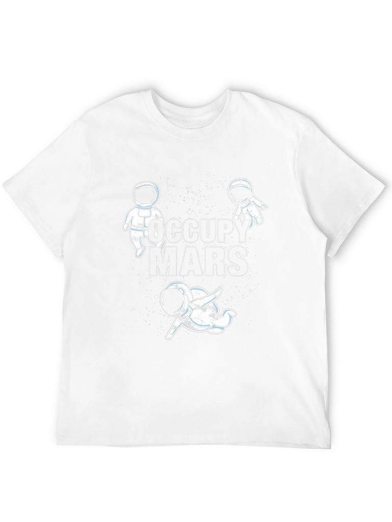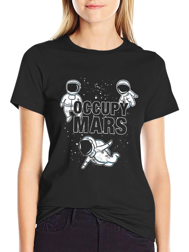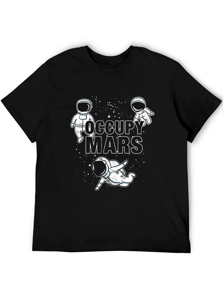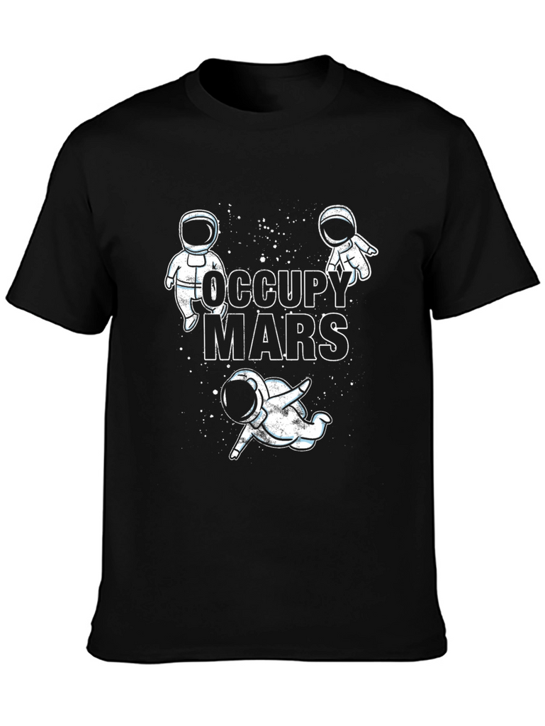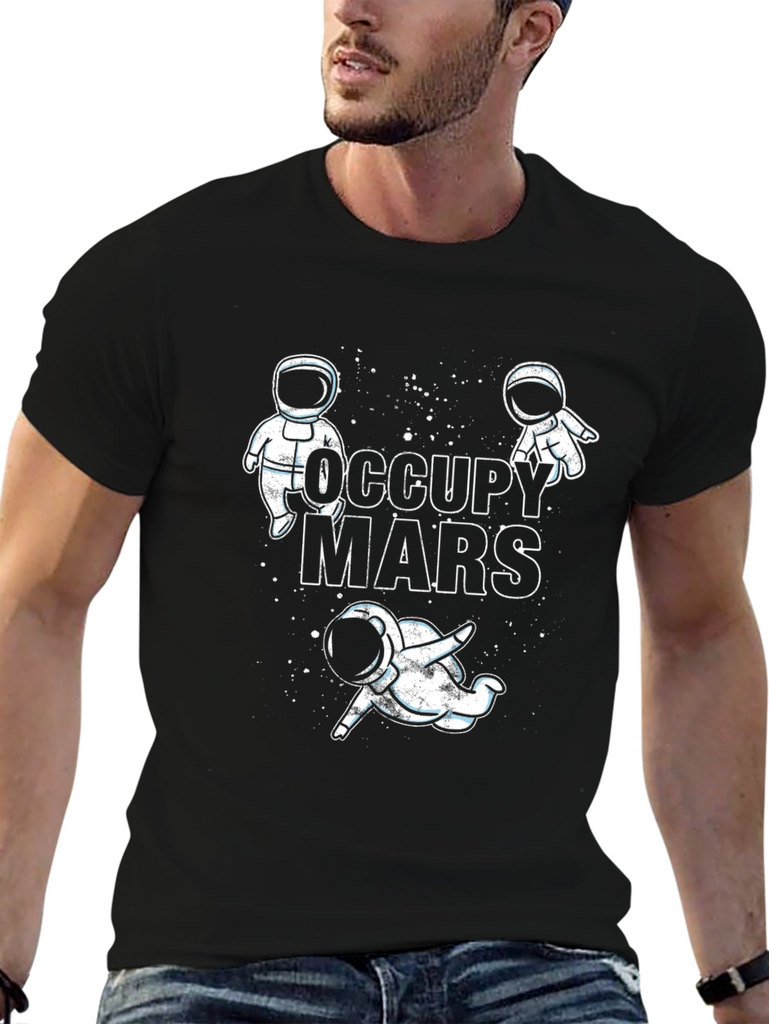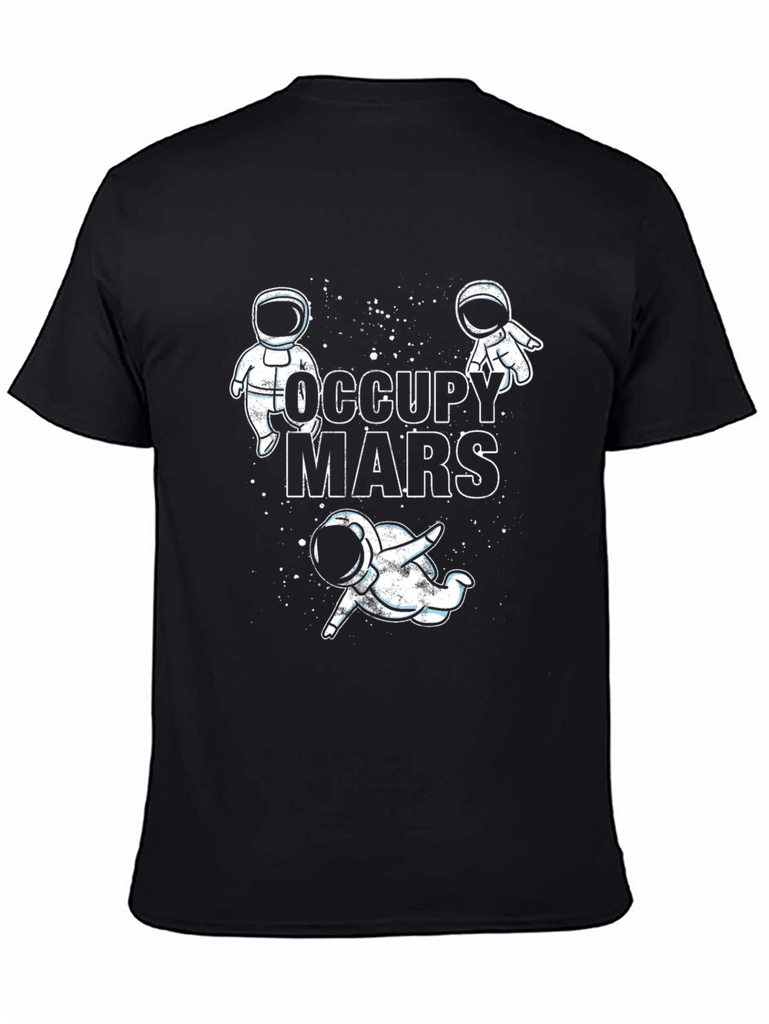 Explore the cosmos in style with this black graphic t-shirt! Featuring a bold "Occupy Mars" slogan surrounded by whimsical astronaut illustrations, this tee is perfect for space enthusiasts. The design is printed on what appears to be a soft, comfortable cotton blend fabric, ensuring a great fit and feel. Ideal for casual wear, science conventions, or as a unique gift. Show off your passion for space exploration with this eye-catching t-shirt. Get ready to launch your wardrobe to new heights!