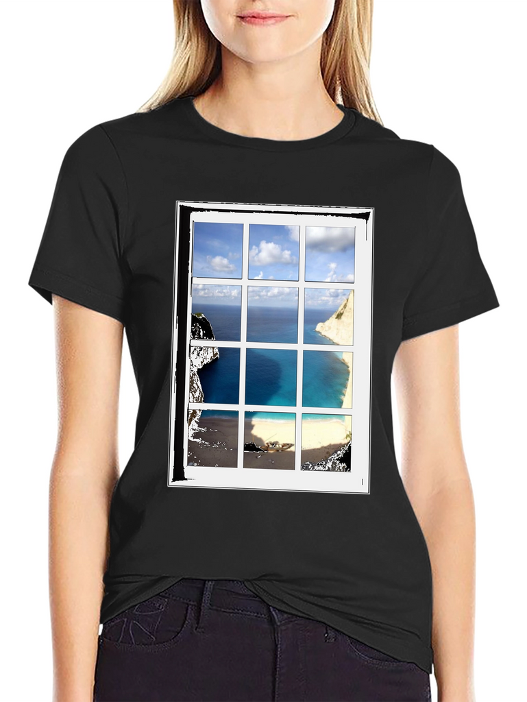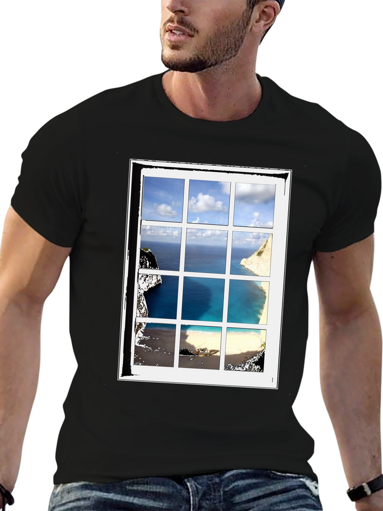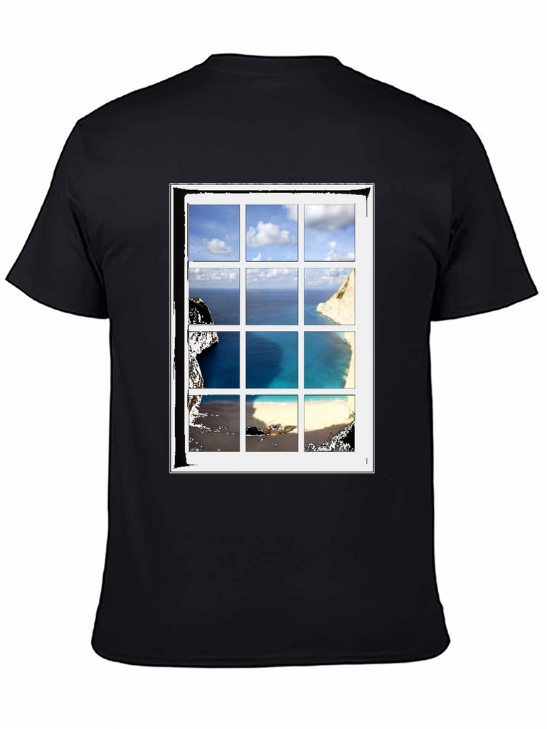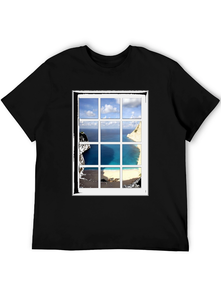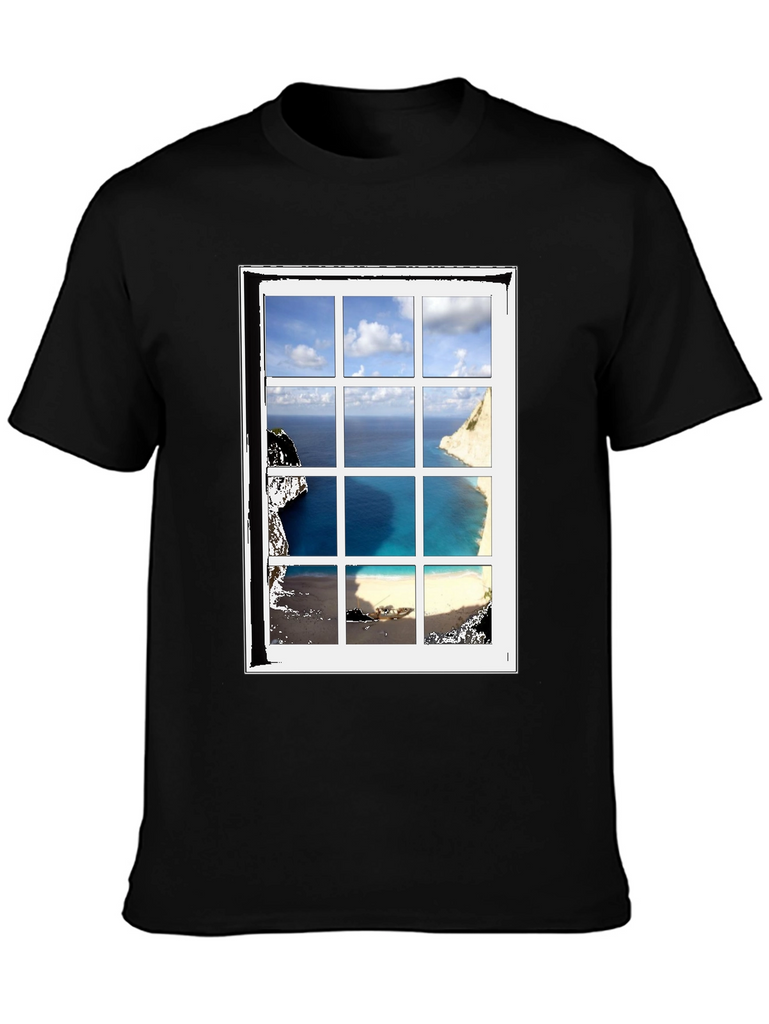Show off your love for the ocean with this stylish black t-shirt. This unique tee features a square graphic of a window pane that shows the beautiful blue ocean and sky. The design gives the illusion of looking out onto the sea, bringing a sense of tranquility and wanderlust to your wardrobe. Made from a comfortable, breathable material, this t-shirt is perfect for everyday wear. Whether you're strolling along the beach, hanging out with friends, or simply want to add a touch of coastal charm to your outfit, this ocean view window t-shirt is the perfect choice.