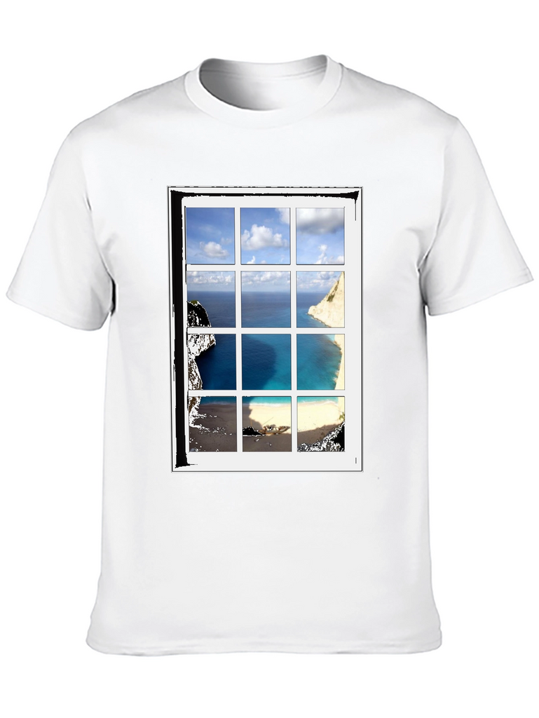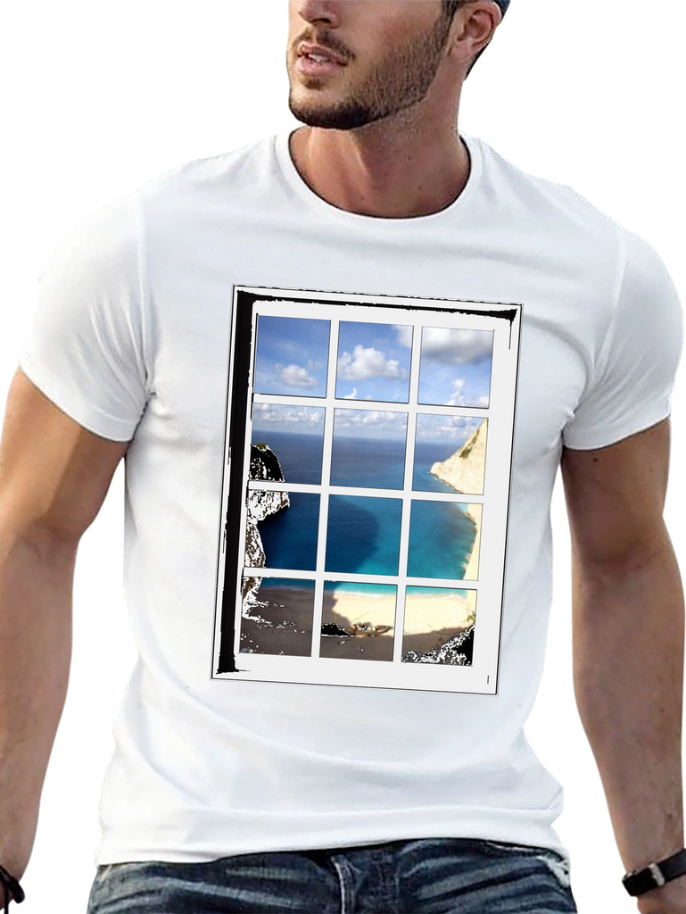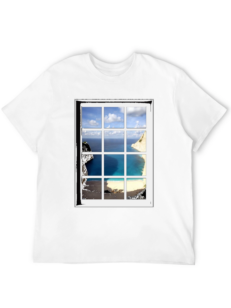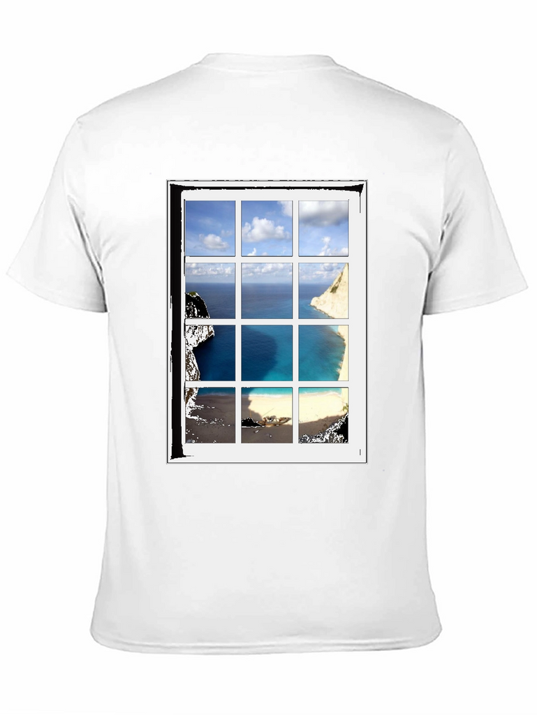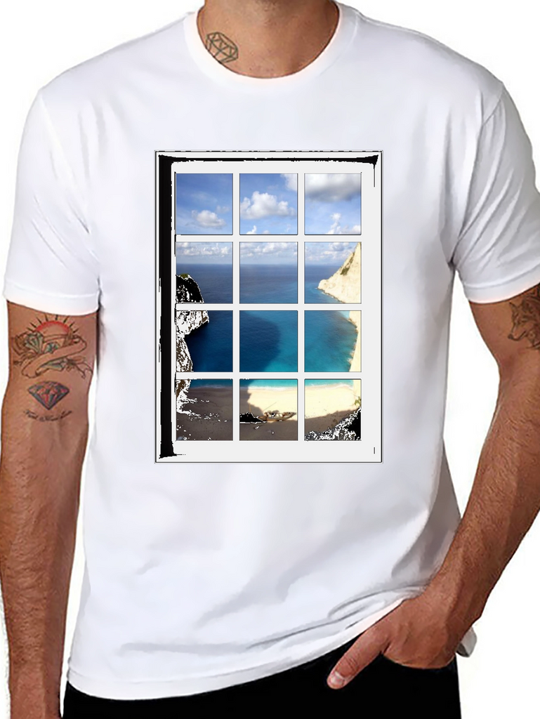 Show off your love for the ocean with this stylish black t-shirt. This unique tee features a square graphic of a window pane that shows the beautiful blue ocean and sky. The design gives the illusion of looking out onto the sea, bringing a sense of tranquility and wanderlust to your wardrobe. Made from a comfortable, breathable material, this t-shirt is perfect for everyday wear. Whether you're strolling along the beach, hanging out with friends, or simply want to add a touch of coastal charm to your outfit, this ocean view window t-shirt is the perfect choice.