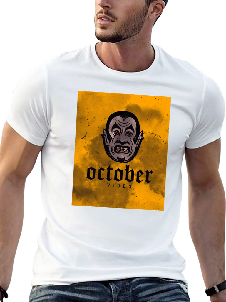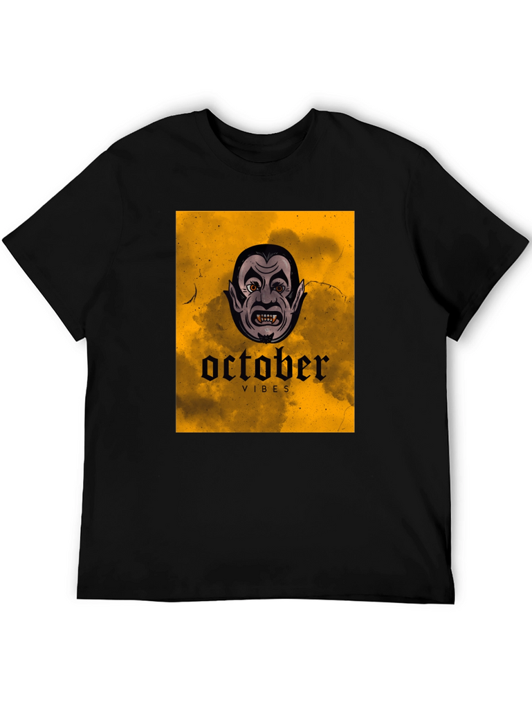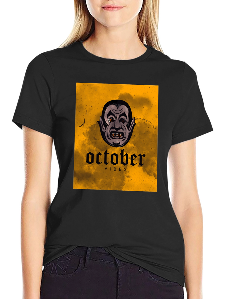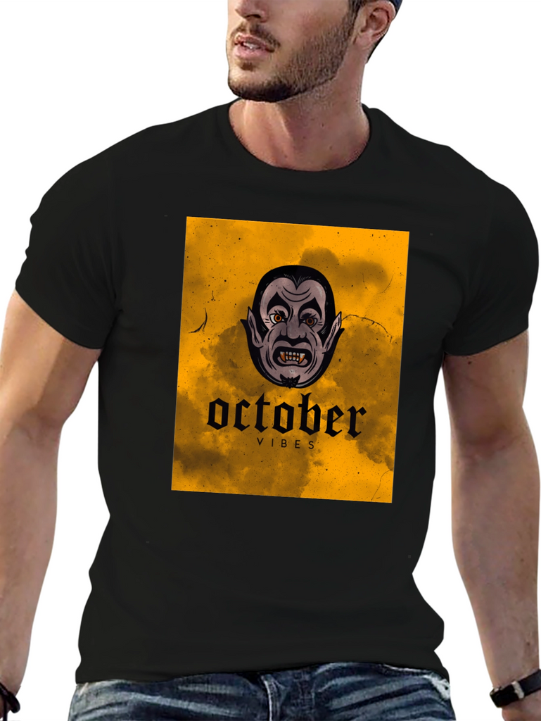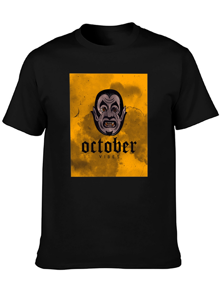Embrace the spooky season with this unique graphic tee! Featuring a striking vampire design set against a vibrant orange backdrop with 'October Vibes' text, this t-shirt is perfect for Halloween enthusiasts. The classic black color and comfortable fit make it a versatile addition to your wardrobe. Wear it to parties, casual outings, or while enjoying your favorite fall activities. Show off your love for Halloween with this eye-catching and trendy tee. The graphic design is of high quality, making it a standout piece. Get yours today!