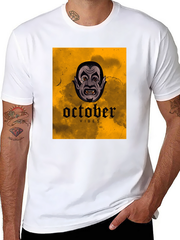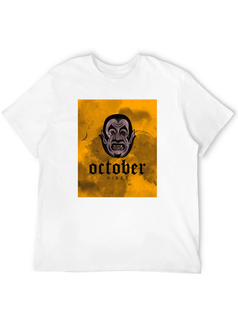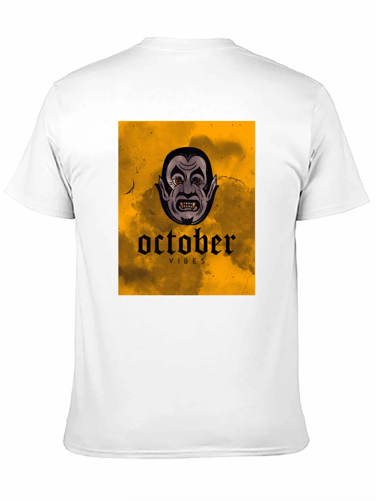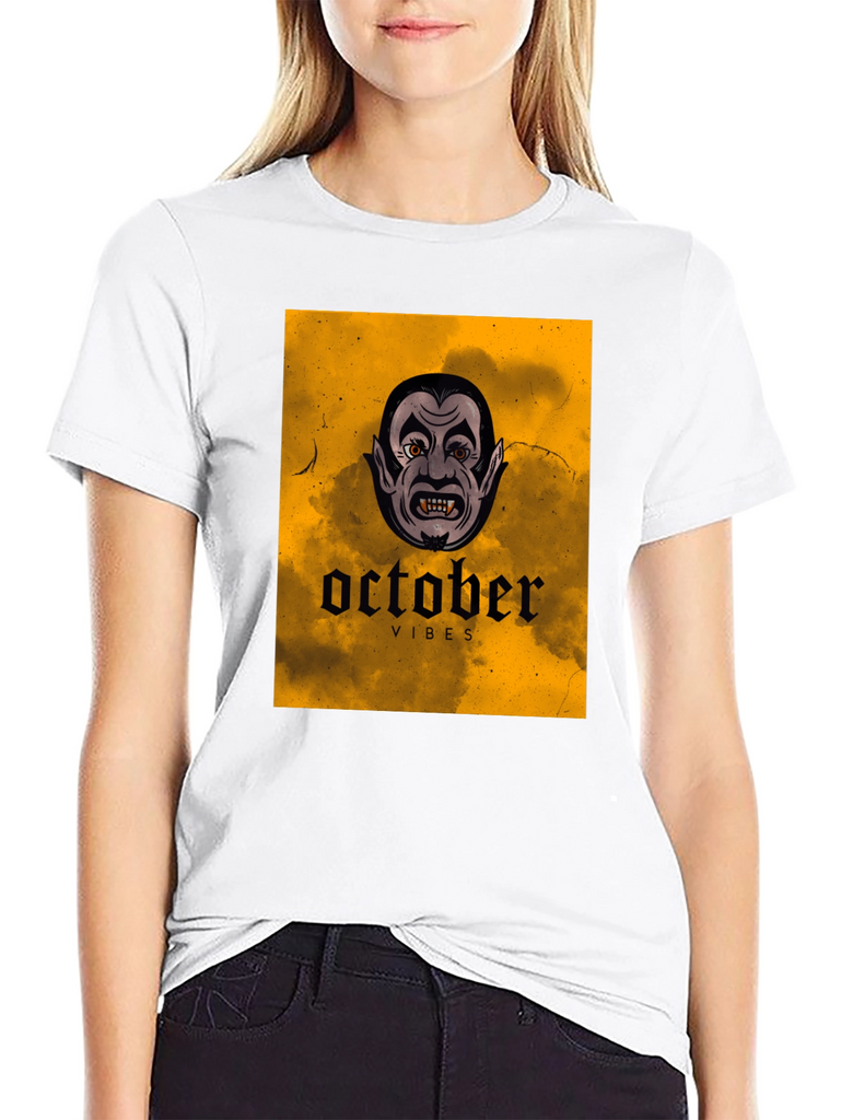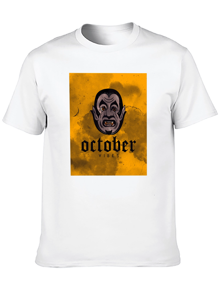Embrace the spooky season with this unique graphic tee! Featuring a striking vampire design set against a vibrant orange backdrop with 'October Vibes' text, this t-shirt is perfect for Halloween enthusiasts. The classic black color and comfortable fit make it a versatile addition to your wardrobe. Wear it to parties, casual outings, or while enjoying your favorite fall activities. Show off your love for Halloween with this eye-catching and trendy tee. The graphic design is of high quality, making it a standout piece. Get yours today!