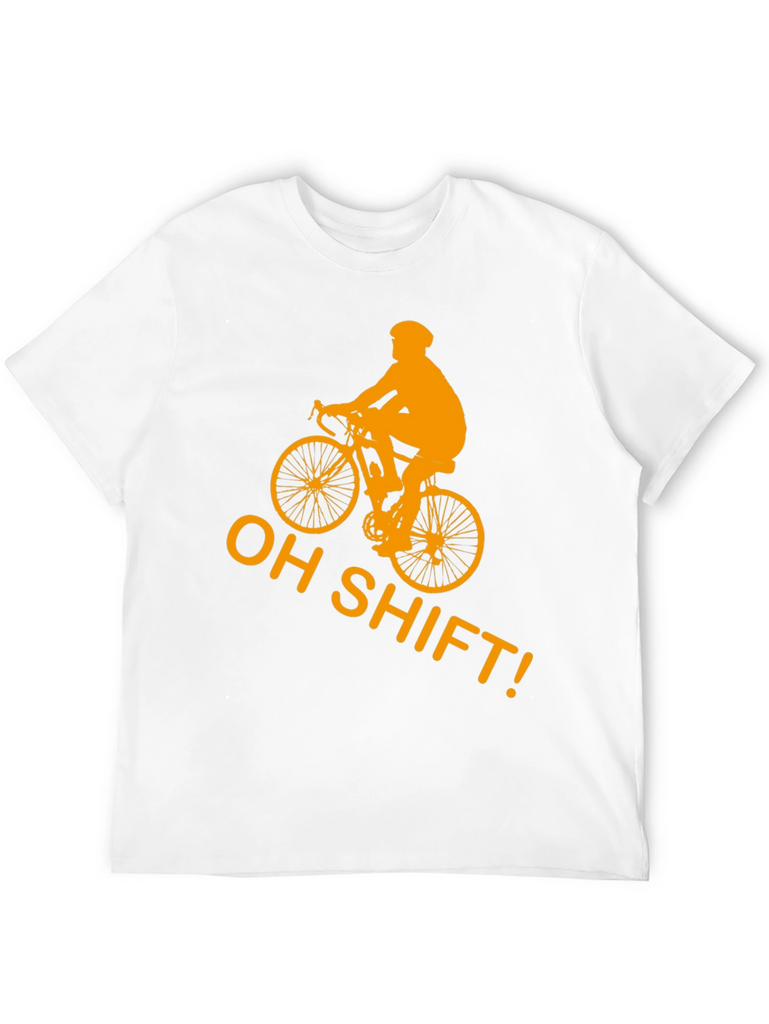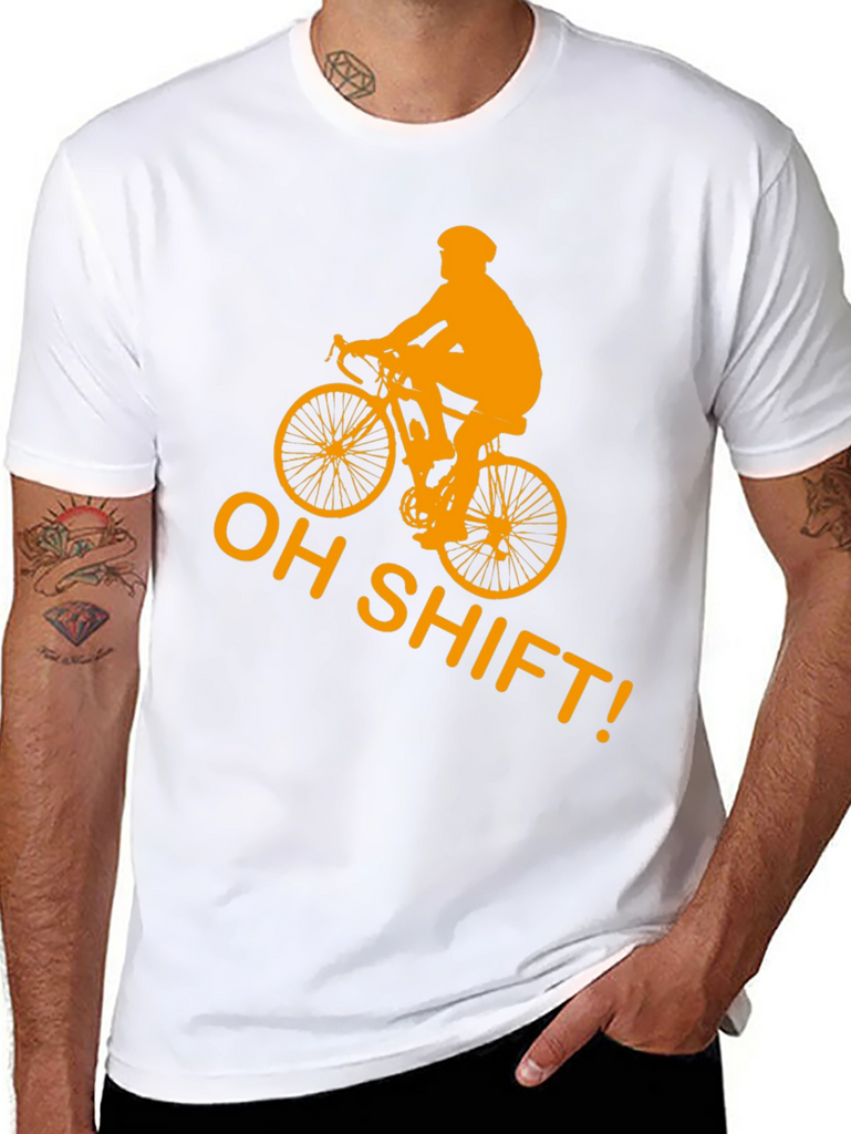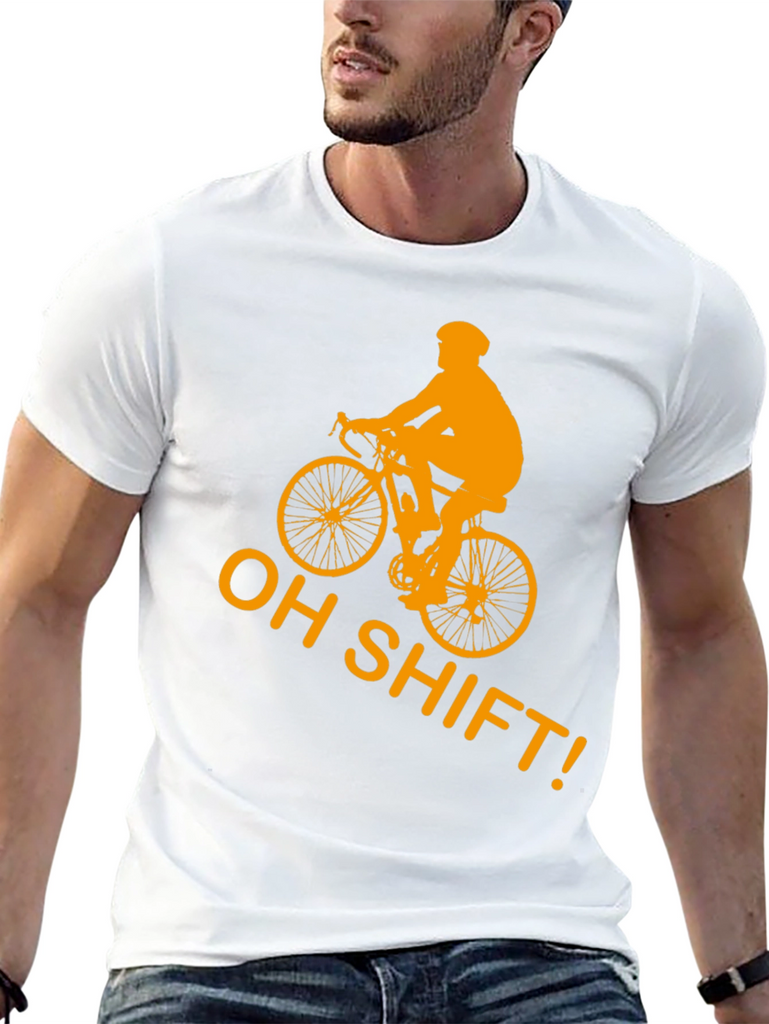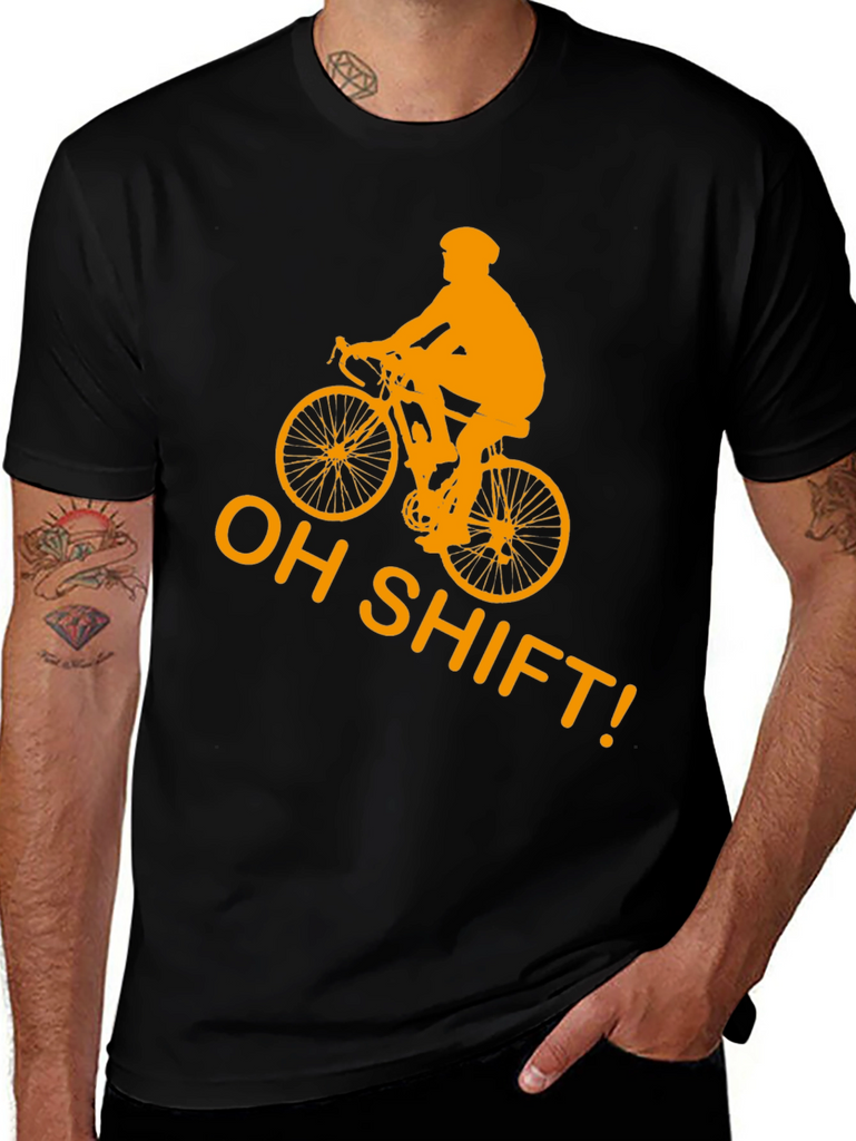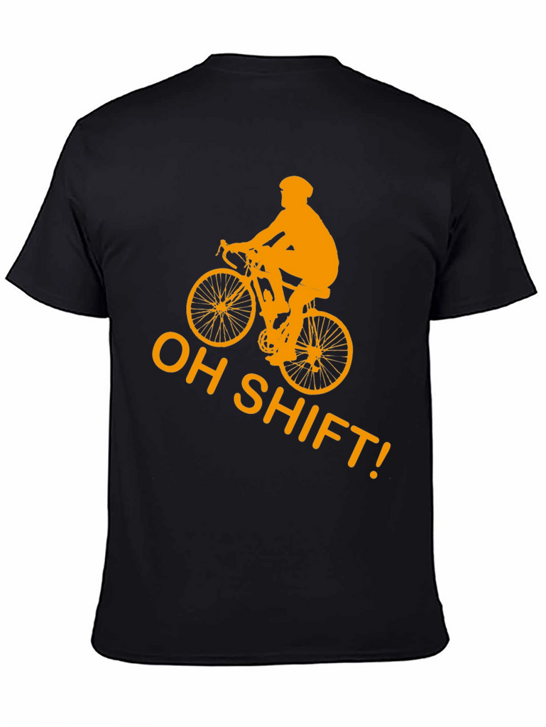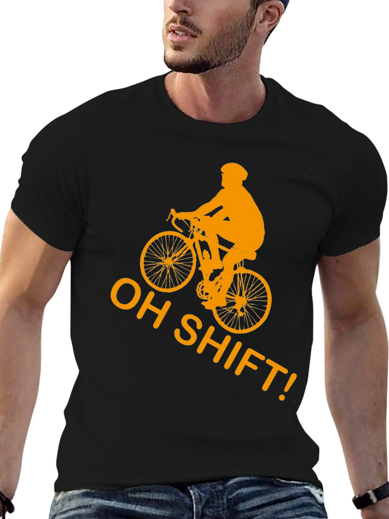 Gear up for laughs with this black t-shirt featuring a bold, golden-orange graphic of a cyclist and the witty phrase "OH SHIFT!". This shirt is made from what appears to be comfortable, breathable cotton, making it perfect for casual wear or a light workout. The eye-catching design is sure to spark conversations and showcase your love for cycling. Whether you're hitting the trails, meeting friends, or simply lounging, this tee adds a touch of humor to your wardrobe. A must-have for cycling enthusiasts with a sense of humor!