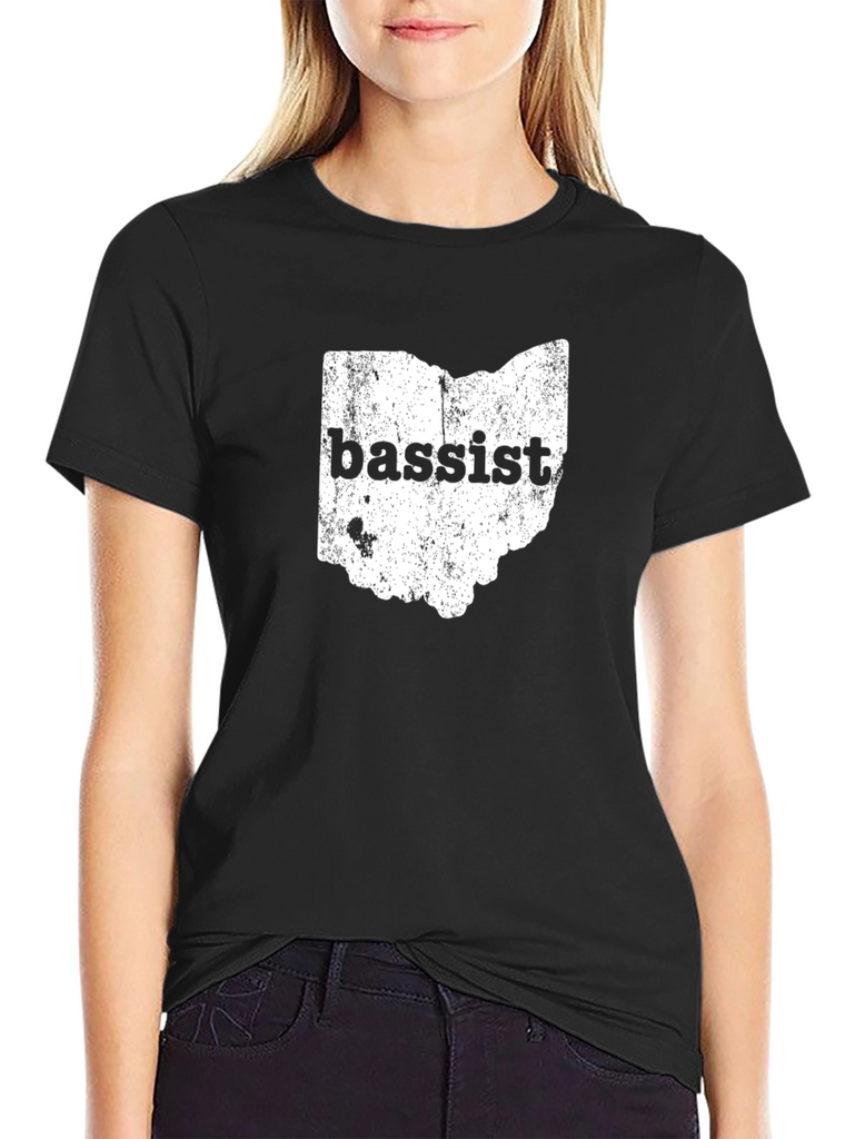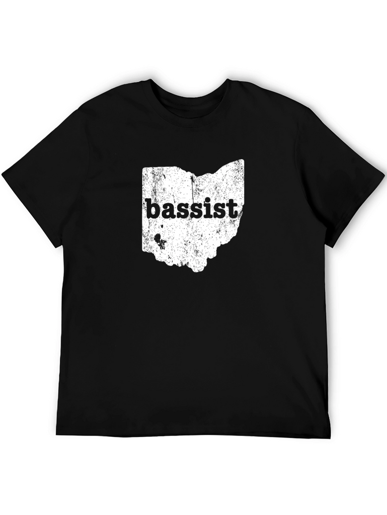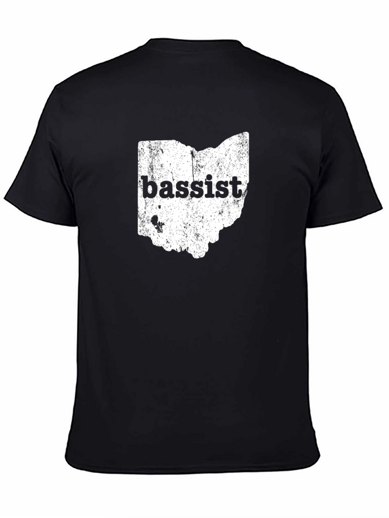 Show your love for music and the Buckeye State with this unique black graphic tee. The shirt features a distressed print of the Ohio state outline, filled with a texture. Boldly printed across the state is the word "bassist", making it a perfect gift for musicians or Ohio residents. The classic crew neck and short sleeves make it ideal for casual wear, concerts, or everyday outings. Made with soft, breathable fabric for all-day comfort. Wear your passion for music and Ohio with pride!