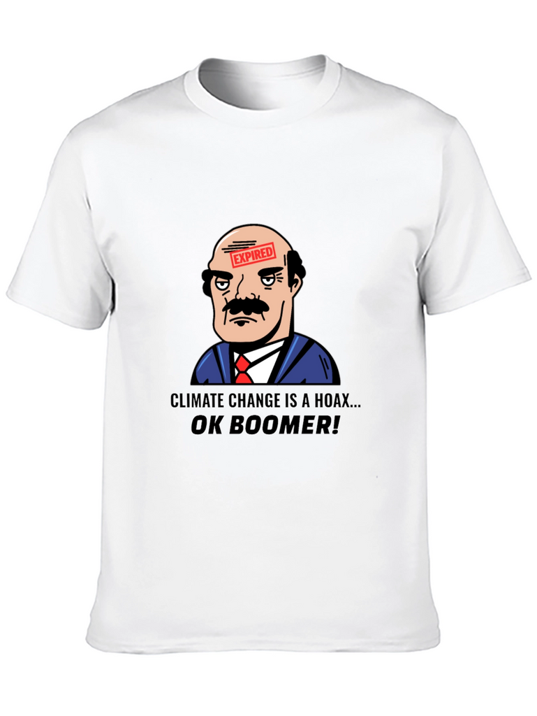 This black t-shirt features a unique graphic design. The design is a cartoon illustration of a man with an "EXPIRED" stamp on his forehead. Below the image, the text reads "CLIMATE CHANGE IS A HOAX...OK BOOMER!". The shirt appears to be made of a soft, comfortable fabric, suitable for everyday wear. This statement tee is a perfect conversation starter and expresses a bold opinion with humor. Ideal for casual outings, social events, or as a gift for those who appreciate politically charged statements.