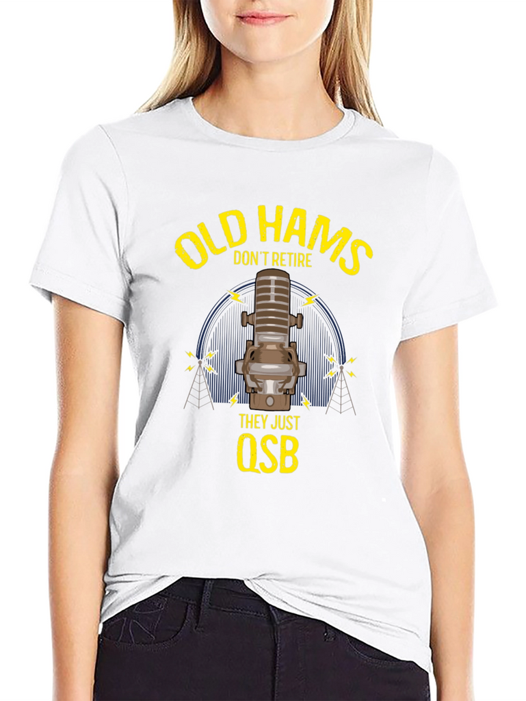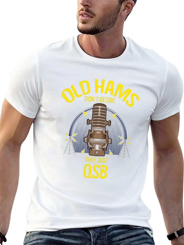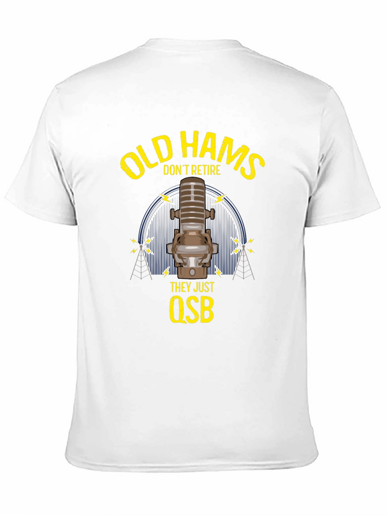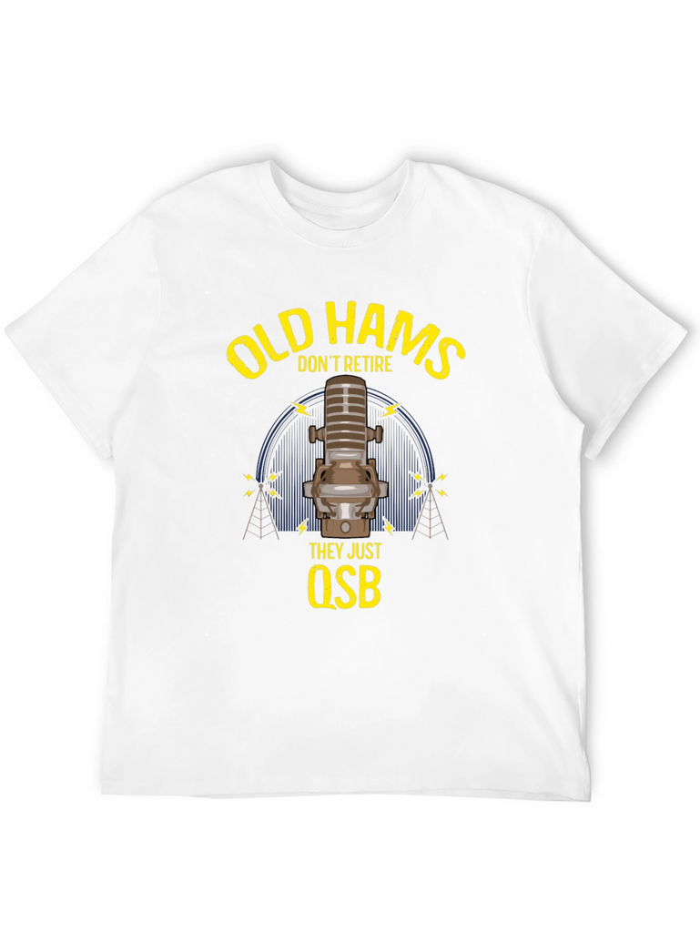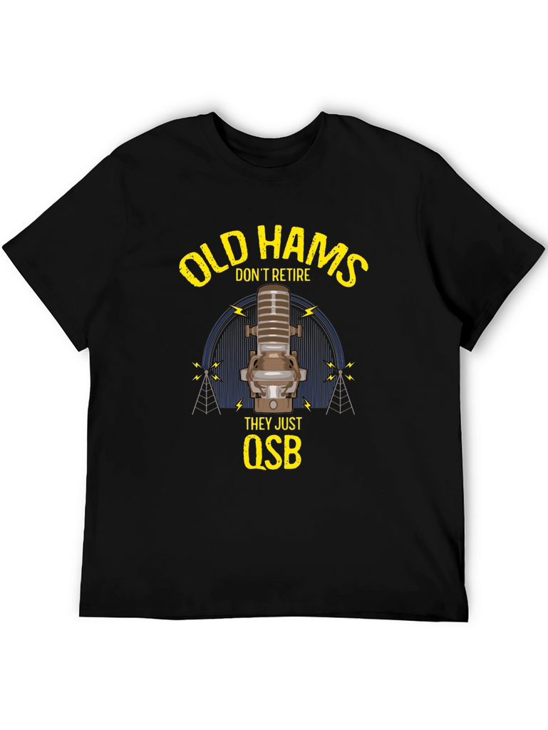 This black t-shirt features a humorous design for amateur radio enthusiasts. The words "OLD HAMS DON'T RETIRE" arc above a vintage microphone graphic, while "THEY JUST QSB" is printed below. The design is distressed yellow and printed on a dark, comfortable fabric. Perfect for wearing to ham radio club meetings, field day events, or just around town to show off your hobby! This tee makes a great gift for the seasoned radio operator in your life, a fun and unique way to celebrate their passion for amateur radio.