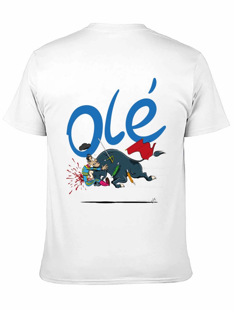 Embrace the drama with this unique black t-shirt featuring a vibrant cartoon illustration of a bullfight scene. The design showcases a matador in a comical predicament, complete with theatrical blood splatter, a sword-wielding bull, and a waving red cape. The word "Olé" is emblazoned above the action in a playful blue font. Crafted from what appears to be a soft and comfortable fabric, this tee offers both style and comfort for casual wear. Perfect for those who appreciate quirky, eye-catching graphic designs and a touch of irreverent humor, this t-shirt is sure to spark conversations and turn heads.