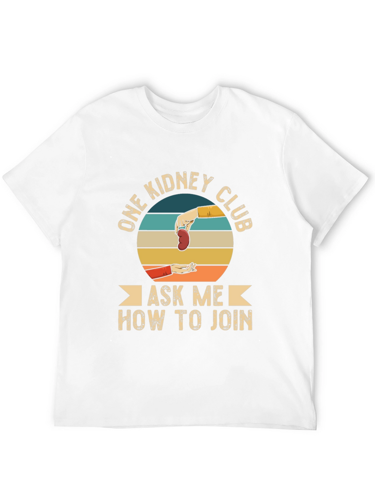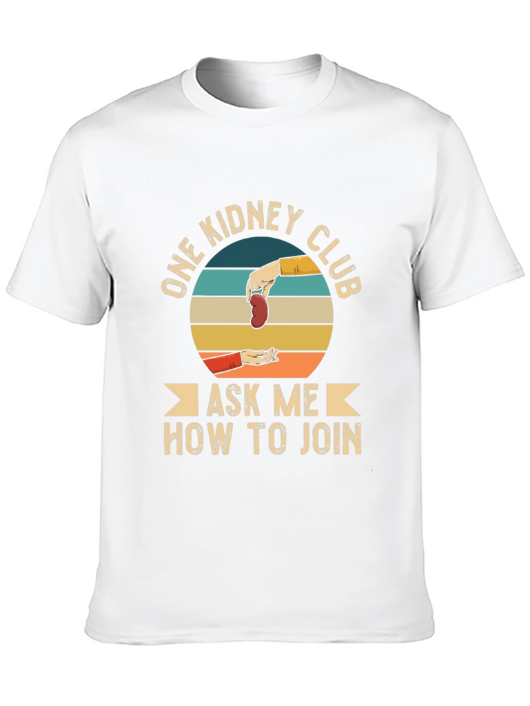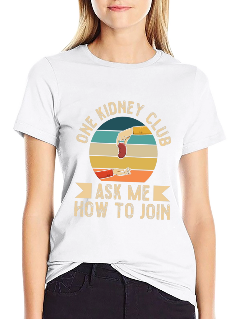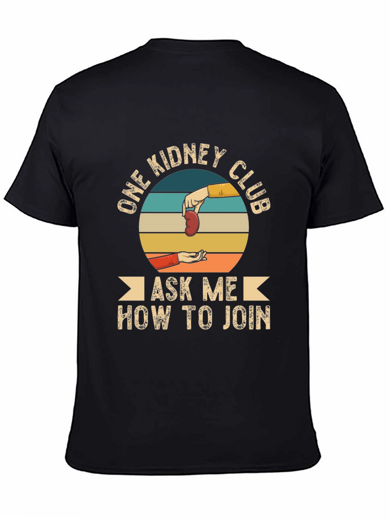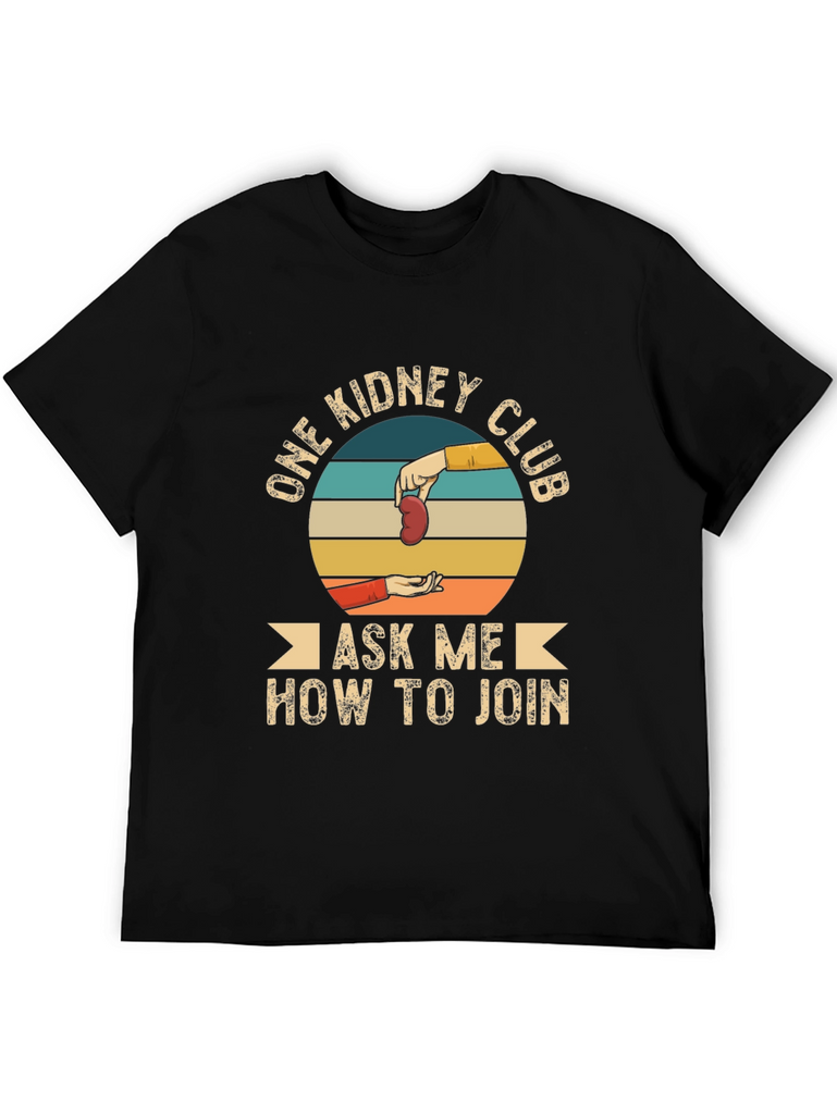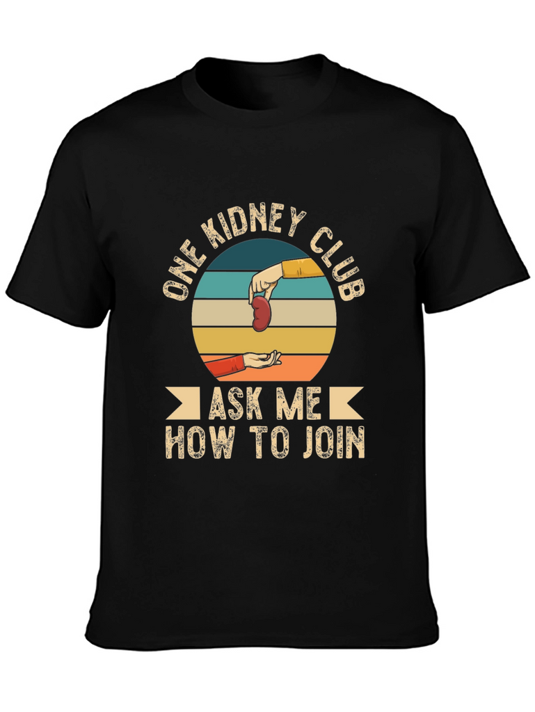 Show off your sense of humor with this unique "One Kidney Club" t-shirt! The design features retro-inspired horizontal stripes in a circular pattern, with graphics of hands exchanging a kidney. Bold text reads "ASK ME HOW TO JOIN" below. Perfect for kidney donors or transplant recipients, this shirt is a great conversation starter. The black shirt is made from a comfortable fabric, ideal for everyday wear. It's a lighthearted way to raise awareness and show pride in your journey. Wear it to support groups, medical appointments, or just around town. A fantastic gift for those who appreciate a touch of humor.