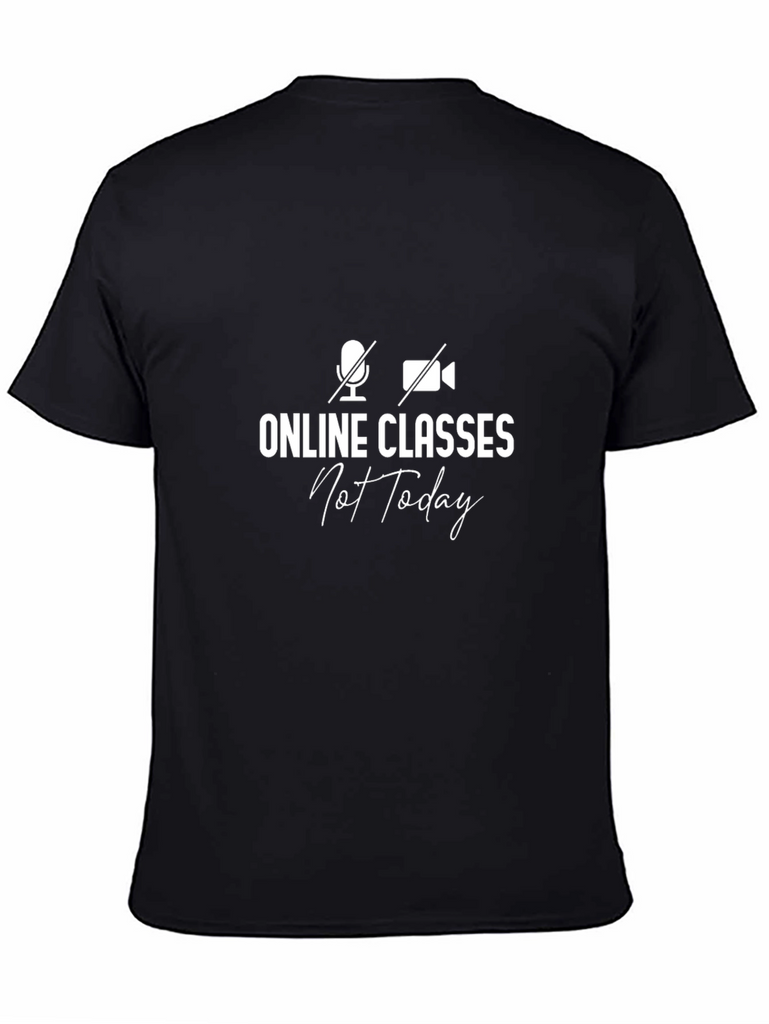 This stylish black t-shirt features a humorous graphic that's perfect for students and remote workers alike. The design includes crossed-out microphone and video camera icons above the phrase "ONLINE CLASSES Not Today," playfully suggesting a day off from virtual meetings and lectures. Made from a comfortable-looking fabric, this tee is ideal for casual wear, lounging at home, or making a statement. Whether you're taking a break from online commitments or just want to express your feelings about virtual learning, this shirt is a fun and relatable choice. Wear it to class, around the house, or out with friends for a relaxed and witty vibe.