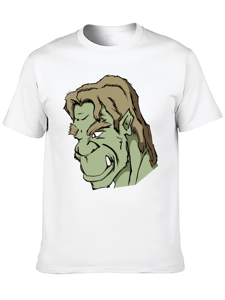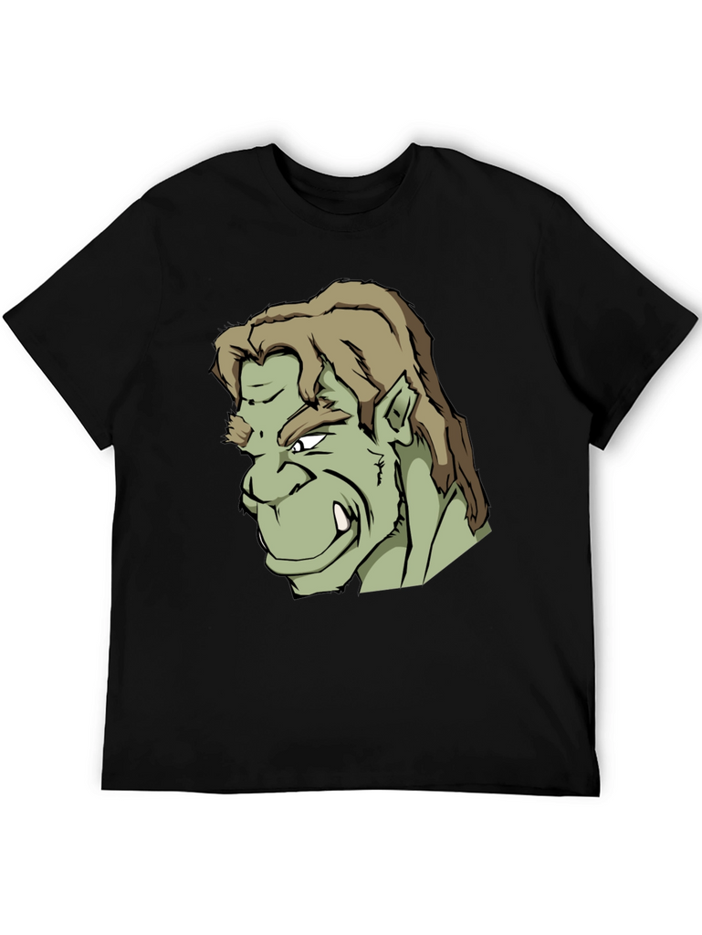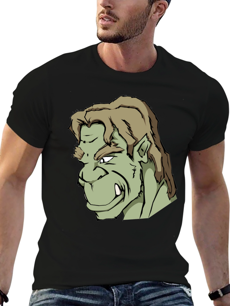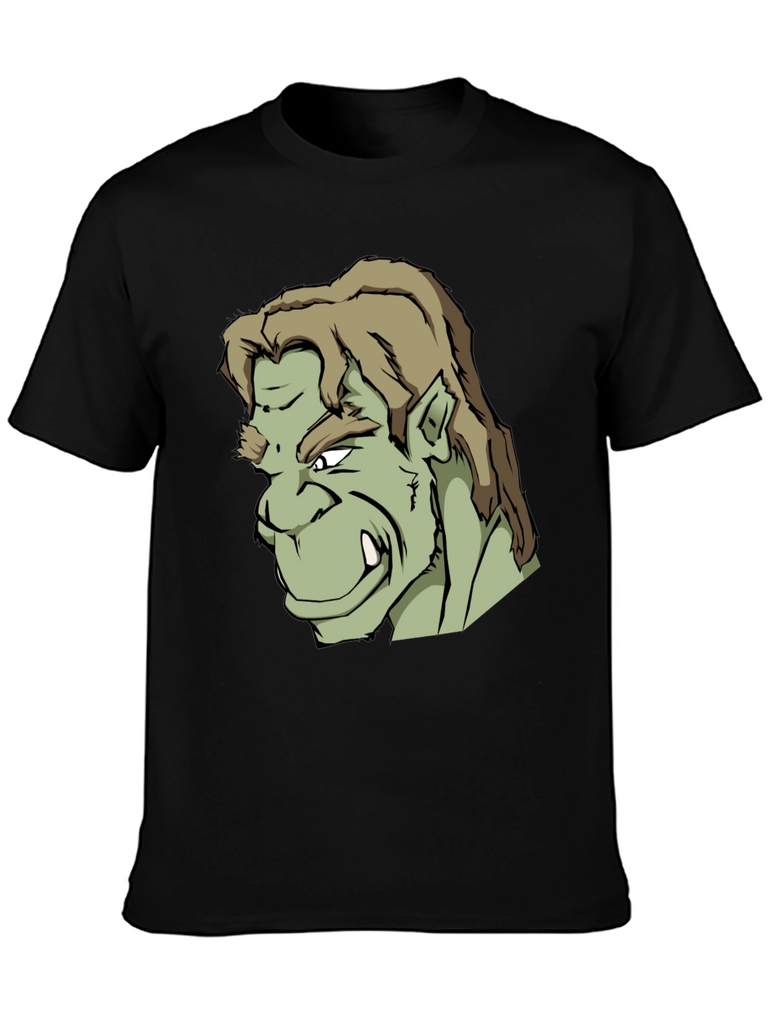 Showcase your unique style with this bold black t-shirt featuring a striking graphic print of an orc-like character. The design is detailed with sharp lines, contrasting shades of green, and a fierce expression. Made from what appears to be a soft, comfortable cotton blend, this tee offers both style and all-day wearability. Perfect for casual outings, gaming sessions, or expressing your love for fantasy characters. Stand out from the crowd and make a statement with this standout graphic tee.