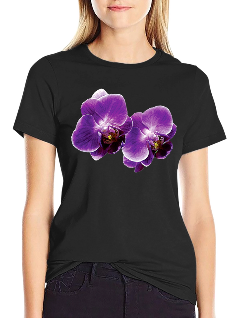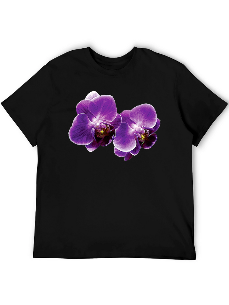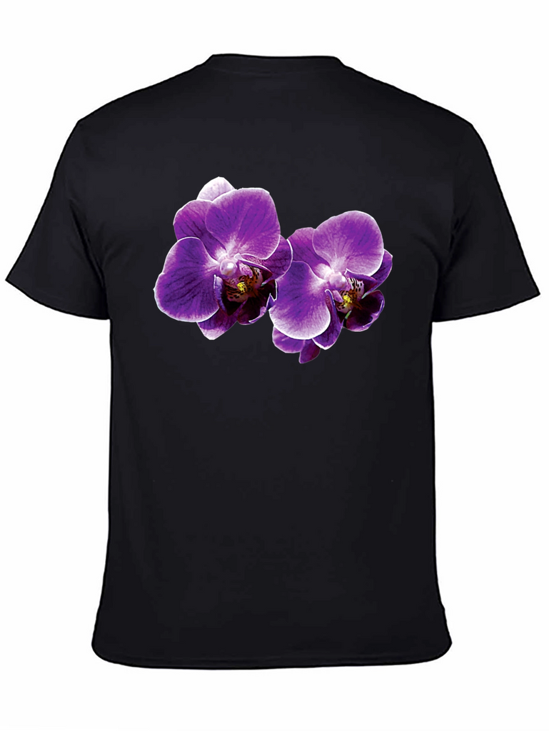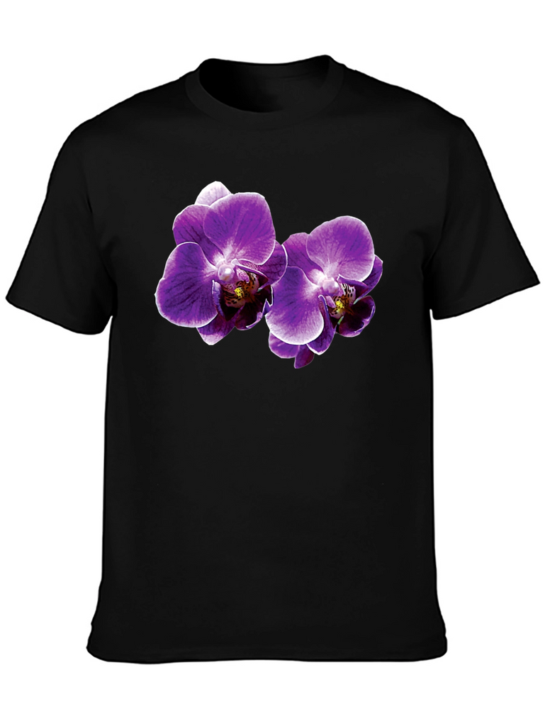 This classic black t-shirt features a vibrant graphic print of two purple orchid blossoms. The design showcases the intricate details of the flowers, from the delicate petals to the rich colors. Made from what appears to be a soft and comfortable cotton blend, this tee offers a relaxed fit for everyday wear. Its simple yet stylish design makes it a versatile addition to any wardrobe, easily paired with jeans, shorts, or a casual jacket. Whether you're a flower enthusiast or simply appreciate eye-catching apparel, this orchid blossom t-shirt will add a touch of natural beauty to your look. Perfect for casual outings, weekend adventures, or simply lounging at home.
