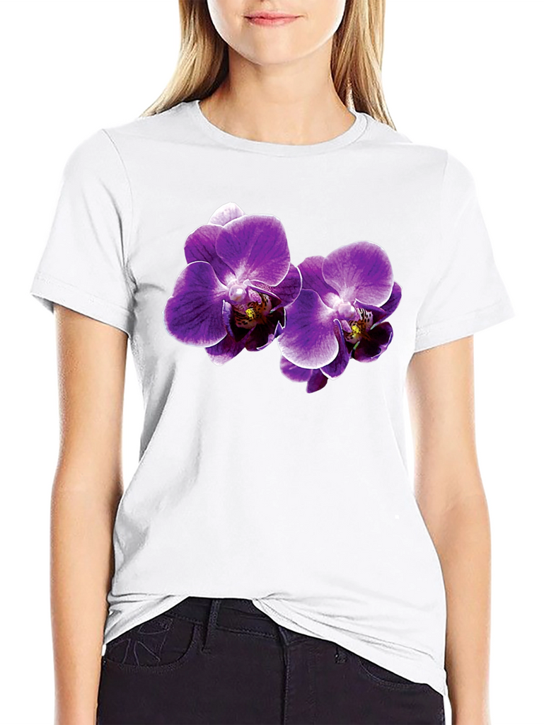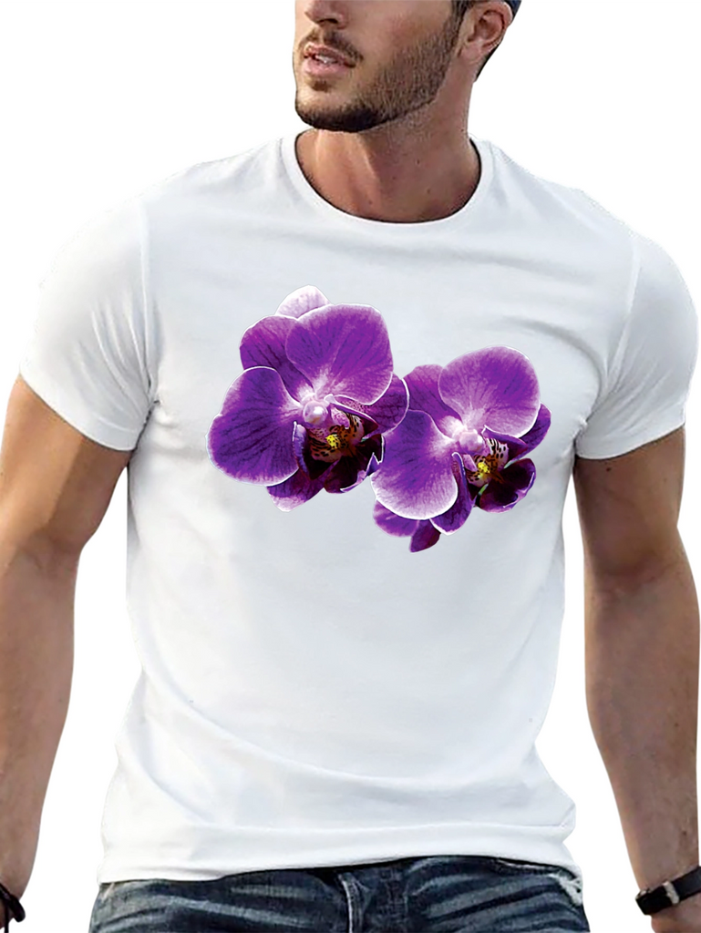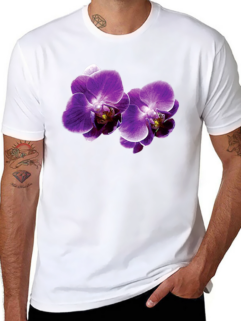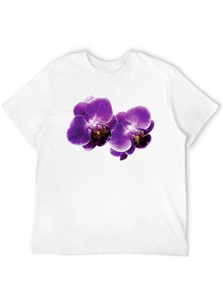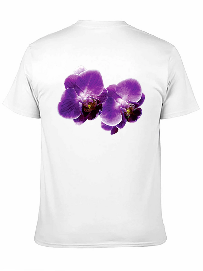 This classic black t-shirt features a vibrant graphic print of two purple orchid blossoms. The design showcases the intricate details of the flowers, from the delicate petals to the rich colors. Made from what appears to be a soft and comfortable cotton blend, this tee offers a relaxed fit for everyday wear. Its simple yet stylish design makes it a versatile addition to any wardrobe, easily paired with jeans, shorts, or a casual jacket. Whether you're a flower enthusiast or simply appreciate eye-catching apparel, this orchid blossom t-shirt will add a touch of natural beauty to your look. Perfect for casual outings, weekend adventures, or simply lounging at home.