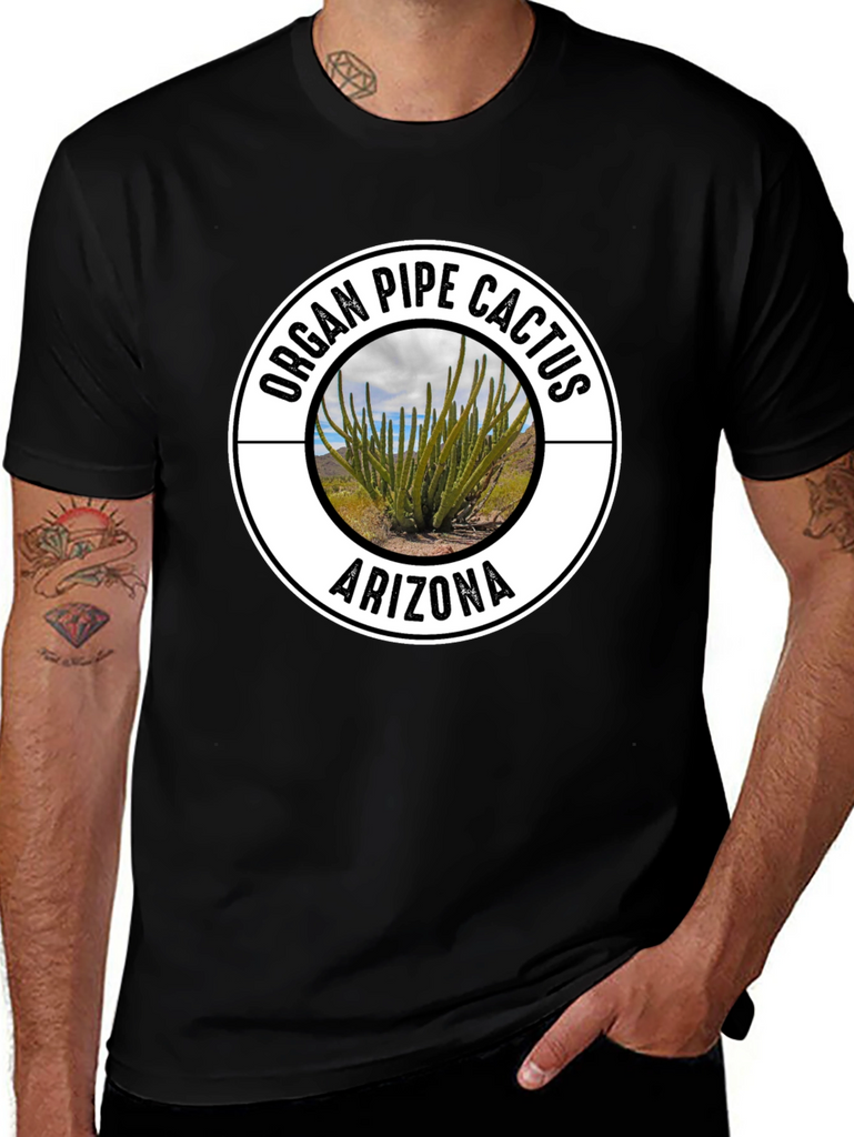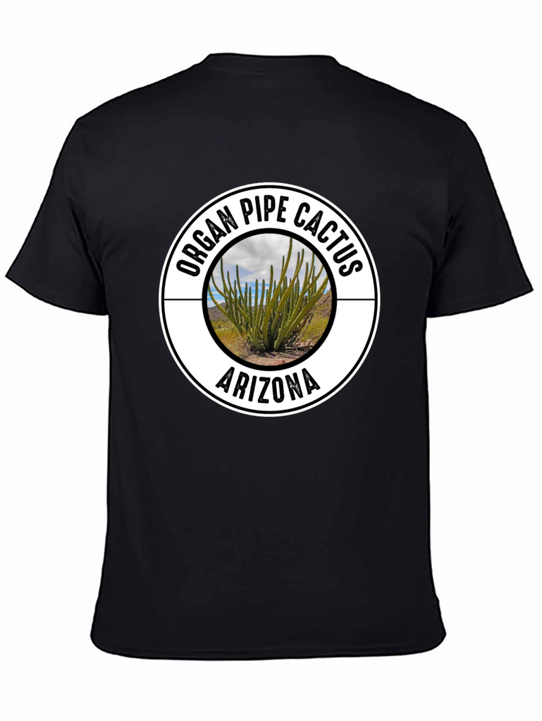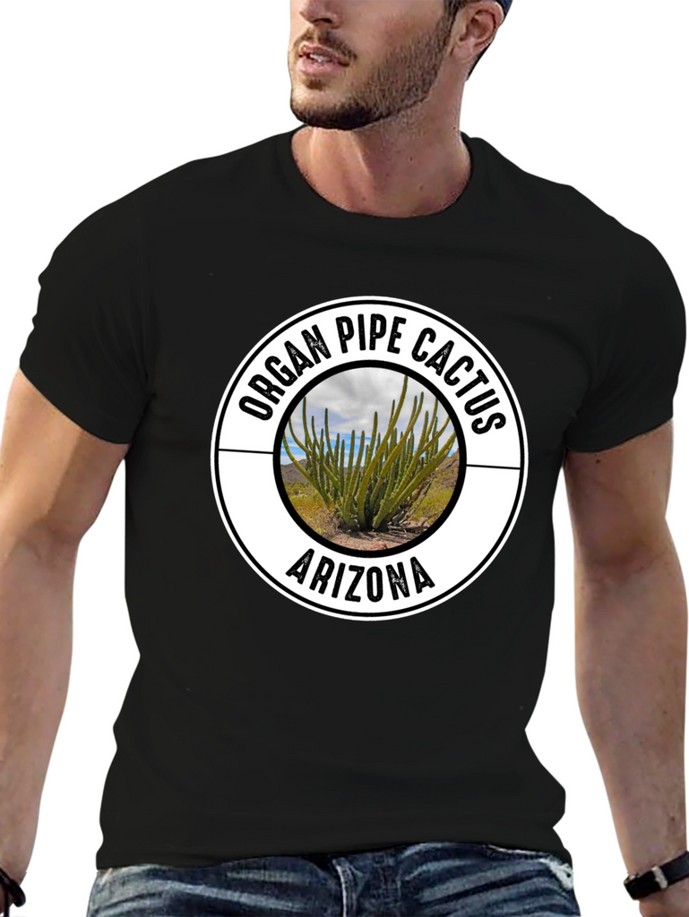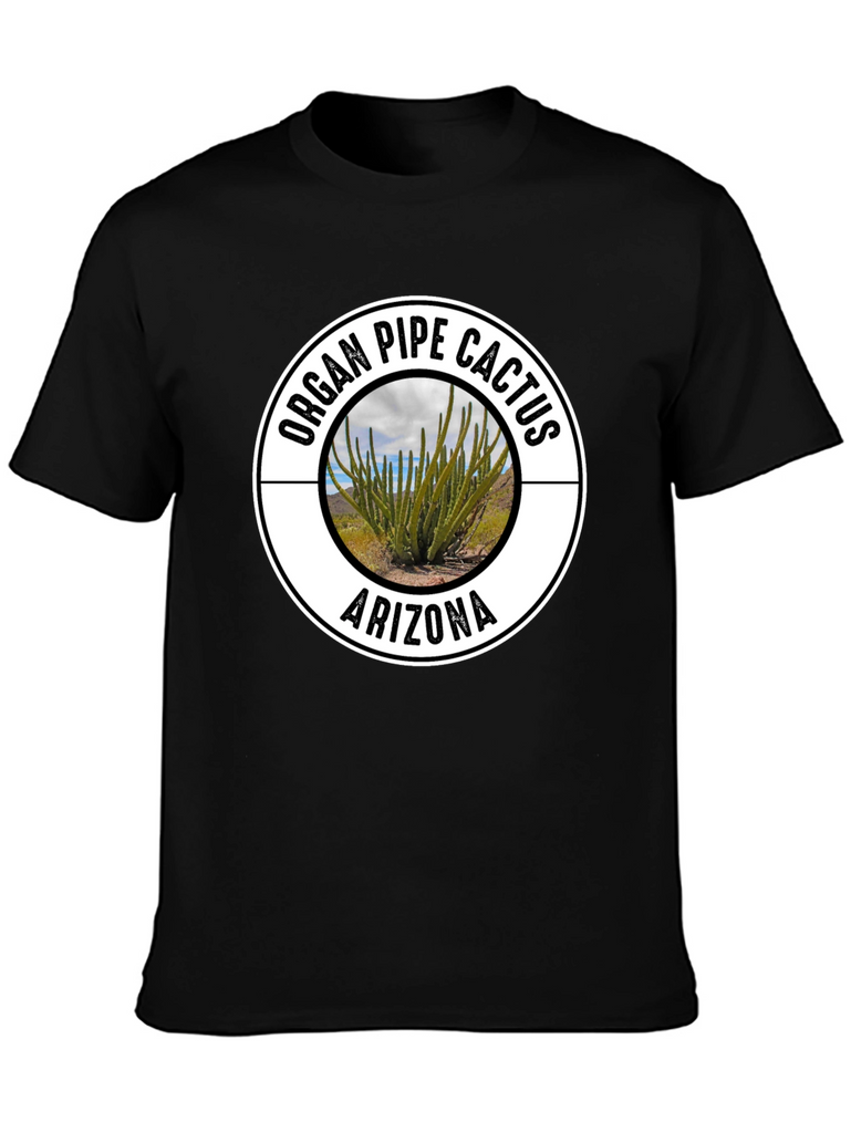 Showcase your love for the Arizona desert with this unique black t-shirt. The design features a bold, circular graphic of an Organ Pipe Cactus against a desert landscape, encircled by the words "Organ Pipe Cactus" and "Arizona". The crisp, clean design is printed on a classic black tee, making it a versatile addition to any wardrobe. Made from comfortable, breathable fabric, this t-shirt is perfect for casual outings, hiking adventures, or simply relaxing at home. The eye-catching design is sure to spark conversations and makes a great gift for nature lovers, Arizona enthusiasts, and anyone who appreciates unique graphic tees. Add a touch of southwestern style to your everyday look with this stylish and comfortable t-shirt.