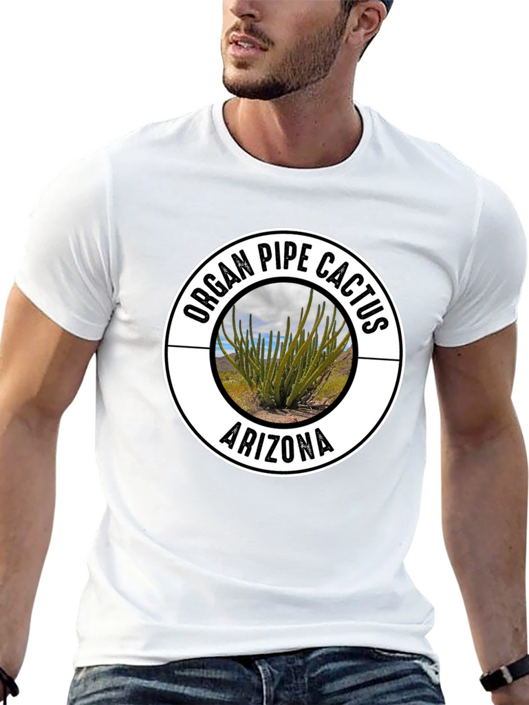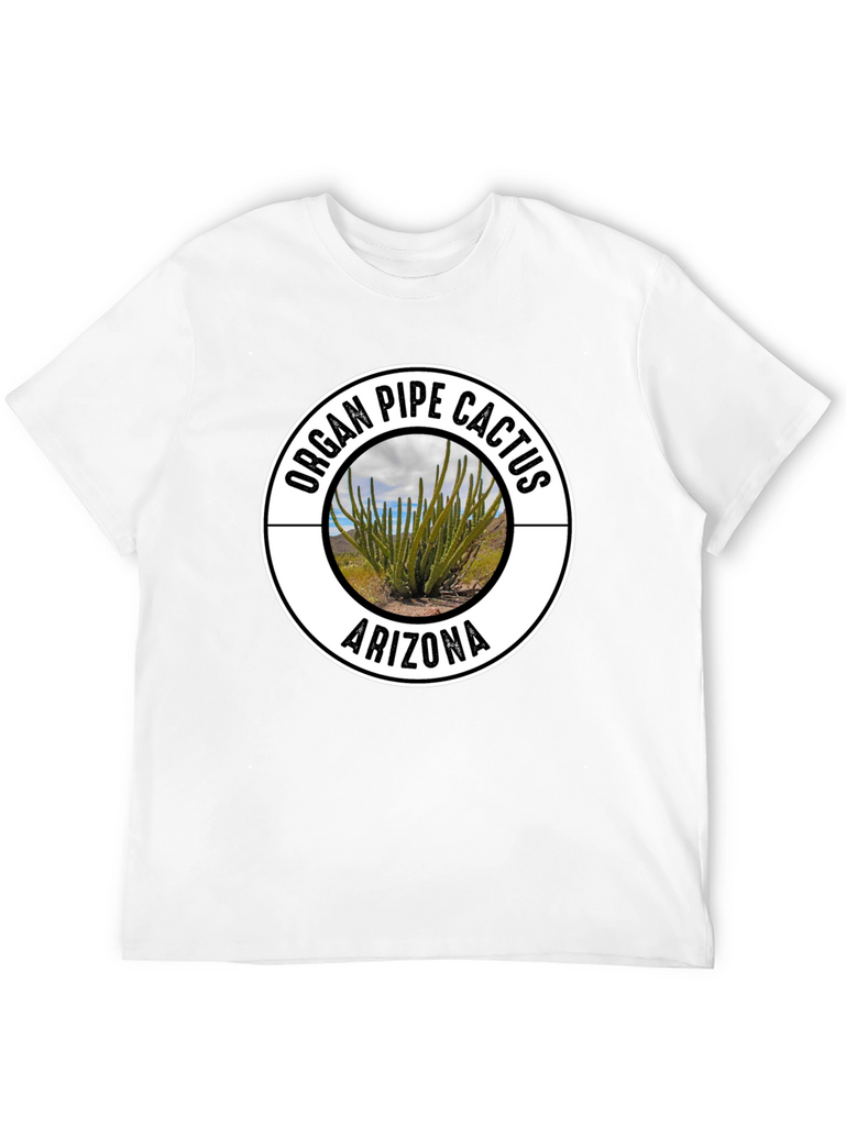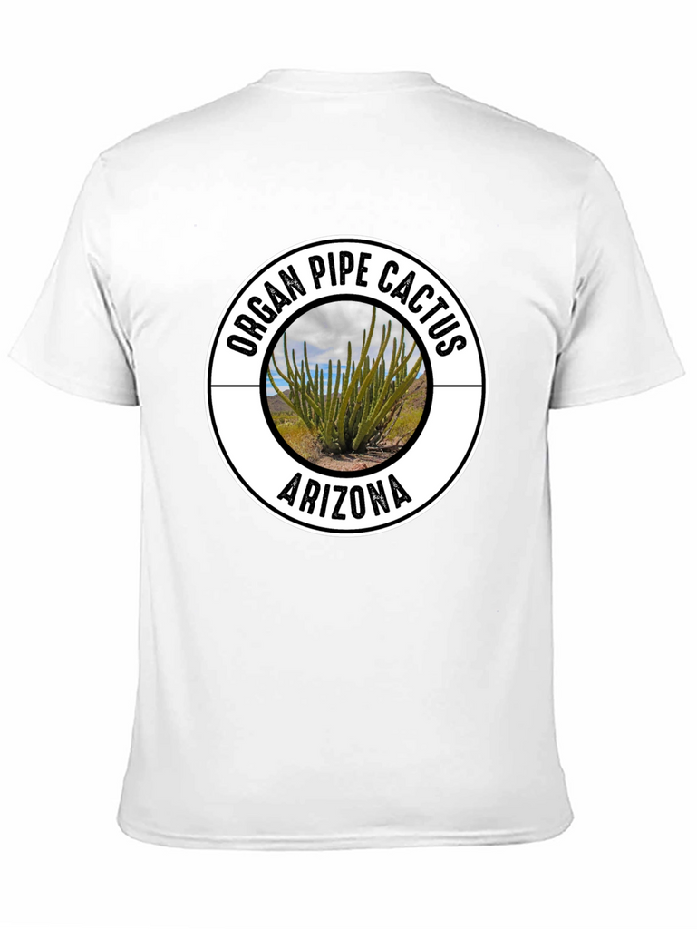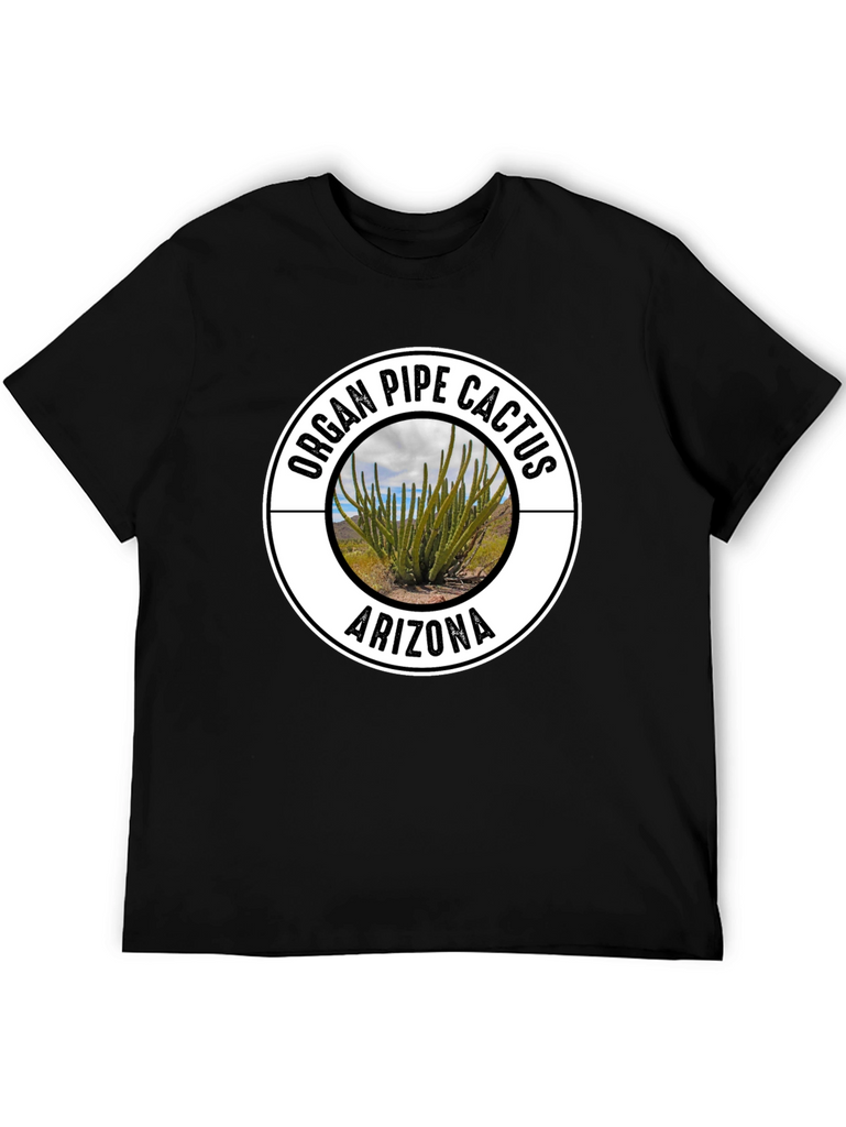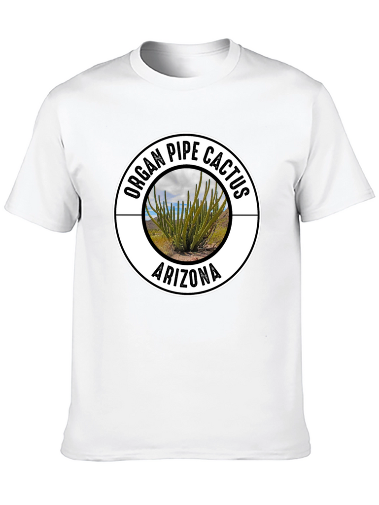 Showcase your love for the Arizona desert with this unique black t-shirt. The design features a bold, circular graphic of an Organ Pipe Cactus against a desert landscape, encircled by the words "Organ Pipe Cactus" and "Arizona". The crisp, clean design is printed on a classic black tee, making it a versatile addition to any wardrobe. Made from comfortable, breathable fabric, this t-shirt is perfect for casual outings, hiking adventures, or simply relaxing at home. The eye-catching design is sure to spark conversations and makes a great gift for nature lovers, Arizona enthusiasts, and anyone who appreciates unique graphic tees. Add a touch of southwestern style to your everyday look with this stylish and comfortable t-shirt.
