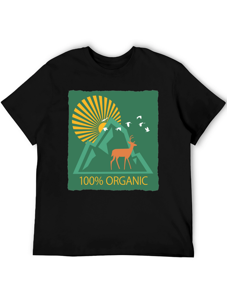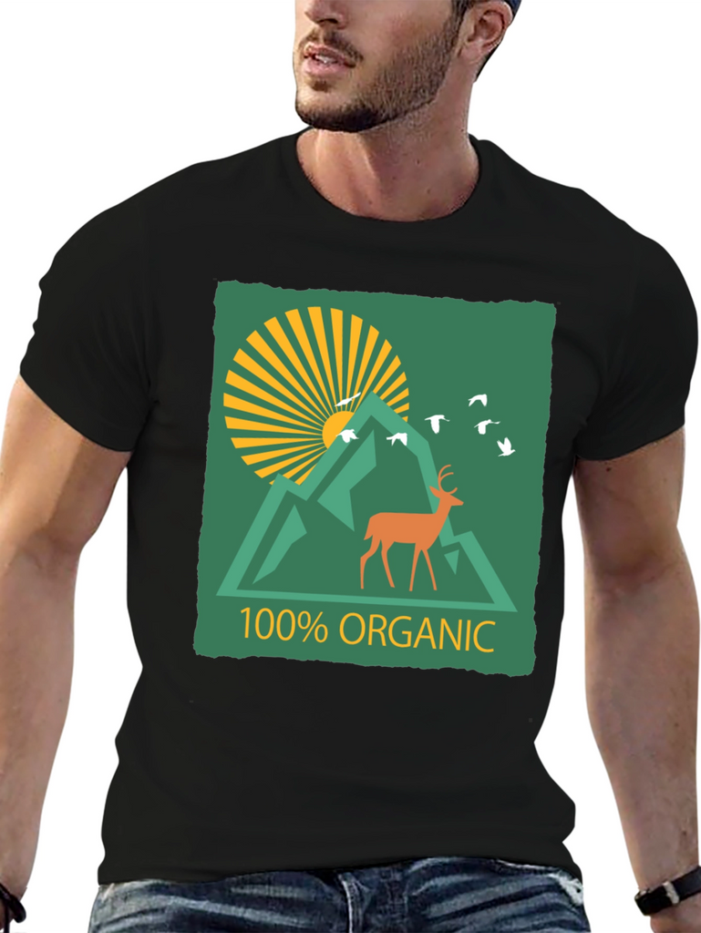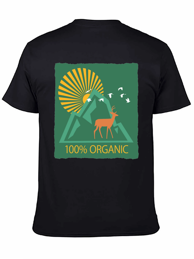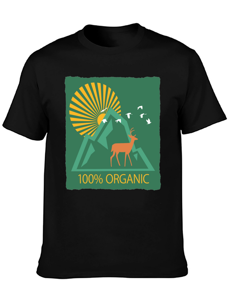Embrace nature with this stylish black tee. It features a unique graphic design showcasing a majestic deer amidst mountains, a rising sun, and soaring birds. The design is framed in a green box that says "100% ORGANIC", emphasizing an eco-friendly appeal. This t-shirt is soft, comfortable, and ideal for everyday wear or outdoor adventures. Its distinct design makes it perfect for nature lovers and those who appreciate sustainable fashion. This tee will make a statement while staying true to nature.