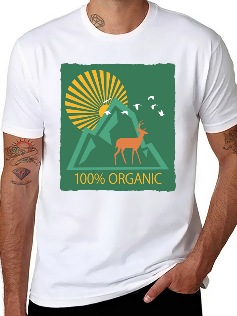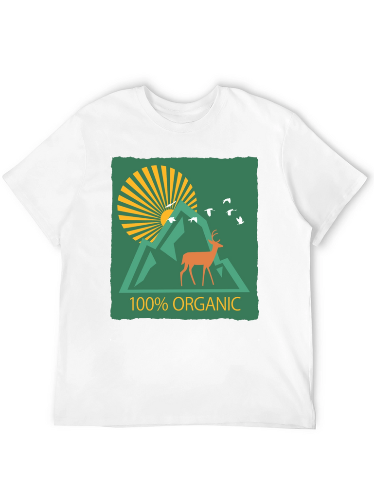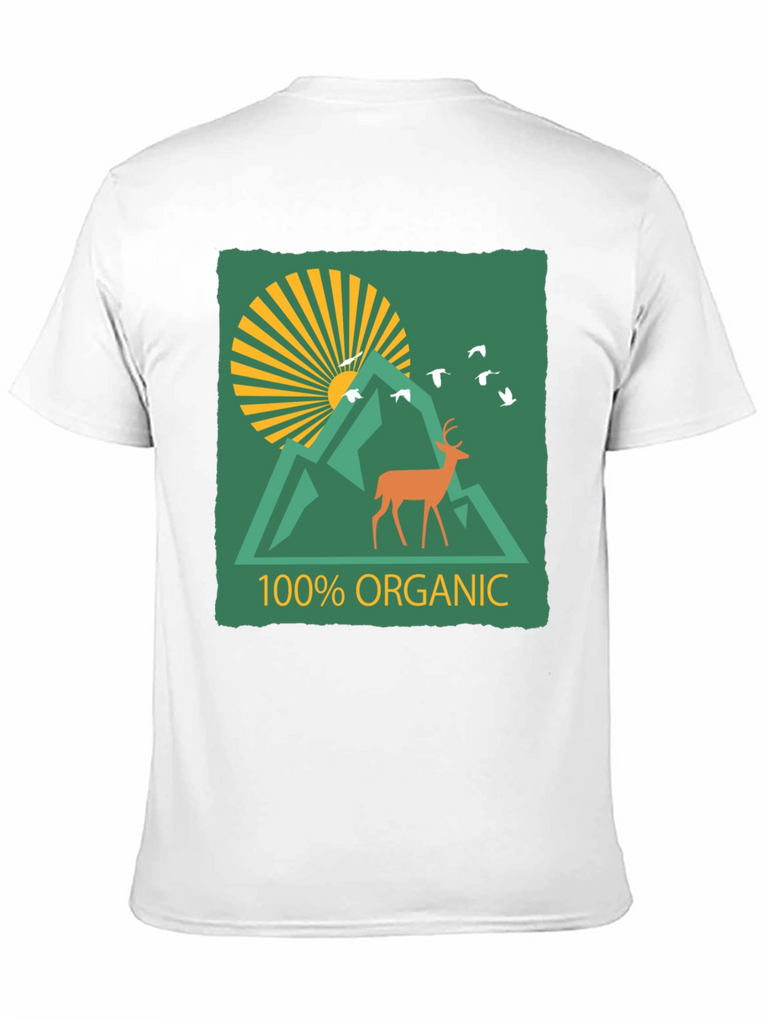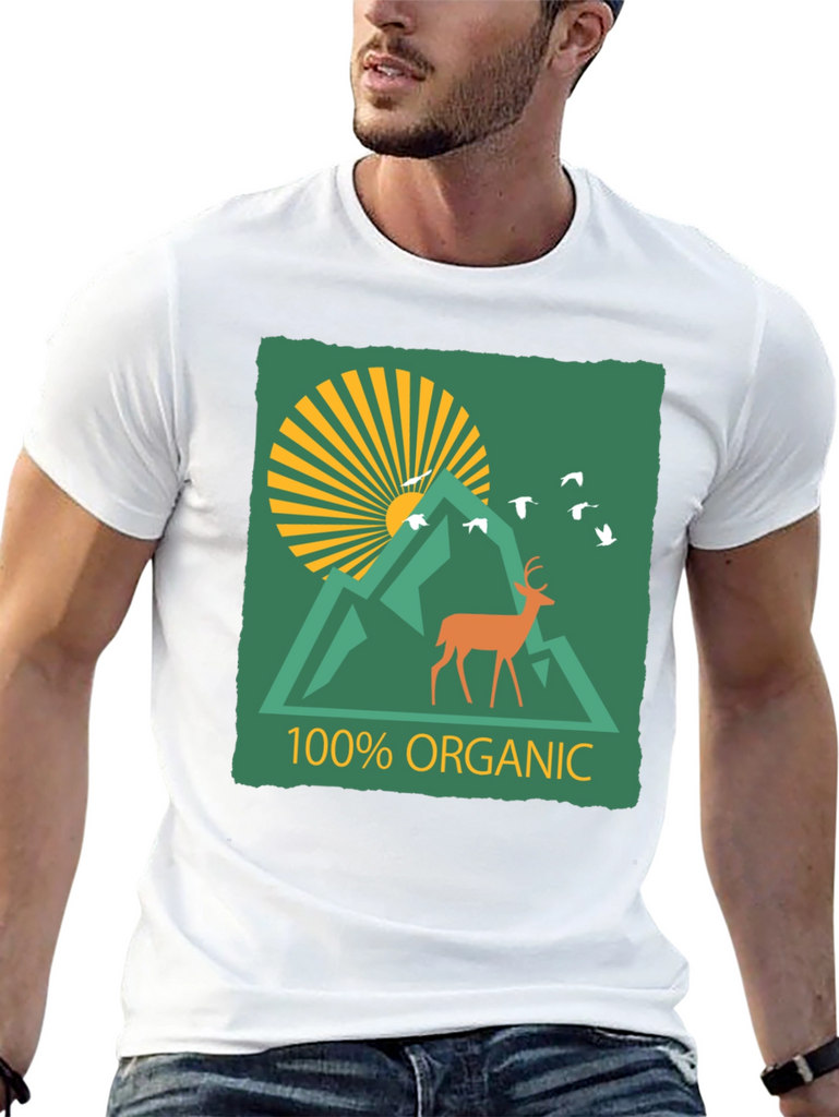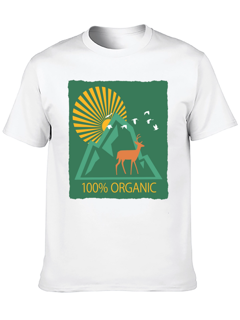 Embrace nature with this stylish black tee. It features a unique graphic design showcasing a majestic deer amidst mountains, a rising sun, and soaring birds. The design is framed in a green box that says "100% ORGANIC", emphasizing an eco-friendly appeal. This t-shirt is soft, comfortable, and ideal for everyday wear or outdoor adventures. Its distinct design makes it perfect for nature lovers and those who appreciate sustainable fashion. This tee will make a statement while staying true to nature.