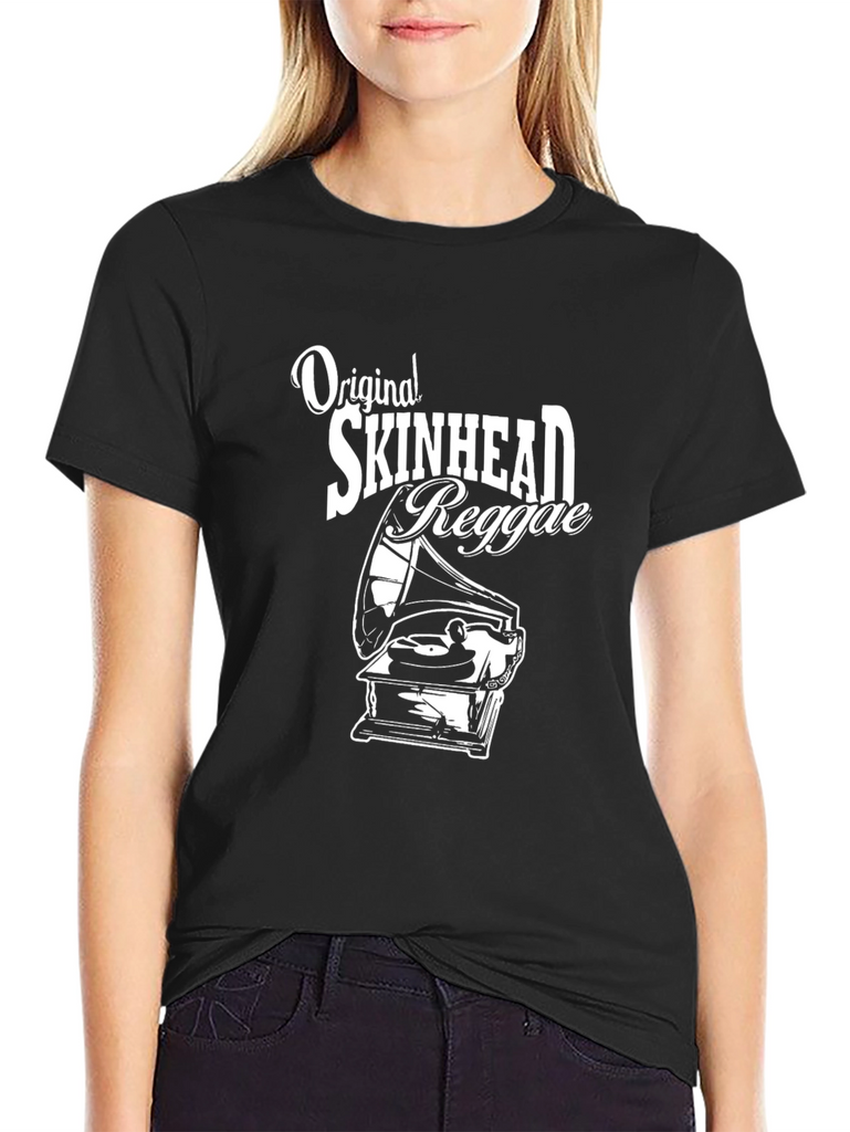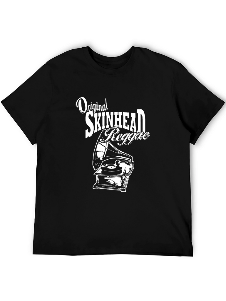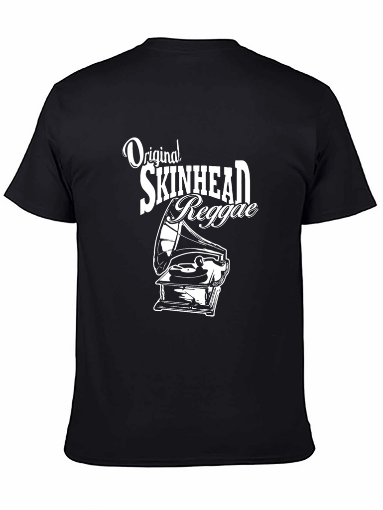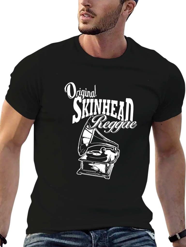 Show off your love for classic reggae with this stylish black T-shirt. Featuring a vintage-inspired graphic of an old-fashioned phonograph alongside the words "Original Skinhead Reggae," this shirt is perfect for music lovers and fans of retro style. The design is printed in white for maximum contrast on the black cotton material. This short sleeved, crew neck tee is ideal for casual wear, concerts, or showcasing your unique music taste. It's comfortable, eye-catching, and sure to spark conversation.