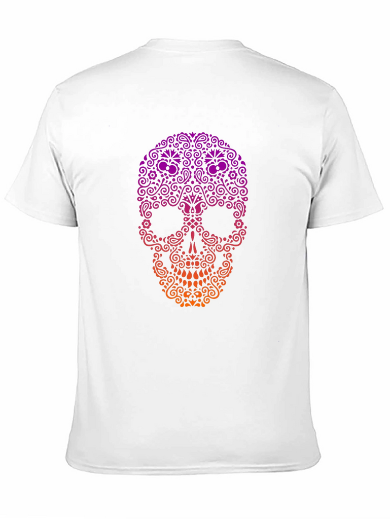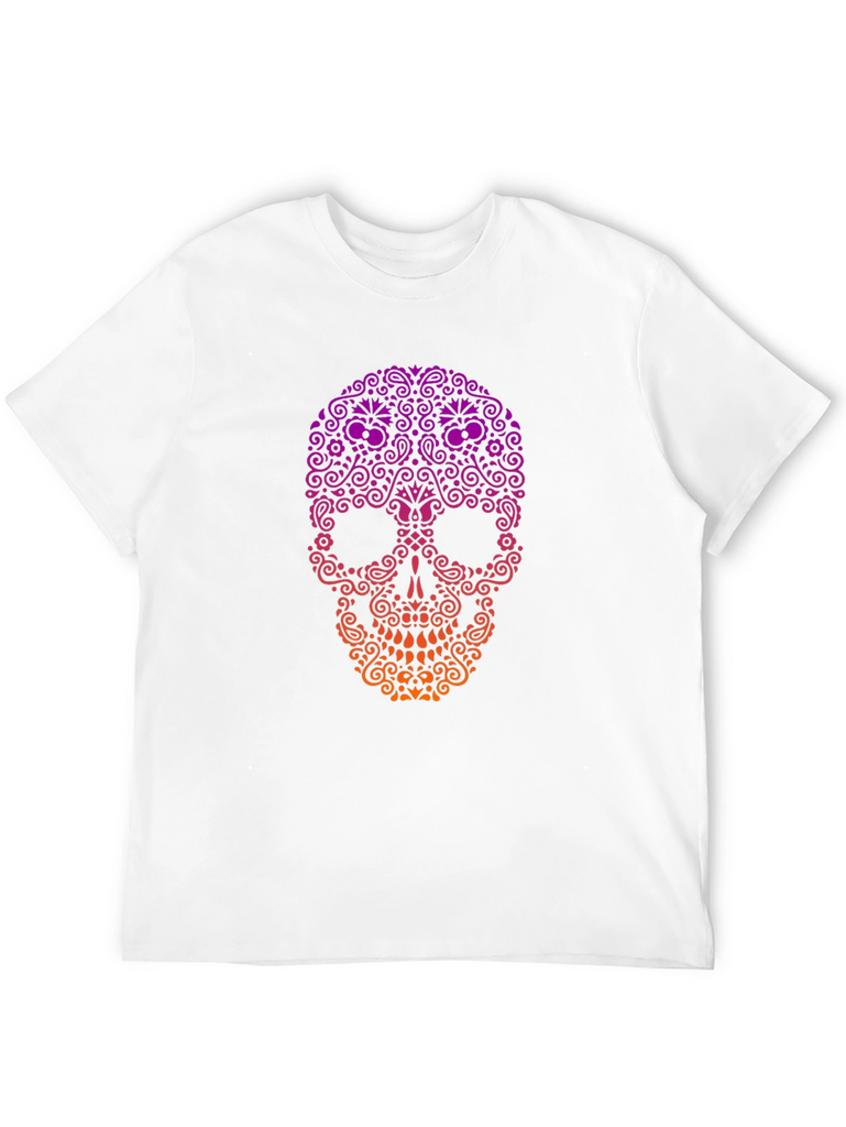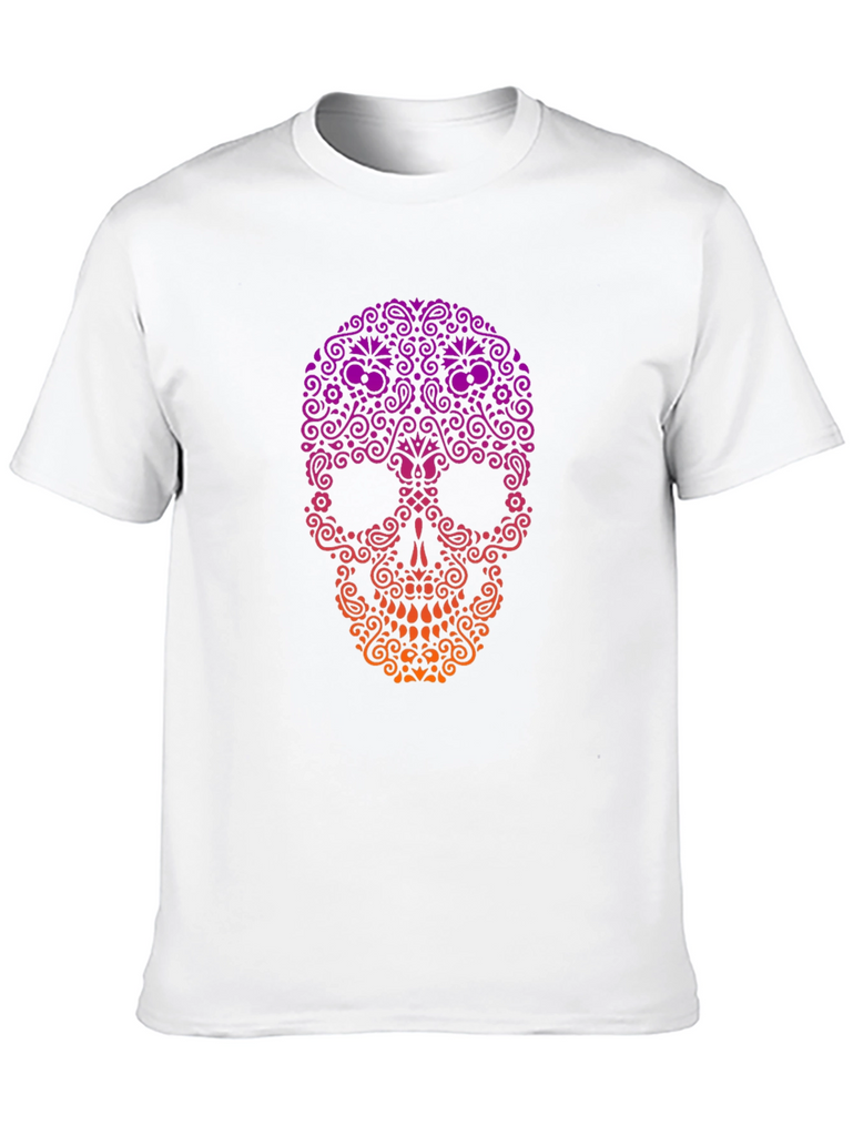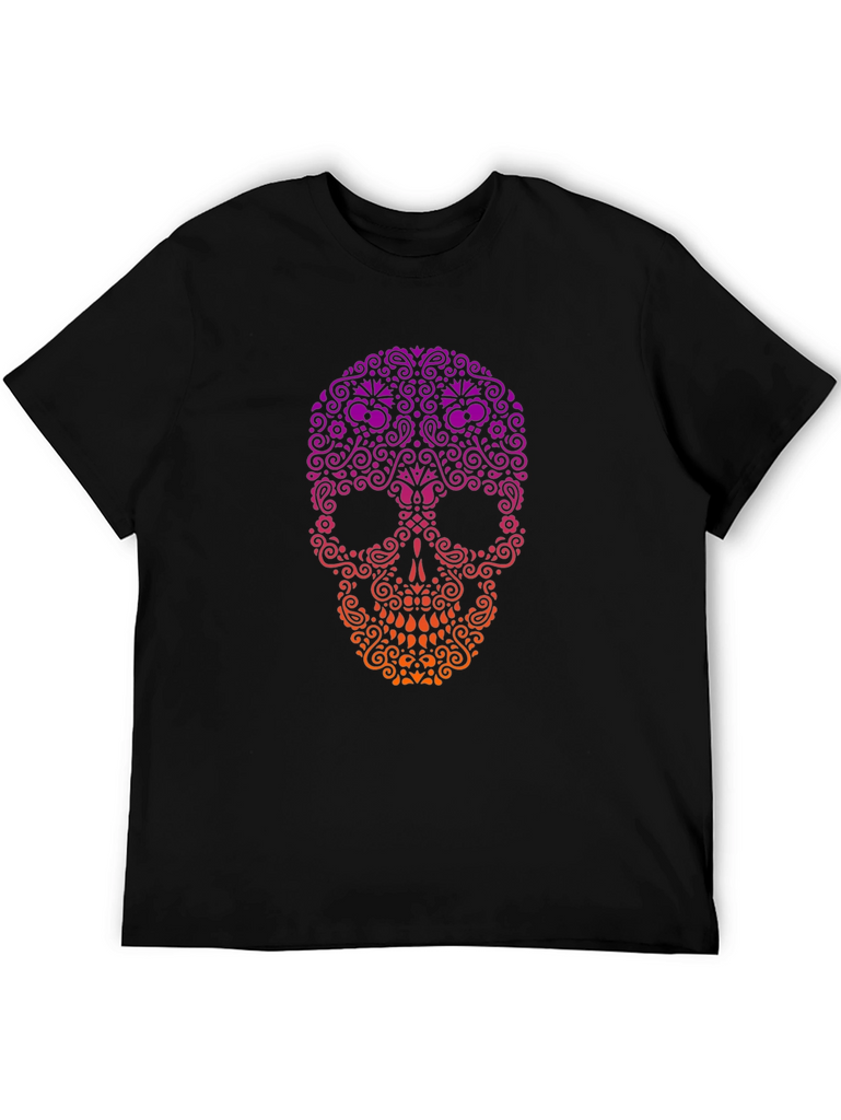 Showcase your unique style with this eye-catching black t-shirt. Featuring a vibrant, ornamental skull graphic that fades from deep purple to bright orange. Made from soft, comfortable cotton, this classic fit tee is perfect for casual wear, concerts, or making a statement. Stand out from the crowd with this cool and artistic tee. Machine washable for easy care. Ideal for anyone who appreciates bold designs and comfortable fashion.