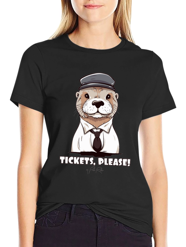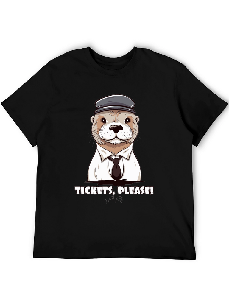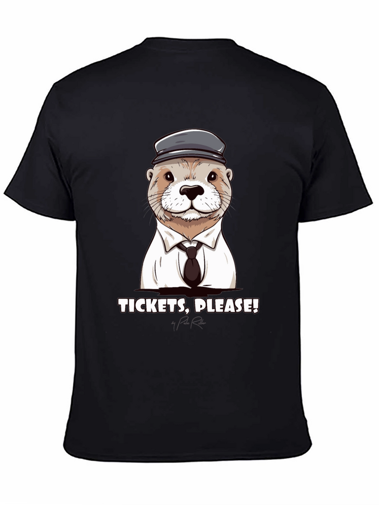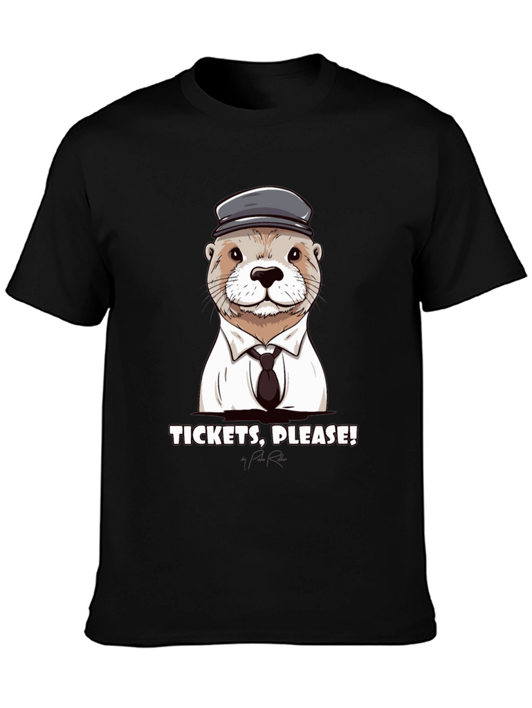 This unique black T-shirt features a charming illustration of an otter dressed as a train conductor. The otter is wearing a conductor's hat and a white shirt with a black tie, giving it a sophisticated yet playful look. Below the otter is the phrase "TICKETS, PLEASE!" in bold, white lettering. Made from comfortable, breathable fabric, this T-shirt is perfect for casual wear, otter enthusiasts, or anyone who appreciates quirky and original designs. It's a fun conversation starter and a great way to express your unique style. Ideal for everyday wear, casual outings, or as a gift for animal lovers.