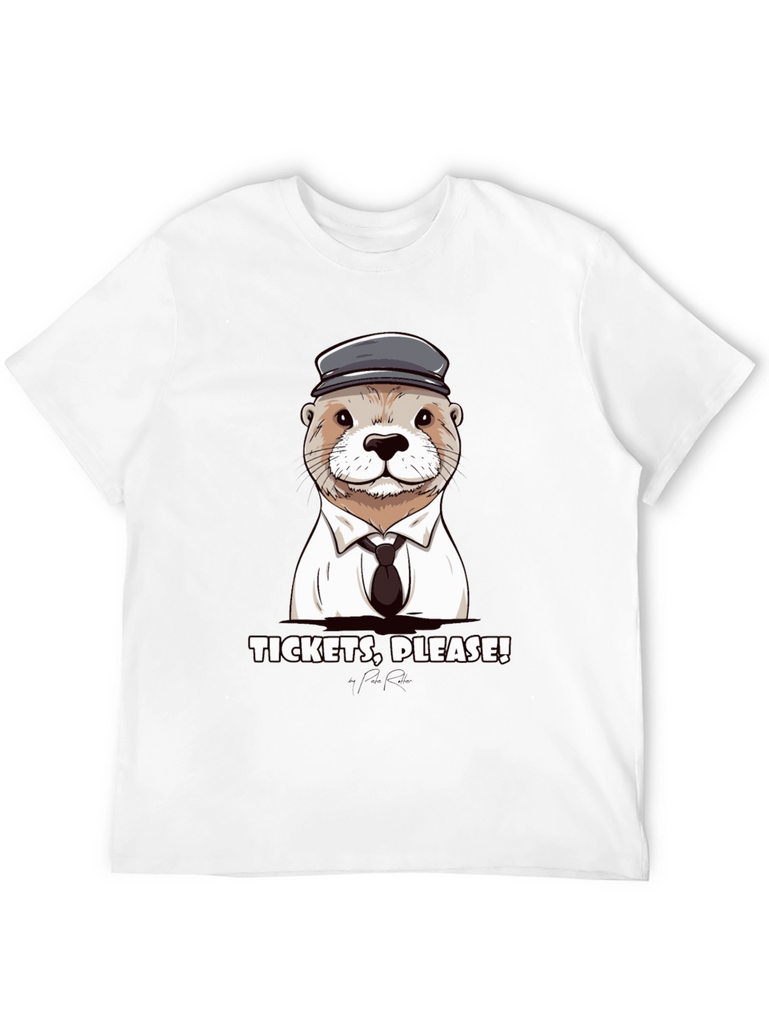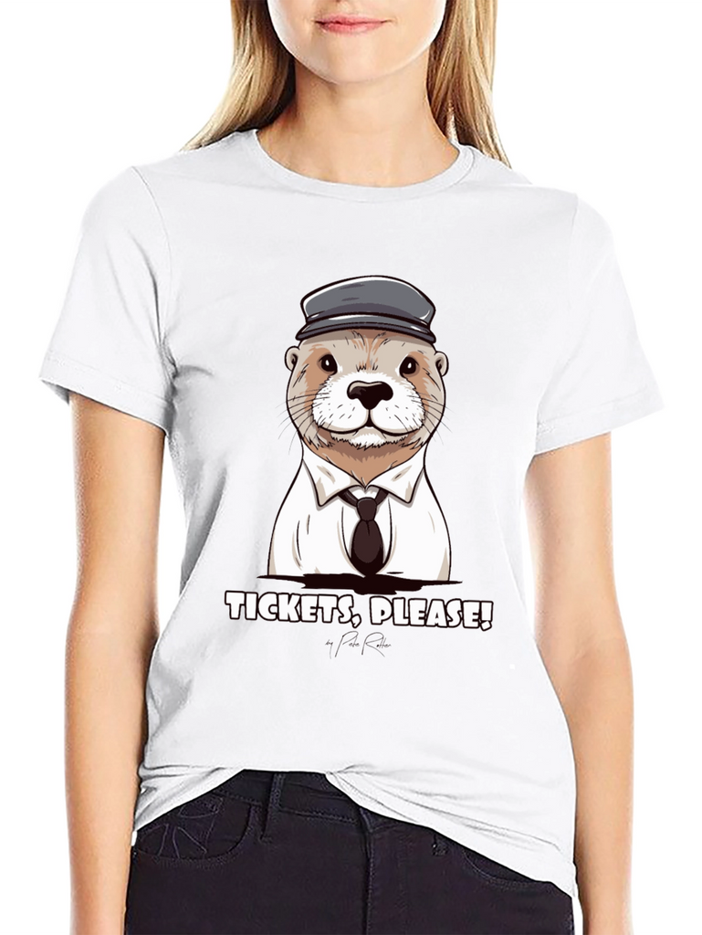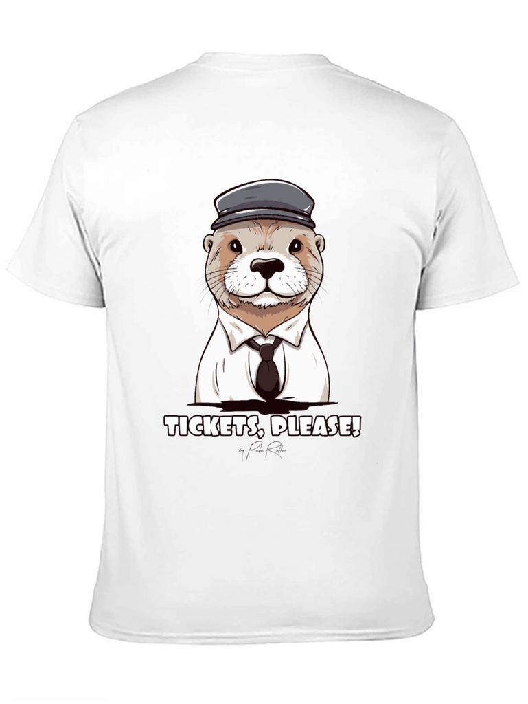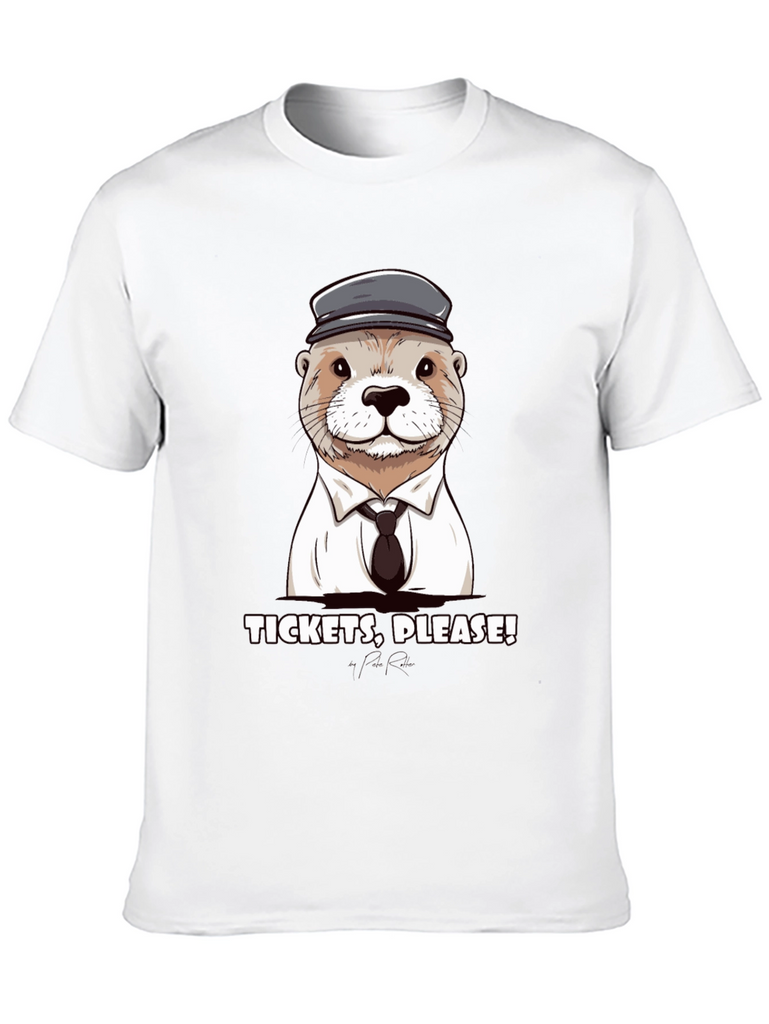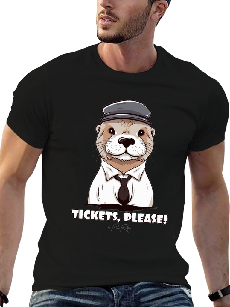 This unique black T-shirt features a charming illustration of an otter dressed as a train conductor. The otter is wearing a conductor's hat and a white shirt with a black tie, giving it a sophisticated yet playful look. Below the otter is the phrase "TICKETS, PLEASE!" in bold, white lettering. Made from comfortable, breathable fabric, this T-shirt is perfect for casual wear, otter enthusiasts, or anyone who appreciates quirky and original designs. It's a fun conversation starter and a great way to express your unique style. Ideal for everyday wear, casual outings, or as a gift for animal lovers.
