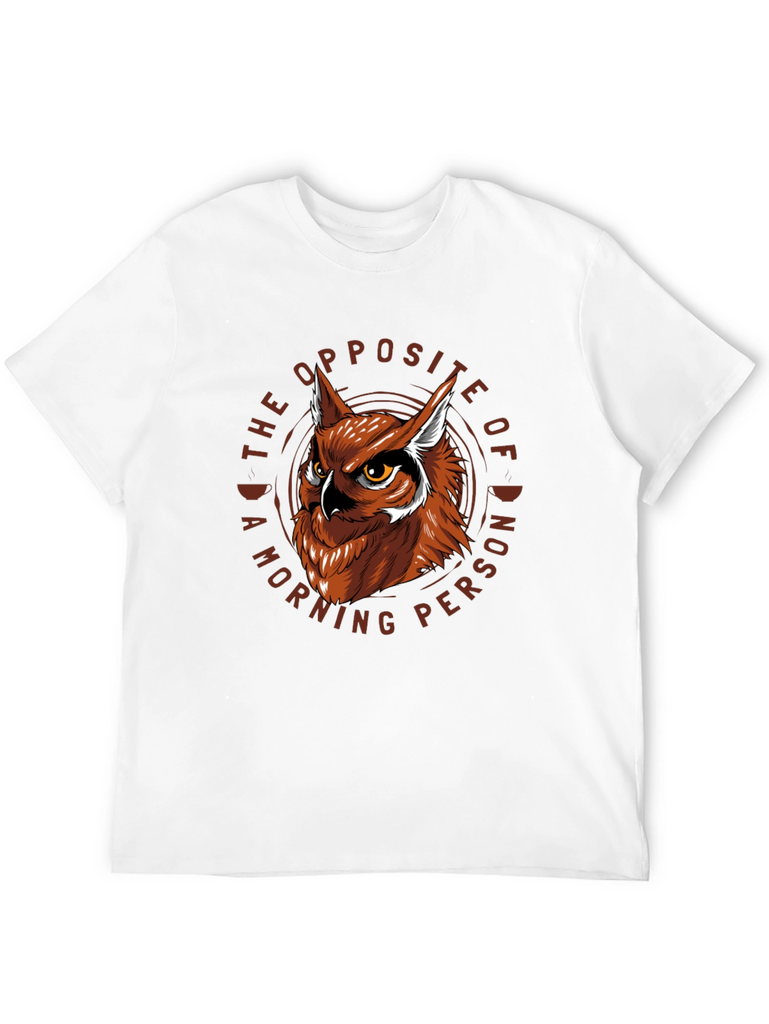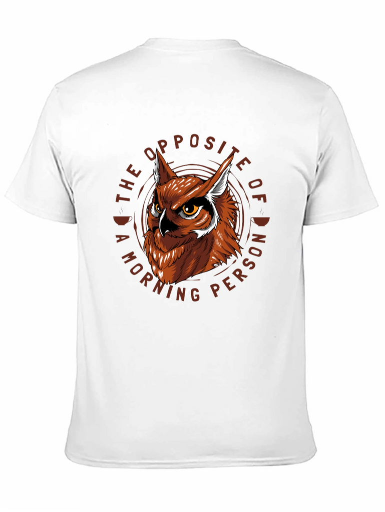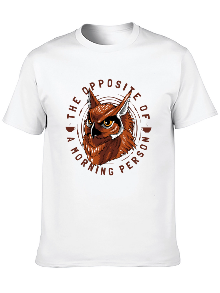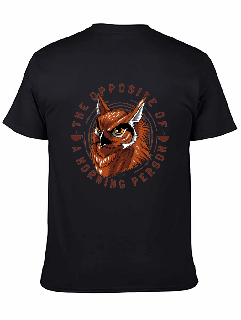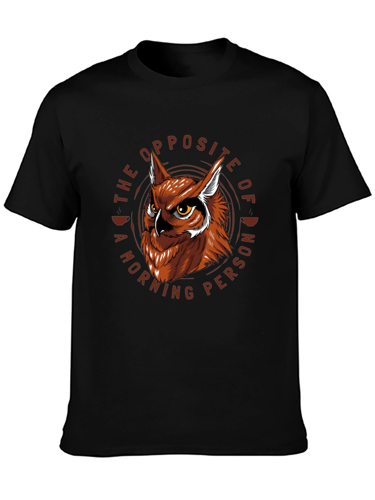 Embrace your inner night owl with this unique graphic tee! Featuring a detailed illustration of an owl encompassed by the phrase "The Opposite of a Morning Person," this t-shirt is perfect for those who thrive after dark. The design is prominently displayed on a soft, black fabric, offering both comfort and style. Ideal for casual wear, lounging at home, or making a statement, this tee is a must-have for anyone who prefers nocturnal adventures over early mornings. Show off your personality and add a touch of whimsy to your wardrobe with this eye-catching t-shirt.