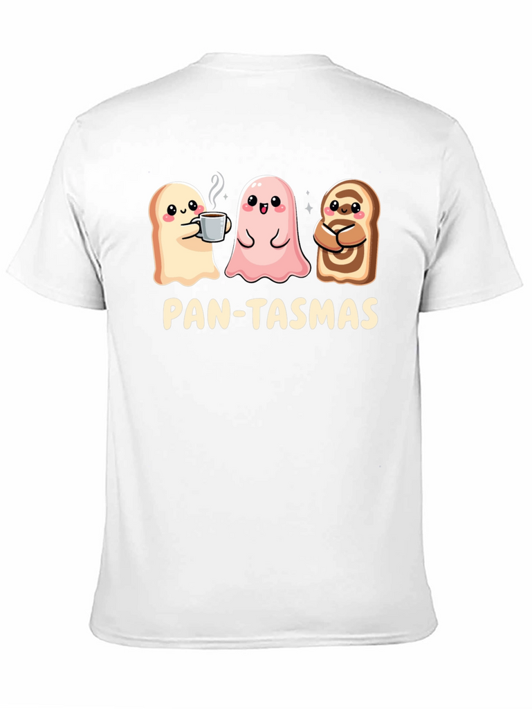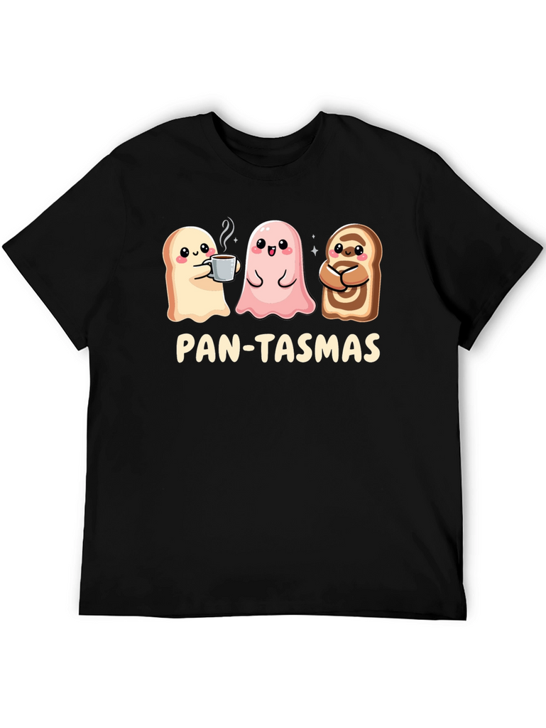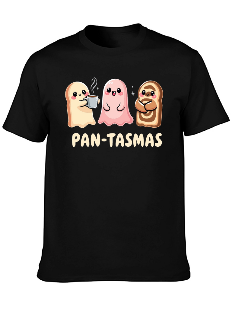 Embrace the fun with this unique black t-shirt! The shirt features an adorable cartoon graphic with three ghost-like pieces of bread, playfully named "Pan-Tasmas". One is holding a cup of coffee, while another is pink and smiling. The third is a piece of cinnamon roll bread. Made from soft, breathable fabric, this tee offers both comfort and style. Perfect for casual outings, lounging at home, or as a quirky gift for bread lovers. Show off your fun side with this eye-catching and conversation-starting t-shirt!