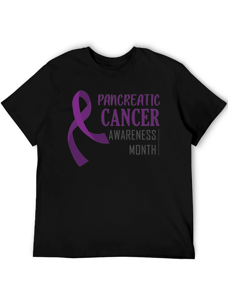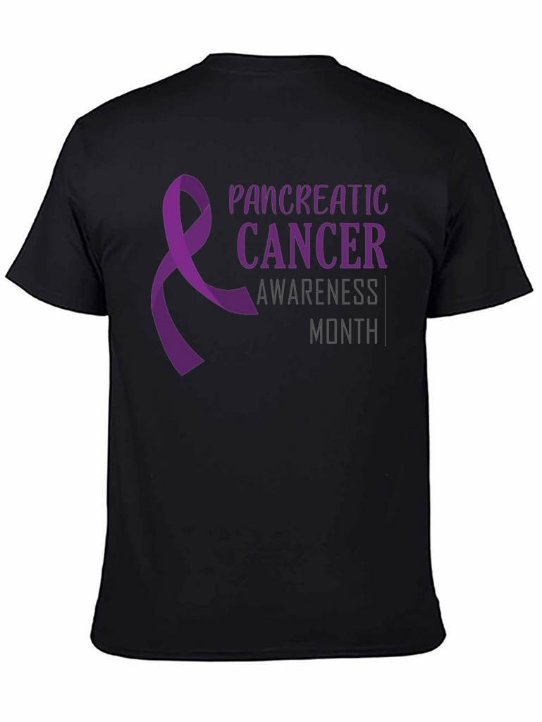 Show your support with this black t-shirt featuring a purple pancreatic cancer awareness ribbon and the words "Pancreatic Cancer Awareness Month". The design is prominently displayed on the front of the shirt. Made from a comfortable fabric, this shirt is perfect for raising awareness and showing solidarity. Wear it to support events, walks, or simply as a daily reminder of hope and strength. Let's unite to support the cause. Get yours today and make a statement of support!