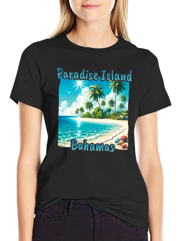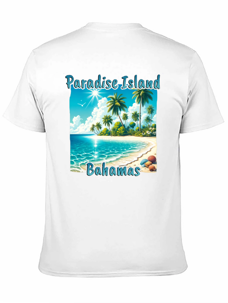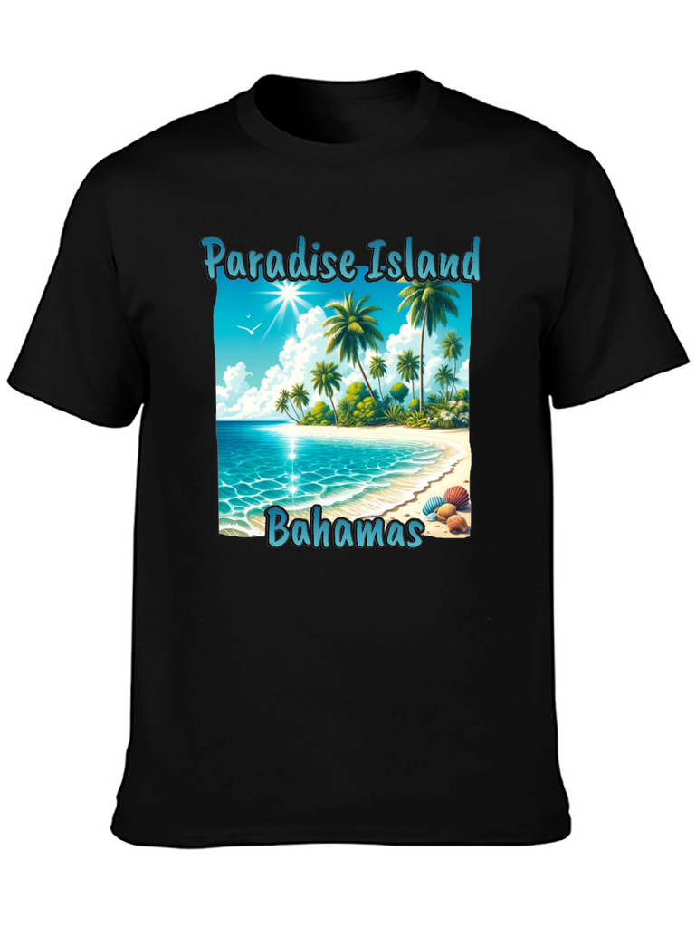 Escape to paradise with this vibrant graphic T-shirt. The shirt features a stunning depiction of a tropical beach scene, complete with palm trees, crystal-clear turquoise water, and the words "Paradise Island Bahamas" in a stylish font. The bright colors and detailed artwork evoke a sense of relaxation and vacation vibes. Made from a comfortable, soft fabric, this tee is perfect for casual wear, beach outings, or as a souvenir. Let this tee bring a touch of island life to your everyday wardrobe.
