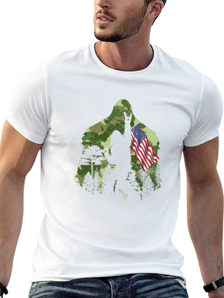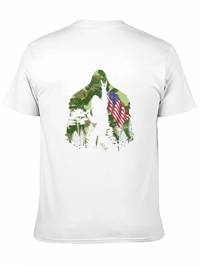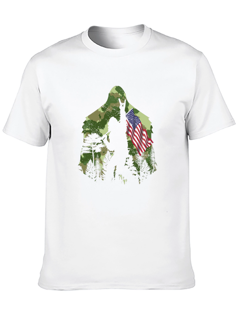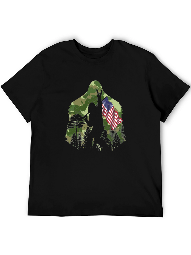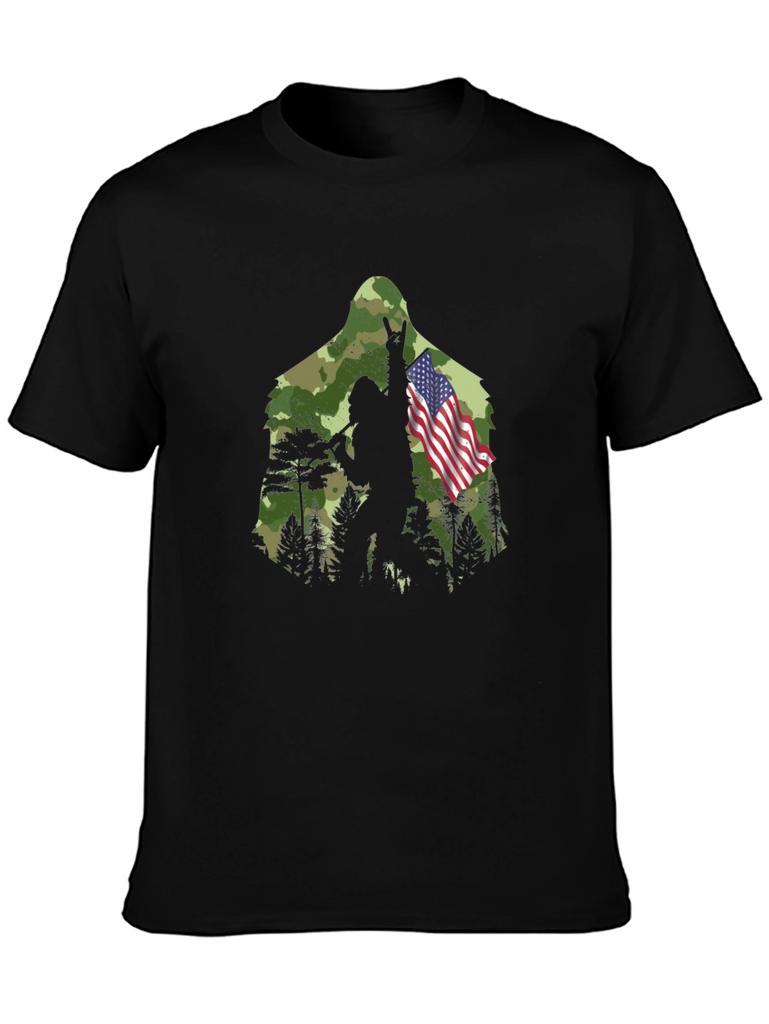 Show your American pride with this unique t-shirt! Featuring a silhouette of Bigfoot in a camouflage design holding an American flag, it's perfect for anyone who loves cryptids and patriotism. The design includes silhouetted trees, adding a wilderness element. Made from a comfortable material, this tee is ideal for casual wear, outdoor adventures, or simply expressing your quirky side. Stand out with this eye-catching, conversation-starting tee that blends mythical lore with American spirit. Get yours today and let your style roar!