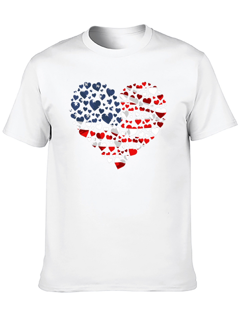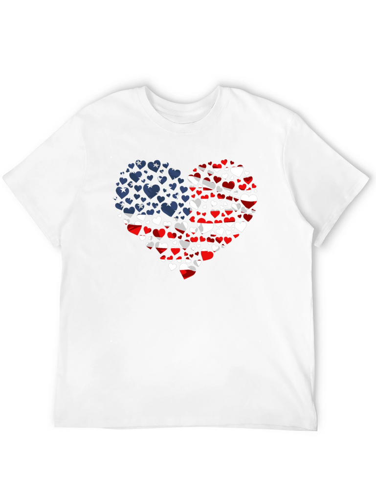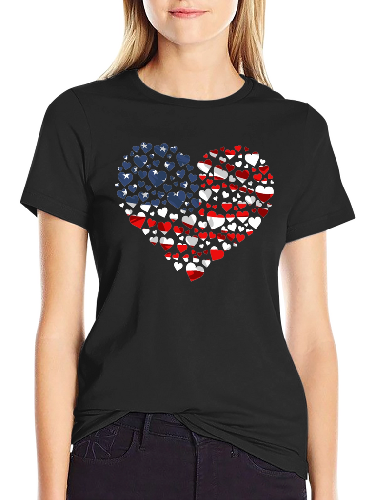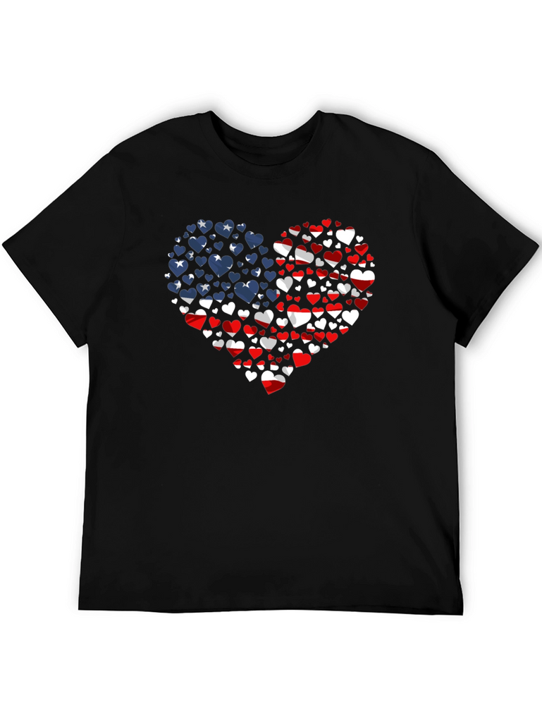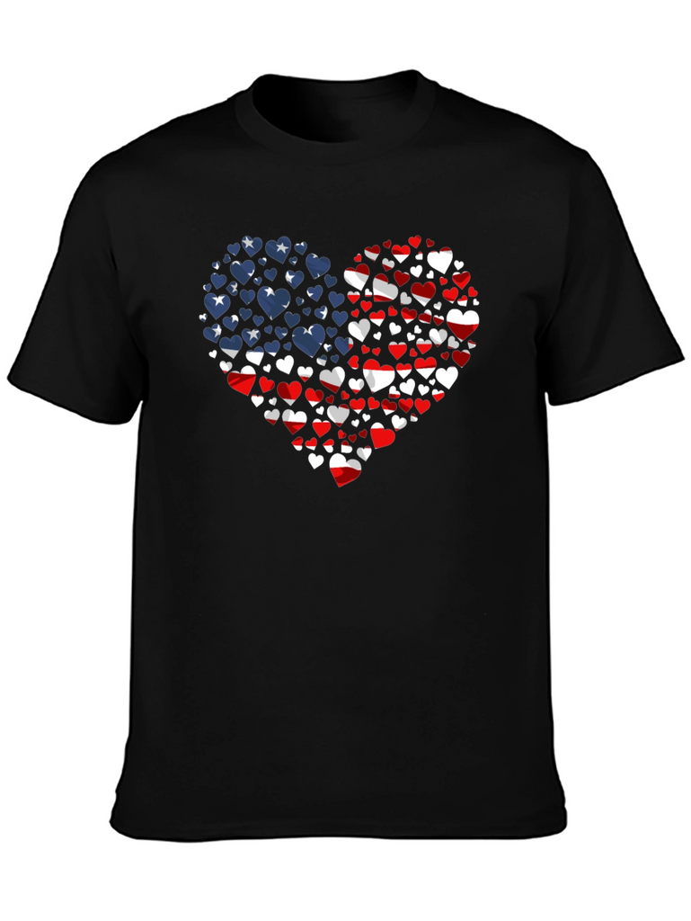 Show your love for the USA with this eye-catching tee! The design features a unique heart shape made up of smaller hearts and stars in the colors of the American flag. This black t-shirt makes a bold statement. The comfortable fabric makes it perfect for everyday wear, patriotic holidays, or showing your American pride any time of year. Great for casual outings, barbecues, or 4th of July celebrations. A great gift for anyone who loves the USA!