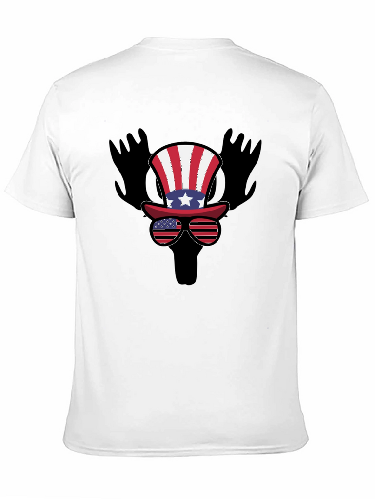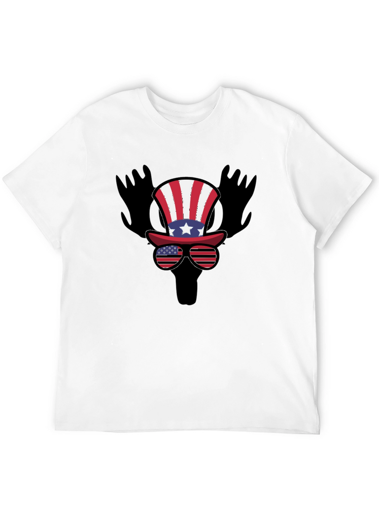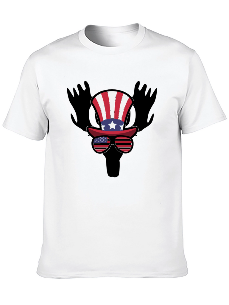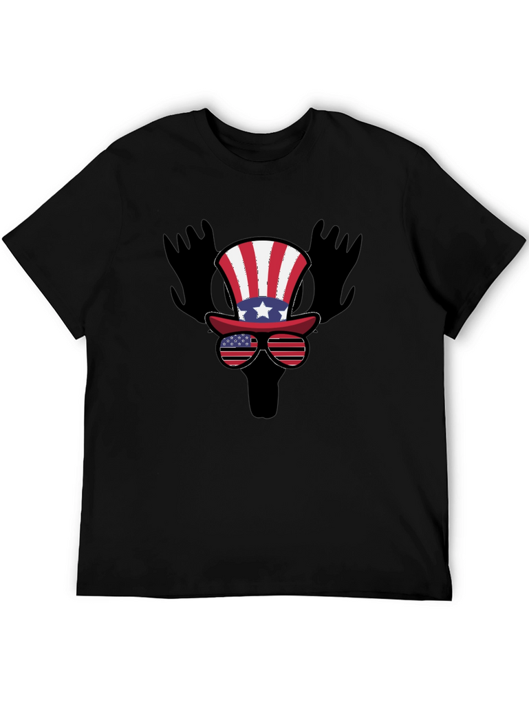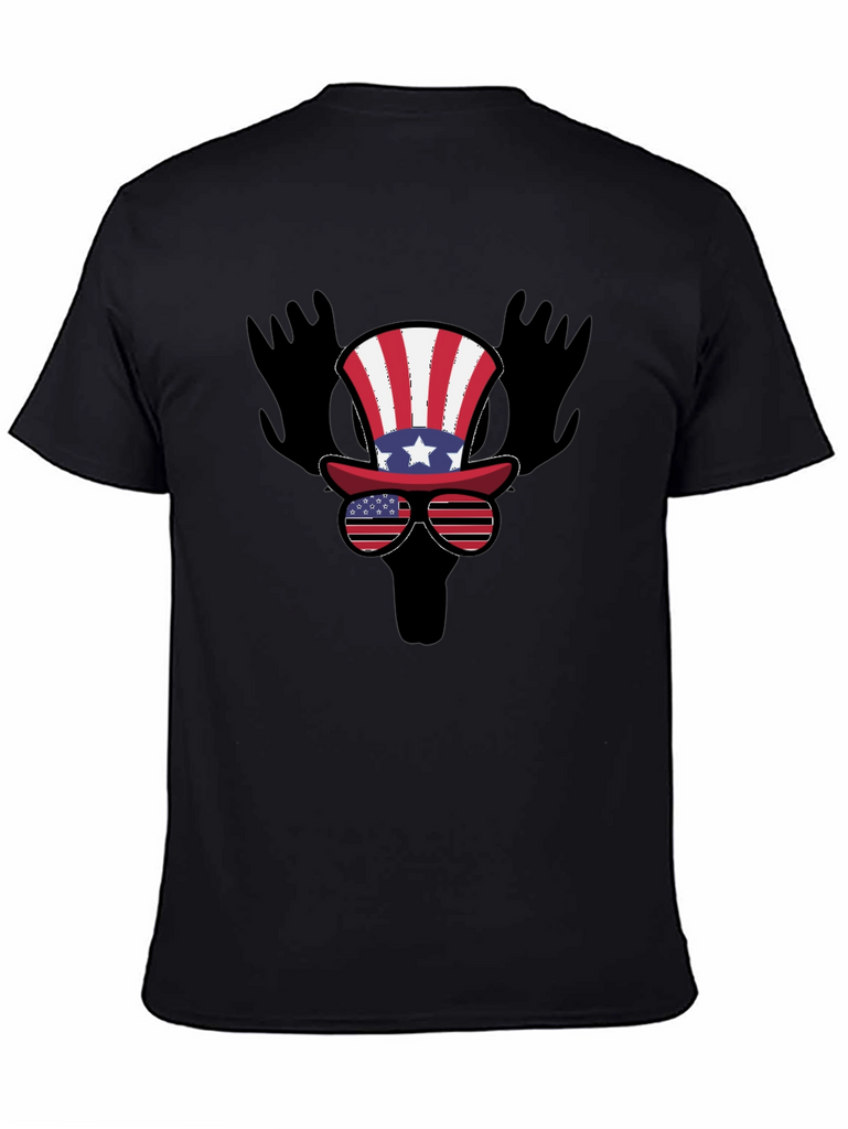 Show off your American pride with this unique patriotic moose t-shirt. The design features a moose silhouette wearing a red and white striped hat with stars, paired with American flag sunglasses. Printed on a comfortable black tee, this shirt is perfect for celebrating Independence Day, attending patriotic events, or simply expressing your love for the USA. The design is eye-catching and will definitely spark conversation. Get yours today and show your American spirit!