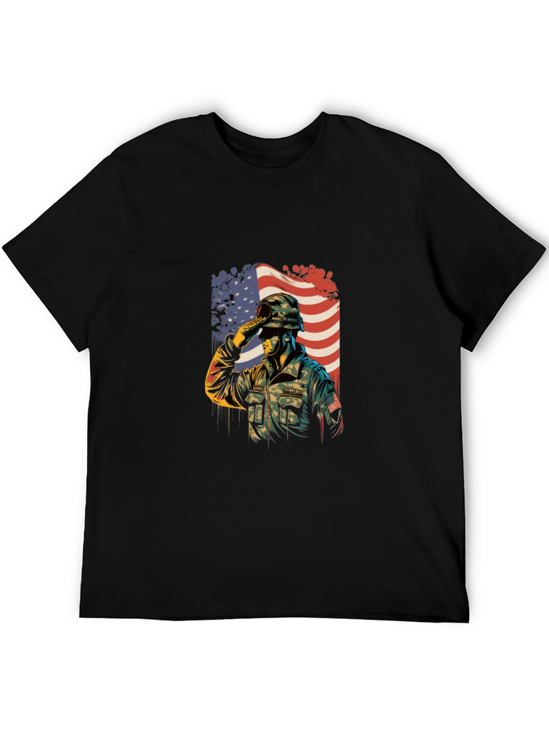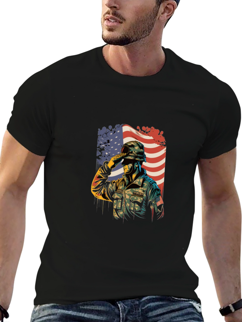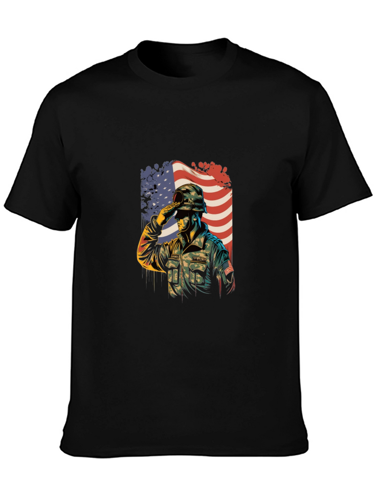 Show your support with this striking black t-shirt featuring a bold graphic of a soldier saluting against the backdrop of an American flag. The vibrant colors and detailed illustration make this tee a standout piece. Made from a soft, comfortable fabric, this shirt is perfect for everyday wear or special occasions like Memorial Day or Independence Day. Whether you're honoring our military or simply expressing your love for the USA, this t-shirt is a powerful statement. A great gift for veterans, active service members, or anyone proud to be American. Wear it with pride!