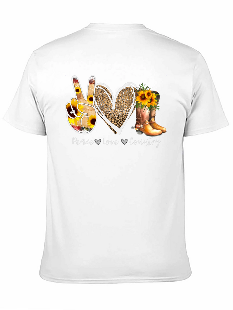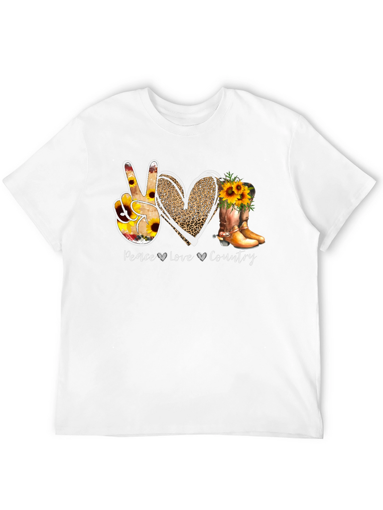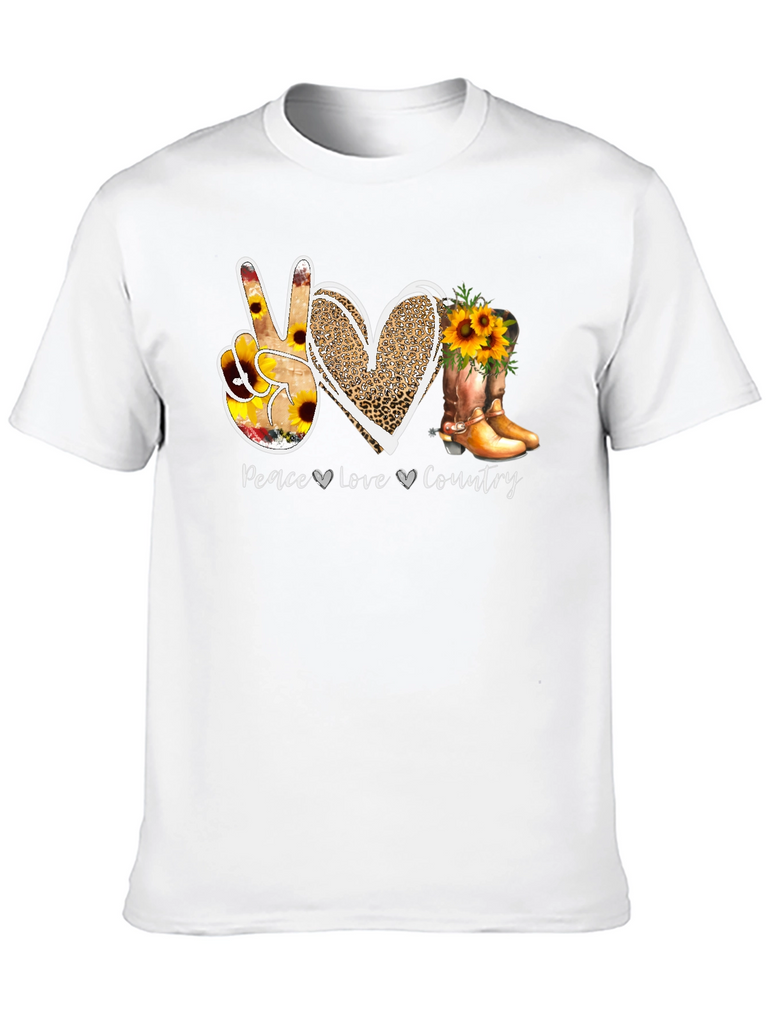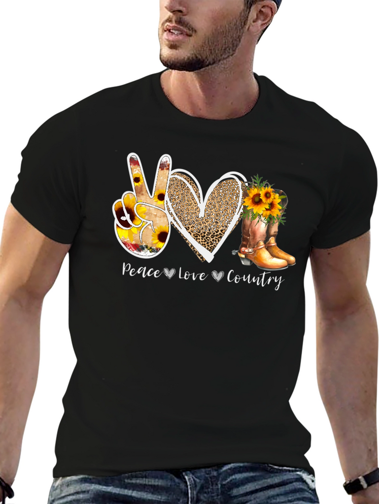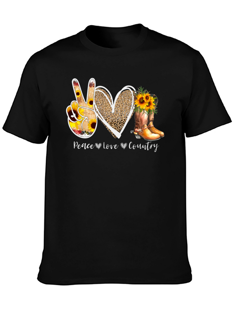 Showcase your country spirit with this unique black graphic tee! This stylish t-shirt features a charming design with a sunflower peace sign, a leopard print heart, and cowboy boots filled with sunflowers. The graphic is printed in high quality for a vibrant look. Soft and breathable, this top is perfect for casual outings, concerts, or everyday wear. Pair it with jeans, shorts, or a skirt for a fun, trendy look. Get ready to embrace the country vibes with this must-have tee!