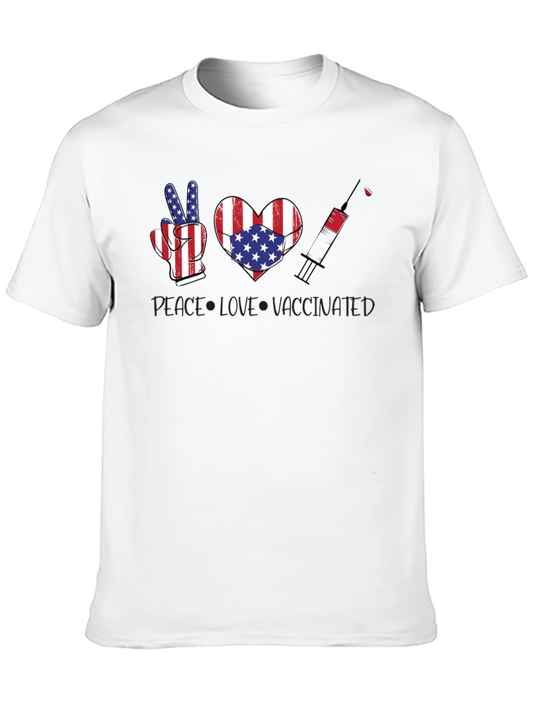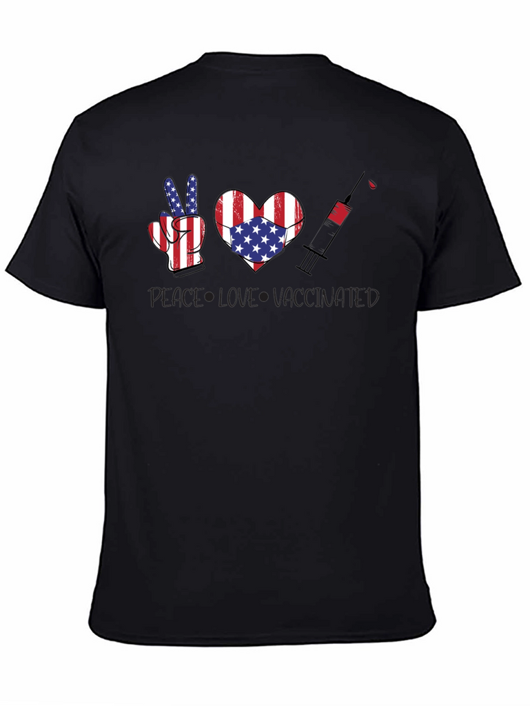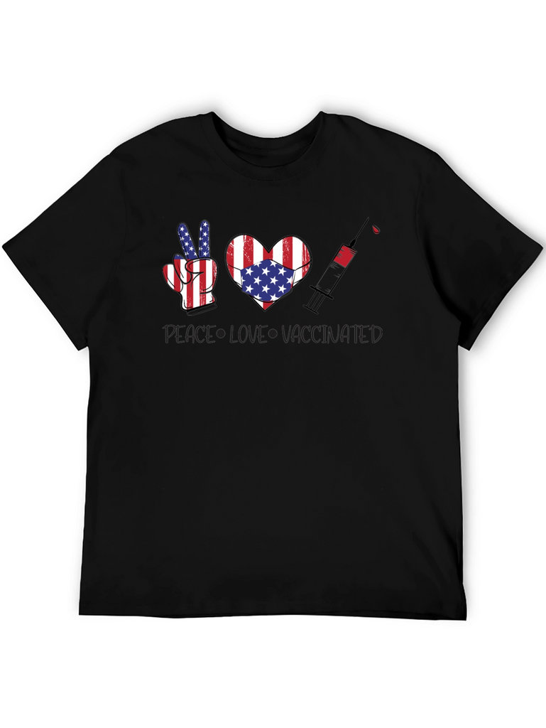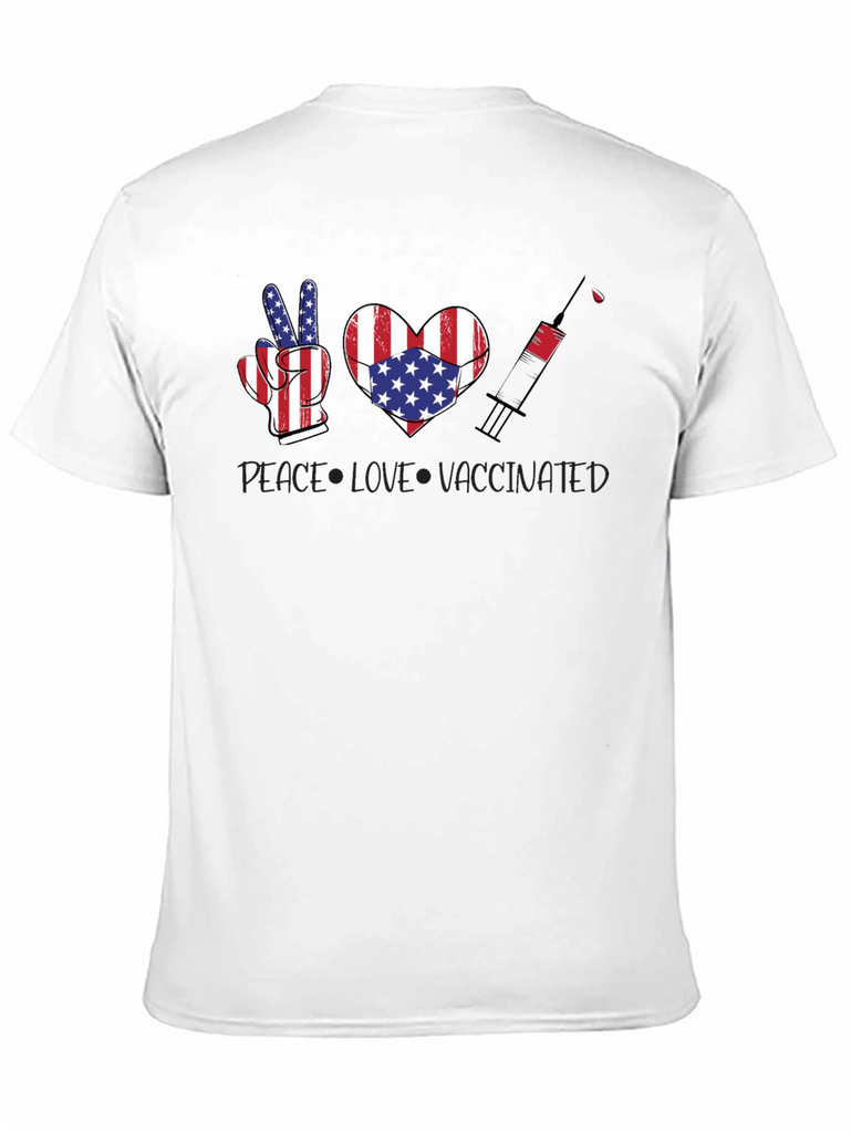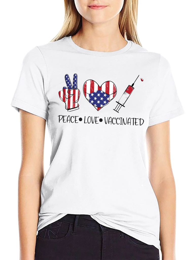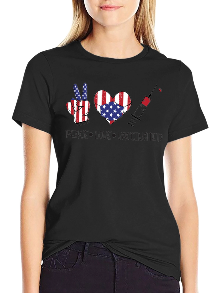 Show your support for vaccination with this eye-catching t-shirt. The design features a peace sign hand, a heart wearing a mask, and a vaccine syringe, all rendered in the colors of the American flag. The words "Peace, Love, Vaccinated" are printed between the design elements. Made from soft, breathable fabric, this t-shirt offers both comfort and style. Perfect for casual wear, rallies, or making a statement. Available in multiple sizes.