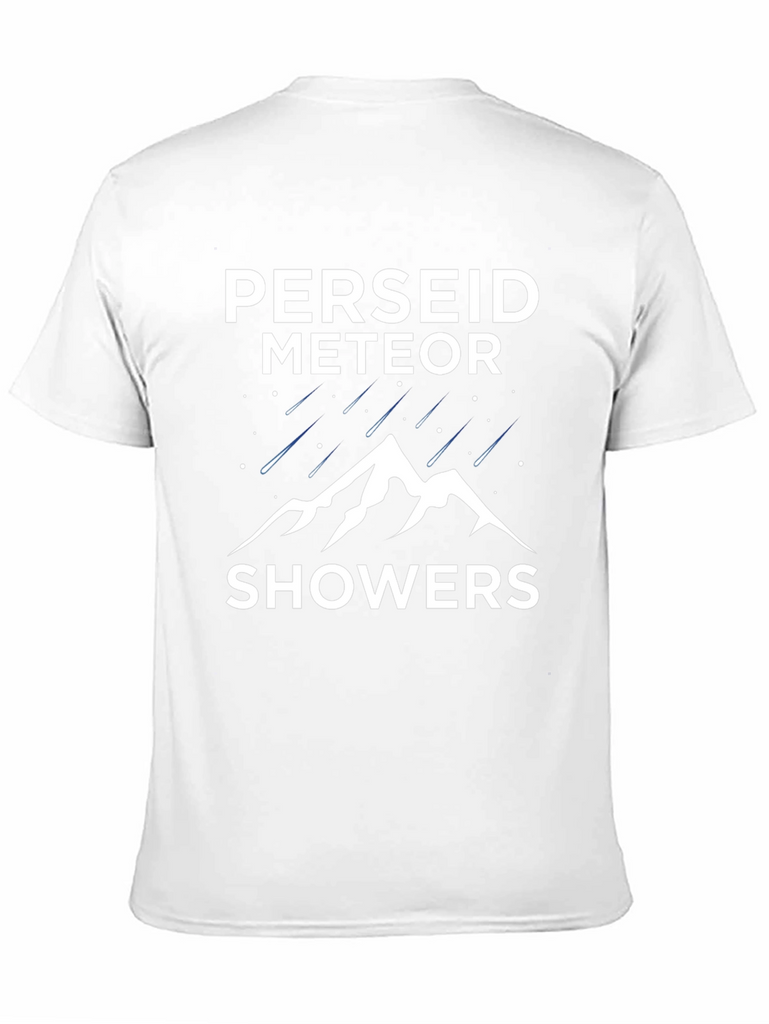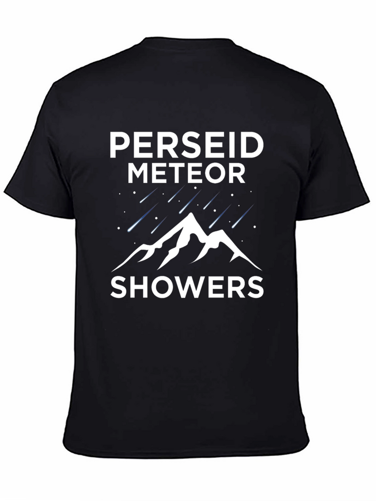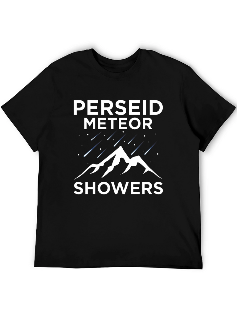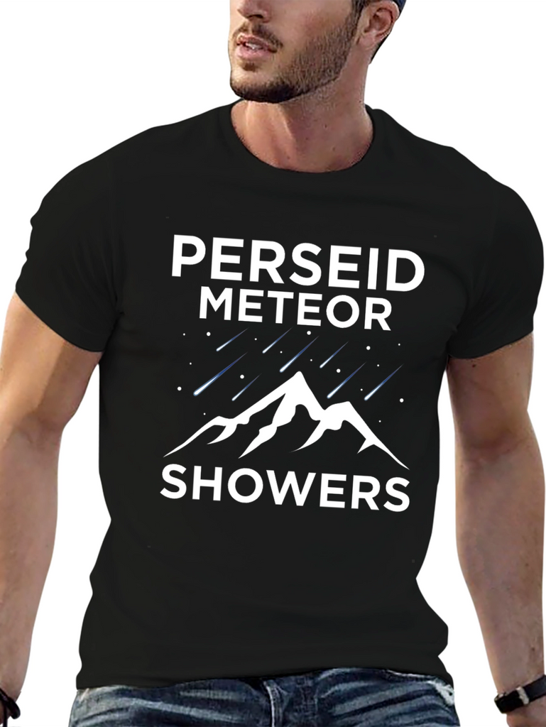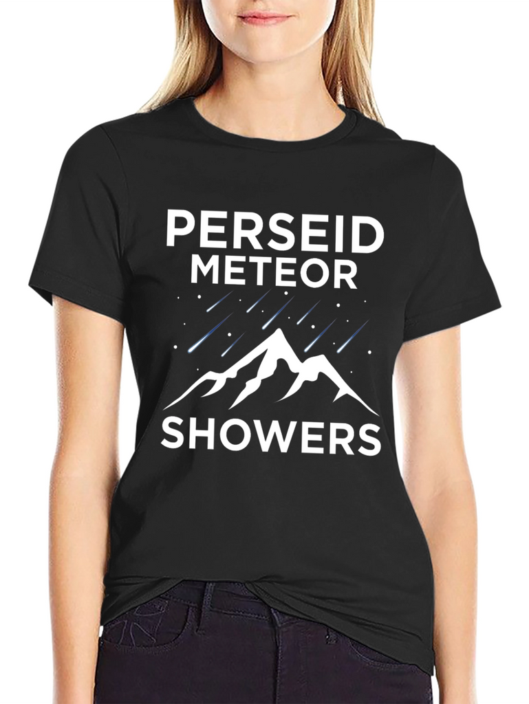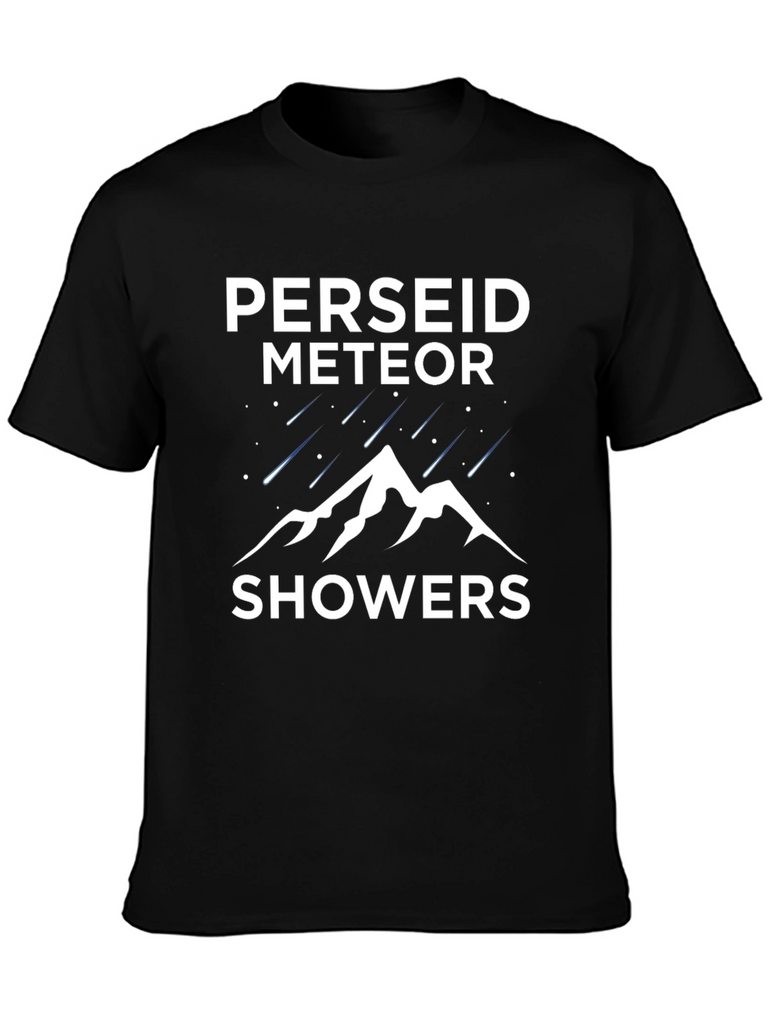 Witness the celestial dance with this stylish black t-shirt featuring a unique graphic of the Perseid meteor showers. The design showcases a mountain range silhouette against a backdrop of shooting stars, making it an ideal choice for astronomy enthusiasts and nature lovers. Made from a comfortable and breathable fabric, this tee is perfect for casual wear, stargazing adventures, or simply expressing your love for the cosmos. Wear it proudly and spark conversations wherever you go. A statement piece that combines comfort, style, and a passion for the universe.