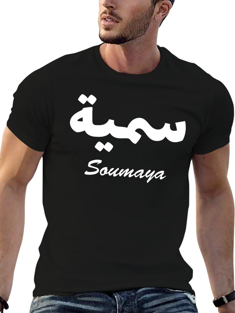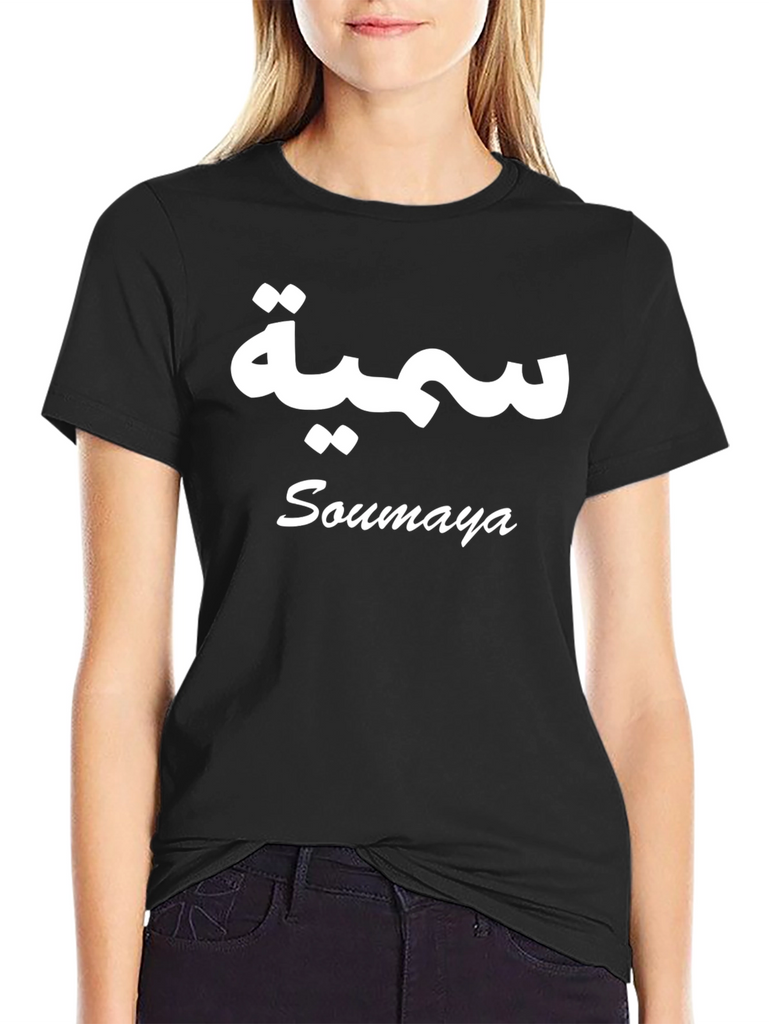 Show off your unique style with this eye-catching black t-shirt featuring the name "Soumaya" in both Arabic and English script. Crafted from a soft, comfortable material, this tee offers a relaxed fit for everyday wear. The bold white lettering stands out against the dark background, making a fashionable statement. Whether you're running errands, meeting friends, or simply lounging at home, this custom t-shirt adds a personal touch to any outfit. A perfect gift for yourself or the Soumaya in your life!