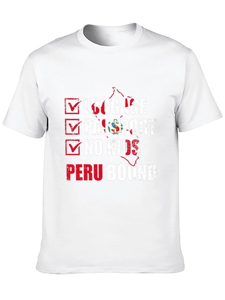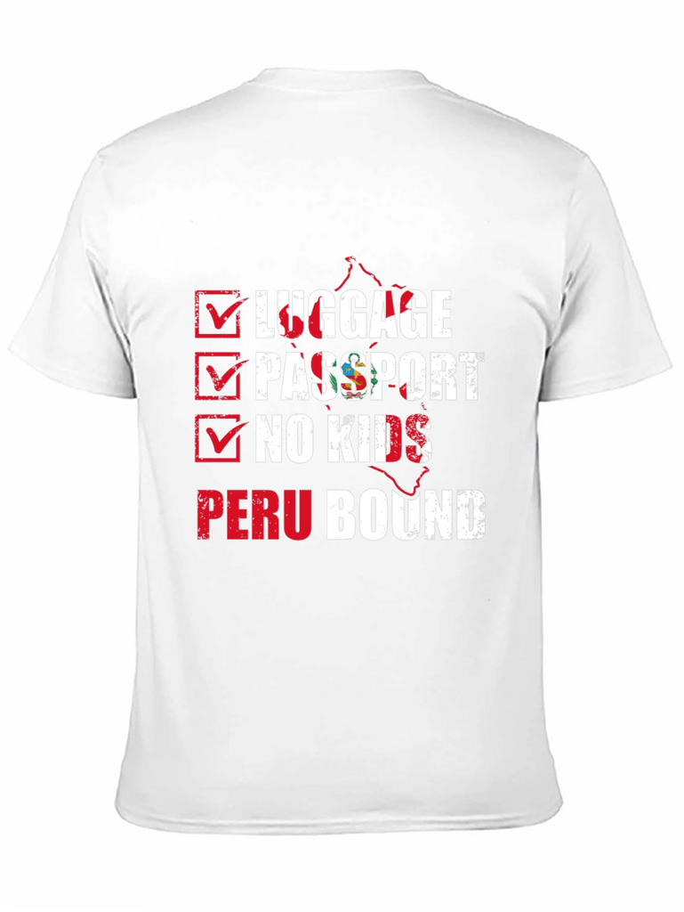 Show your excitement for your upcoming trip to Peru with this unique t-shirt. This black tee features a fun checklist design, with "Luggage," "Passport," and "No Kids" all checked off, followed by "Peru Bound" in bold red letters. The design cleverly incorporates the Peruvian flag within the text, adding a patriotic touch. Made from a comfortable material, this shirt is perfect for travel enthusiasts and anyone proud of their Peruvian heritage. Wear it on your travels, at Peruvian-themed events, or simply to express your love for Peru!