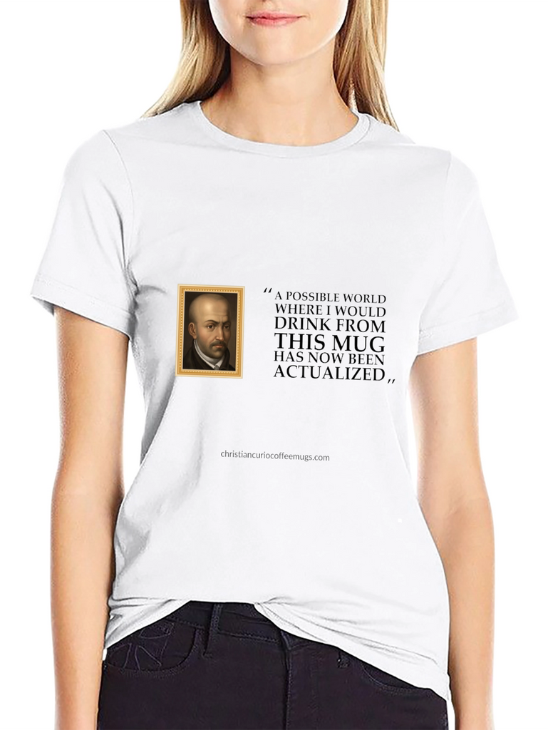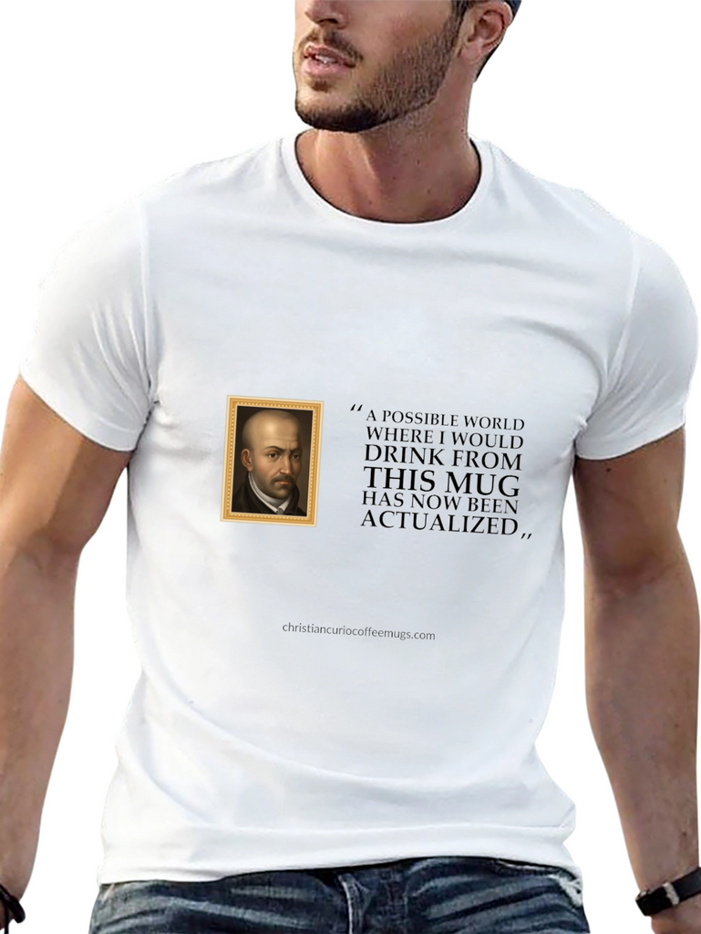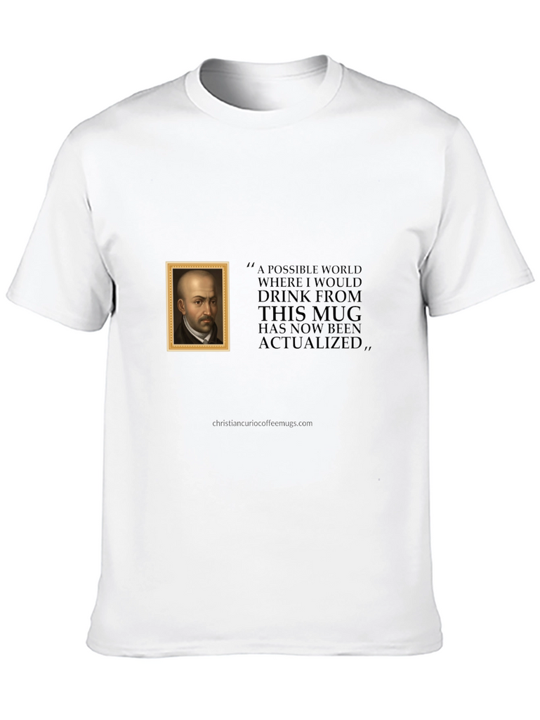 This black t-shirt features a unique design that is sure to spark conversation. On the front, there's a framed portrait reminiscent of a classic painting, next to a quote that reads, "A POSSIBLE WORLD WHERE I WOULD DRINK FROM THIS MUG HAS NOW BEEN ACTUALIZED." The design is printed with precision, ensuring that the text is clear and legible. Made from soft, breathable fabric, this shirt offers all-day comfort and is perfect for casual wear or as a statement piece. Show off your intellectual side with this standout t-shirt!