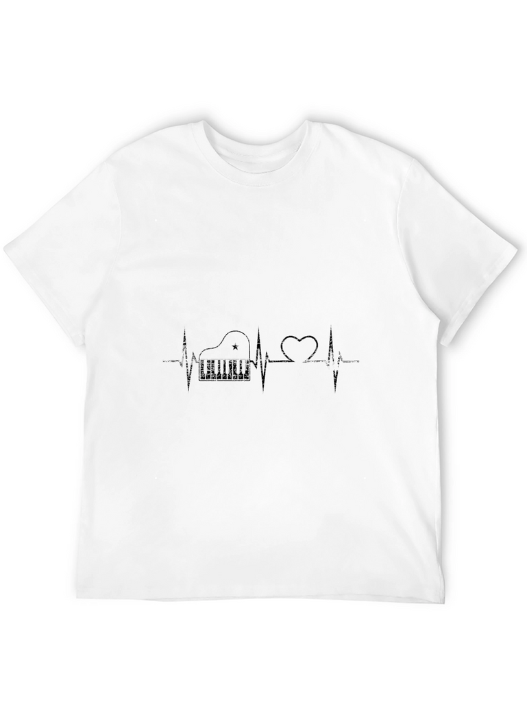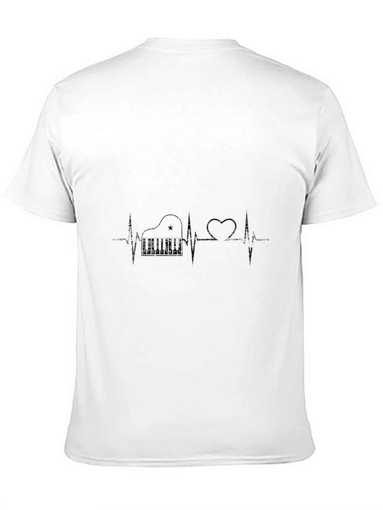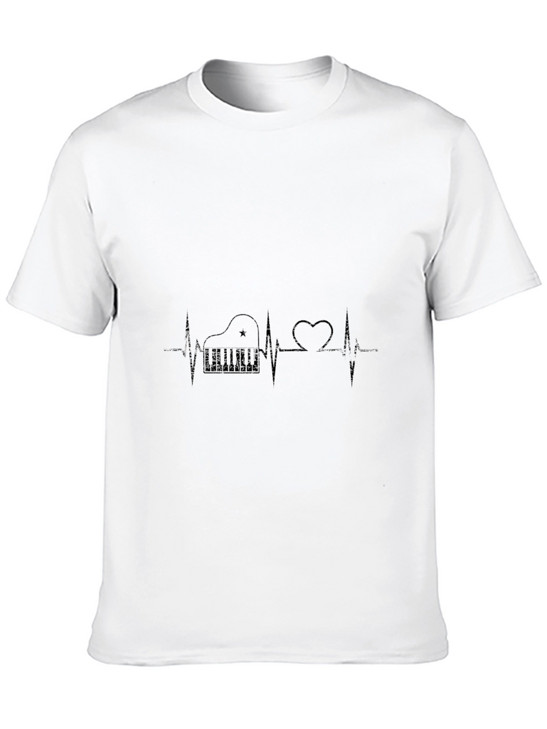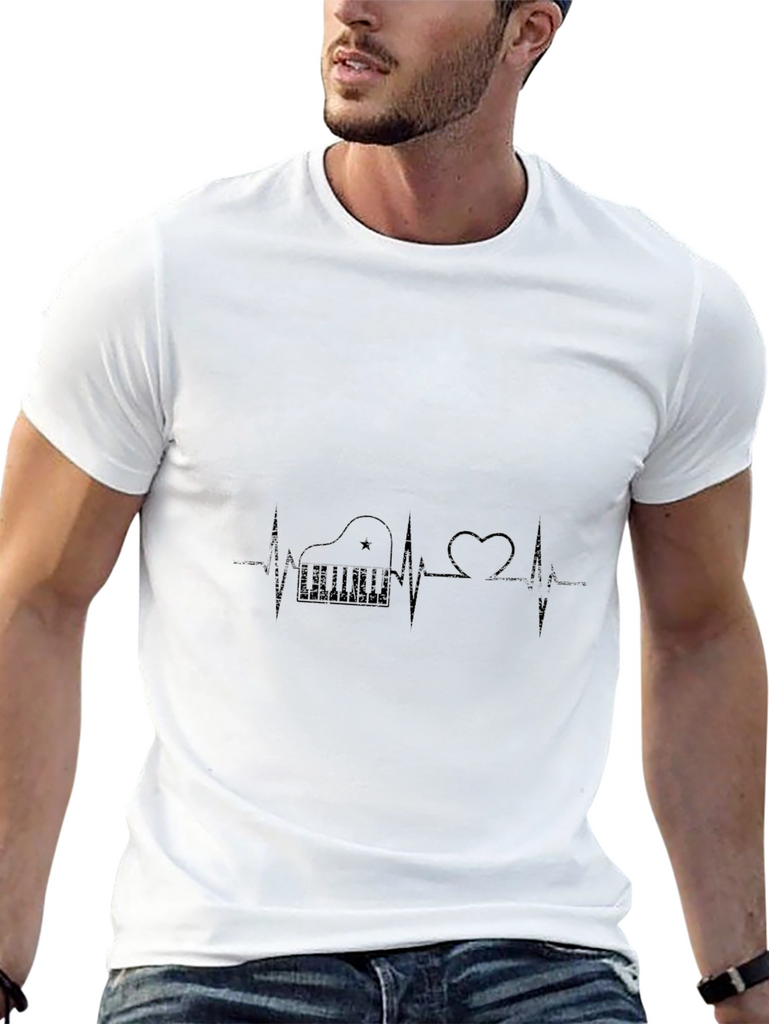 Show your love for music with this stylish black t-shirt. Featuring a unique heartbeat design that incorporates a piano and a heart, it's perfect for musicians and music enthusiasts alike. The shirt appears to be made from a comfortable, soft fabric ideal for everyday wear. Its classic fit makes it a versatile addition to any wardrobe. Wear it to concerts, music festivals, or just around town to express your passion for music. A great gift for pianists, music teachers, or anyone who loves the sound of keys. Let the world know music is the rhythm of your heart!