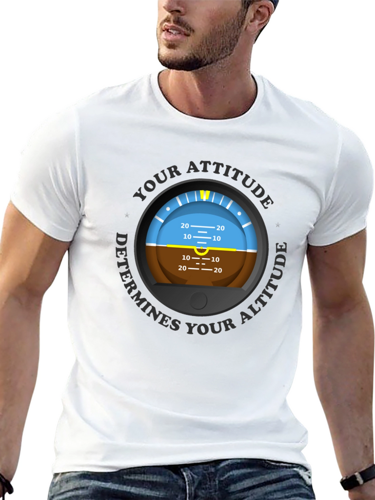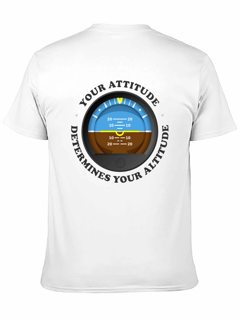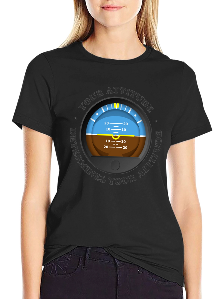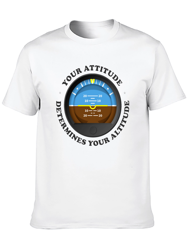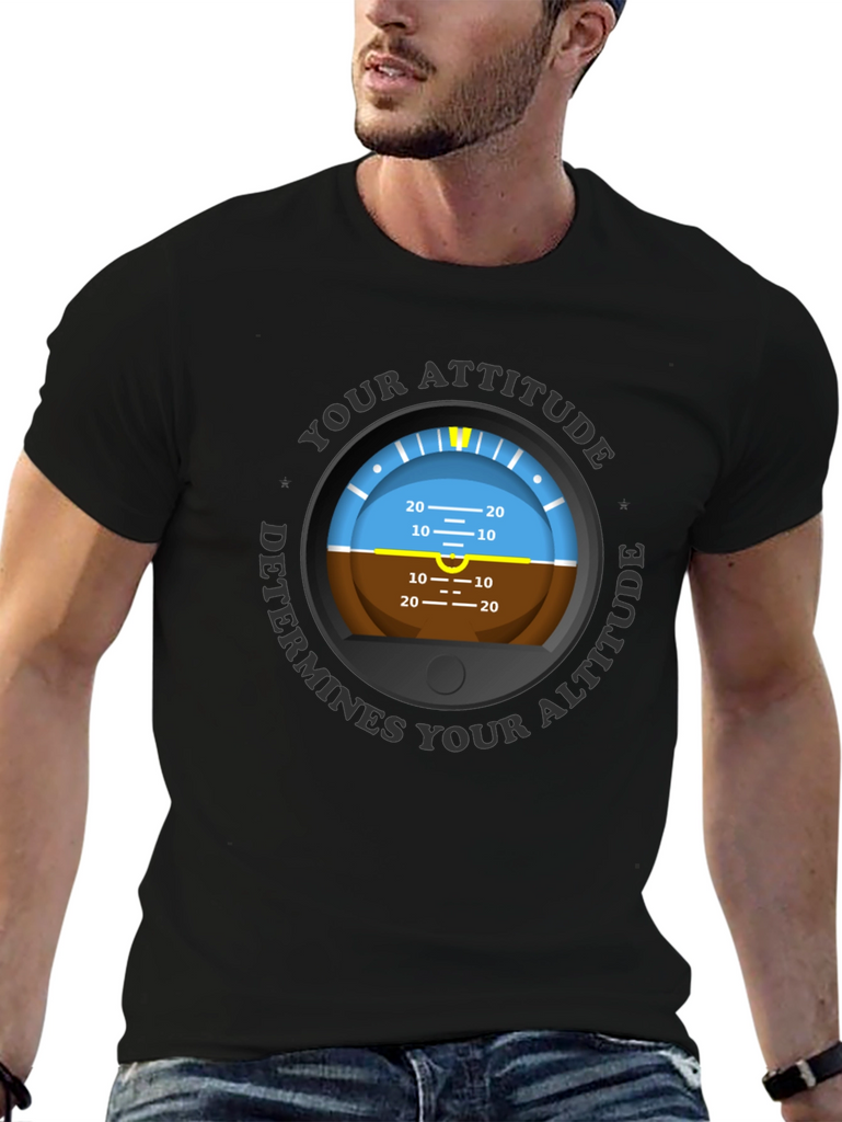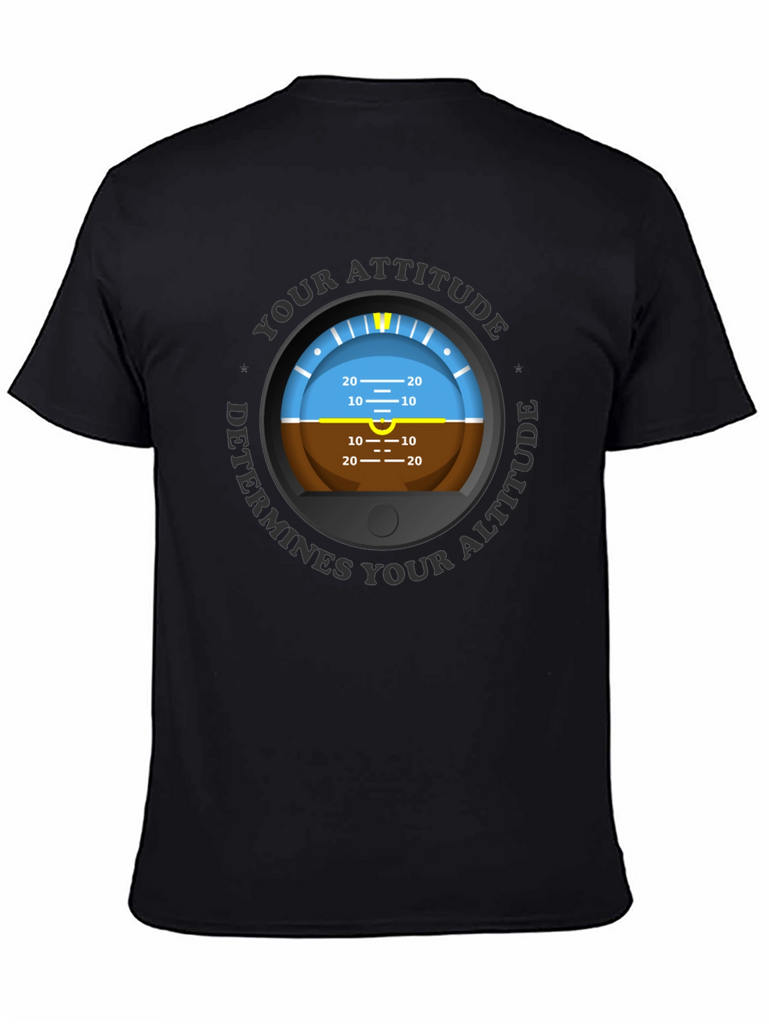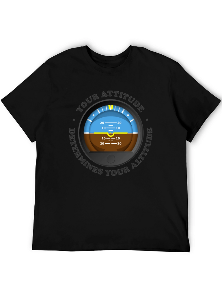 Soar in style with this unique graphic tee! This black t-shirt features a cool, circular design resembling an aircraft attitude indicator. The graphic showcases a blue and brown horizon with numerical markings. "YOUR ATTITUDE" is printed above the gauge, while "DETERMINES YOUR ALTITUDE" curves below, adding a motivational twist. Made from comfortable material, this tee is perfect for pilots, aviation enthusiasts, or anyone who loves unique and eye-catching designs. Ideal for casual wear, it's a great conversation starter and a must-have for your wardrobe. Fly high with this awesome aviation-themed t-shirt!