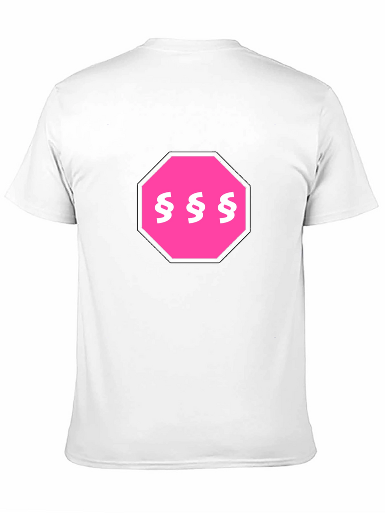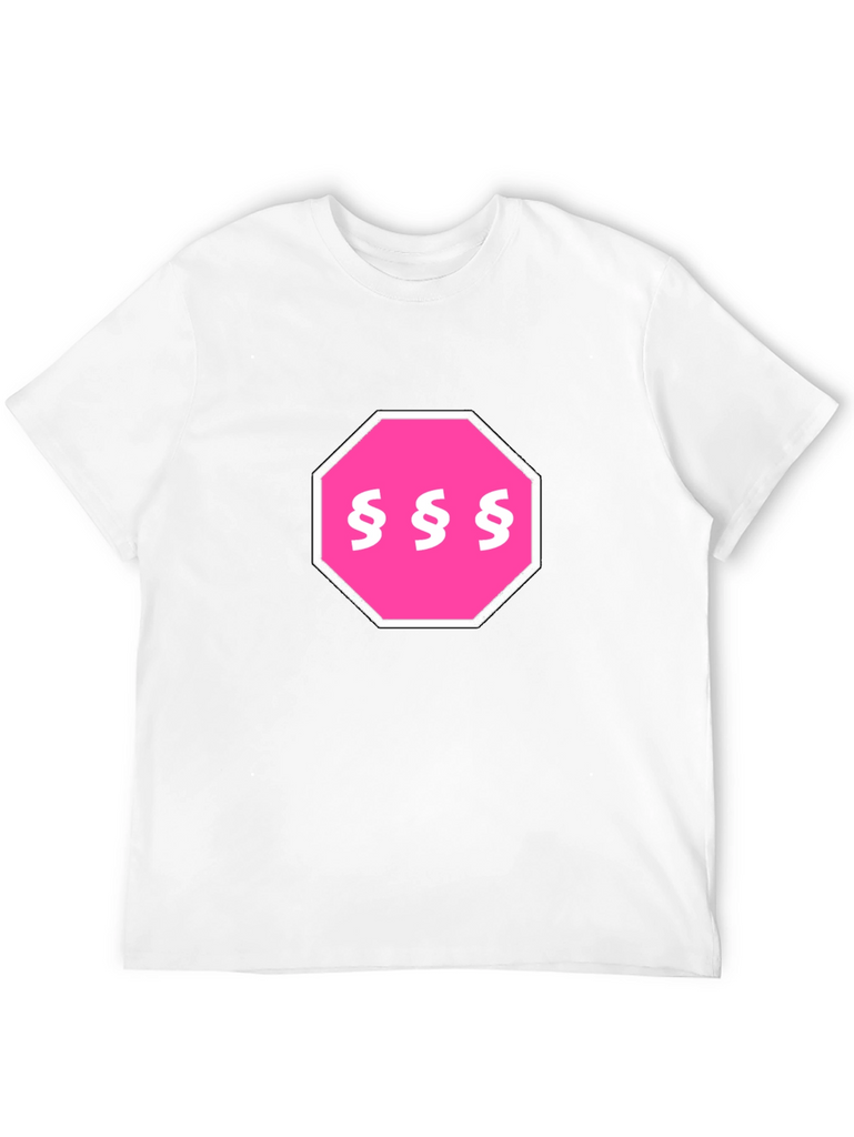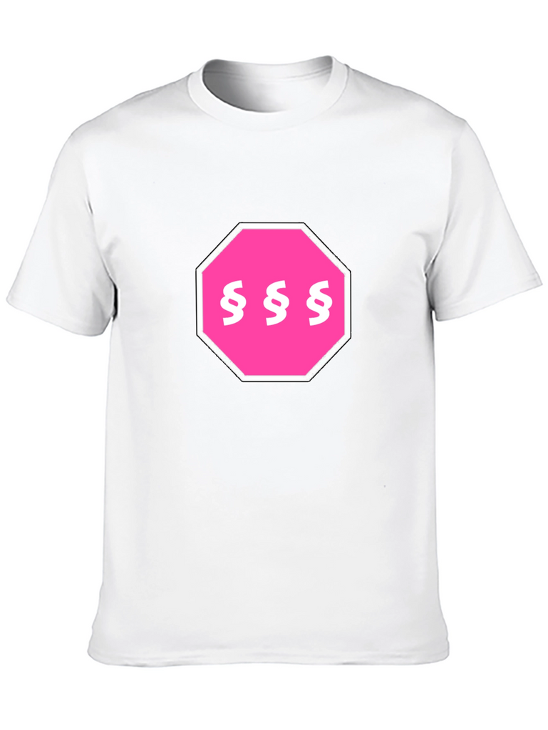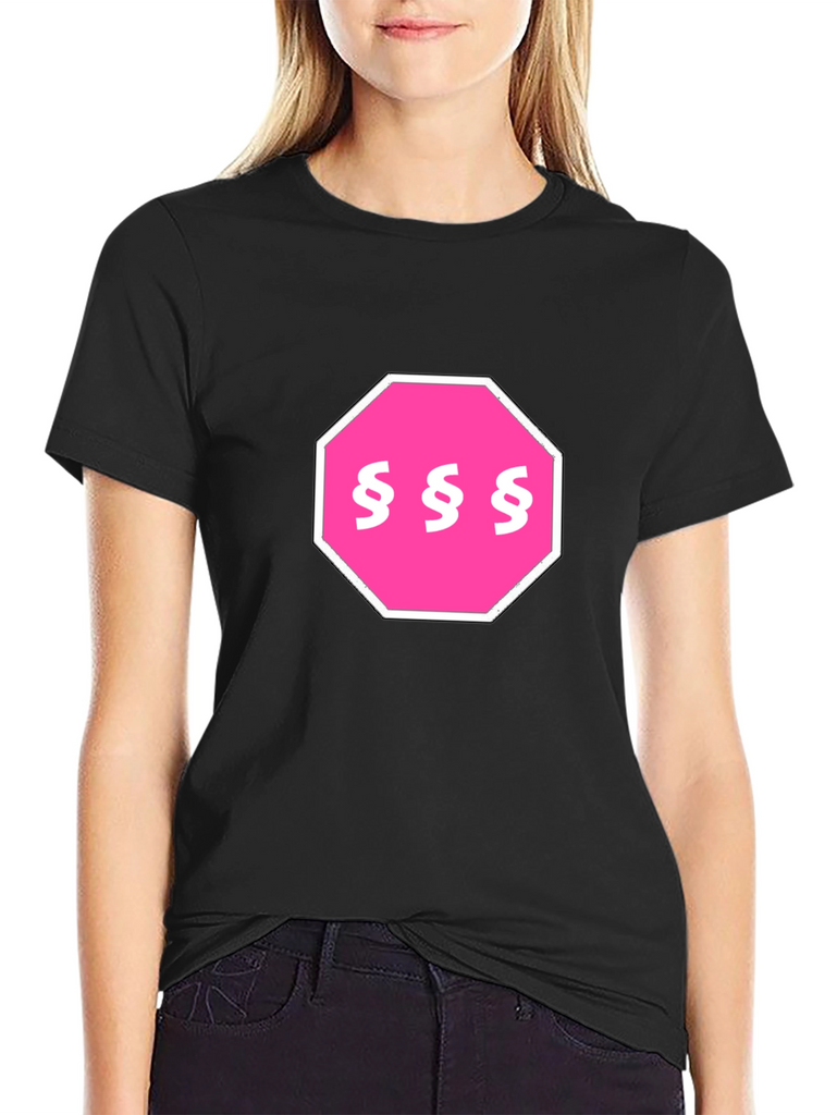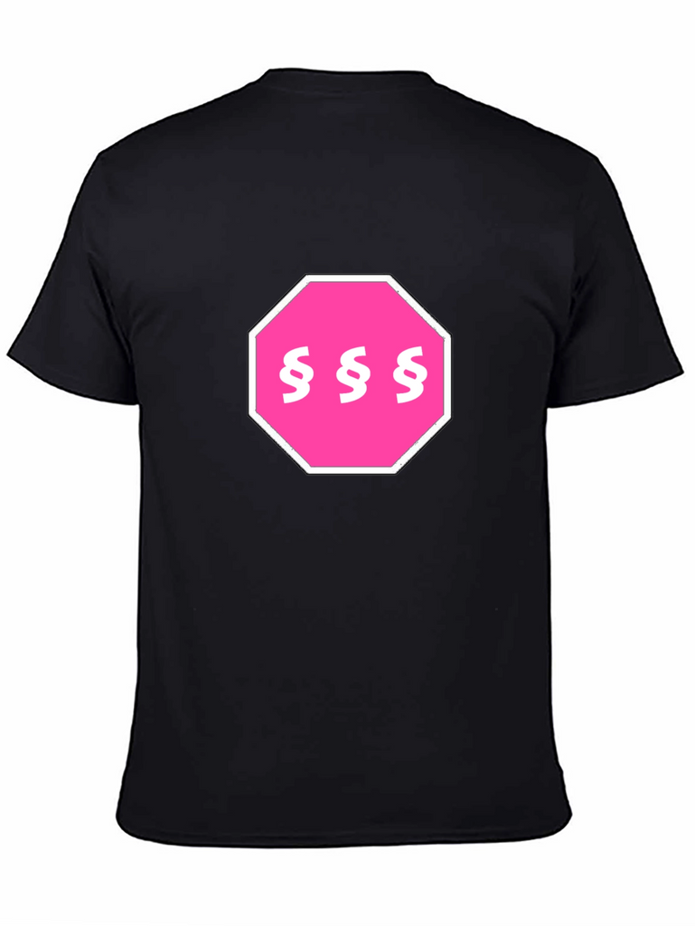 This unique black t-shirt features a bold, eye-catching design: a bright pink stop sign octagon with three white section symbols arranged horizontally inside. The shirt appears to be made from a soft, comfortable material, ideal for casual wear. This eye-catching tee is perfect for legal professionals, students, or anyone who appreciates a touch of quirky style. Makes a statement, sparking conversations and showing off your unique personality. Comfortable to wear, easy to pair with jeans or shorts. A great addition to any wardrobe.