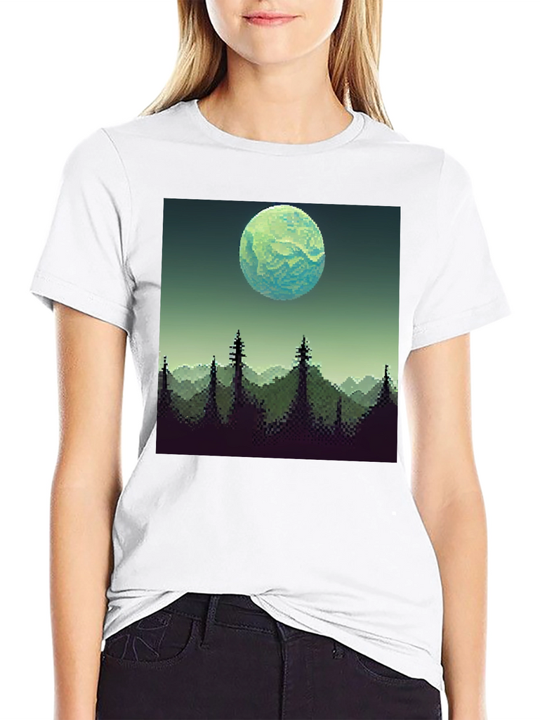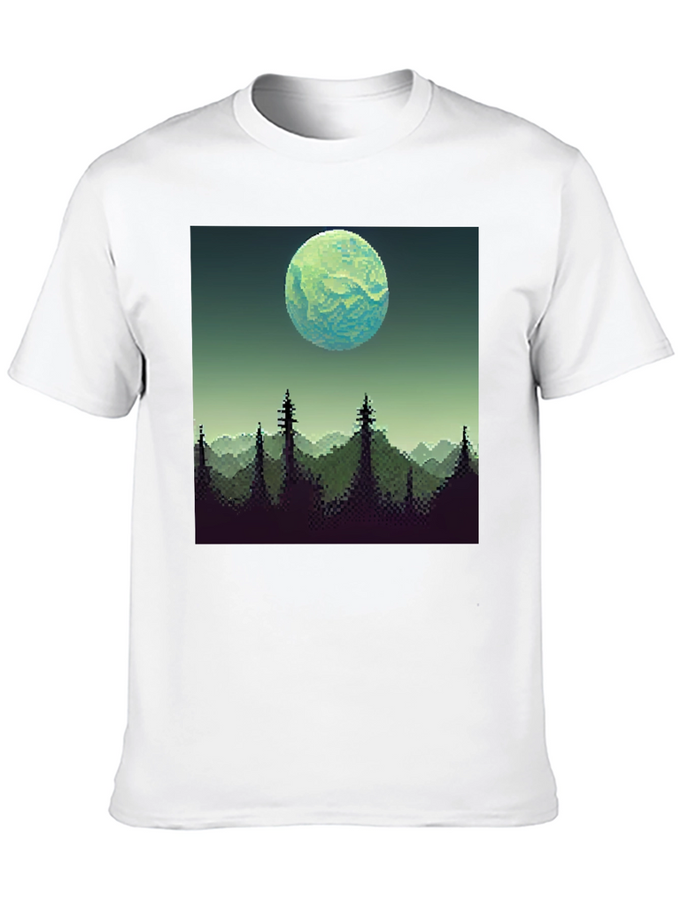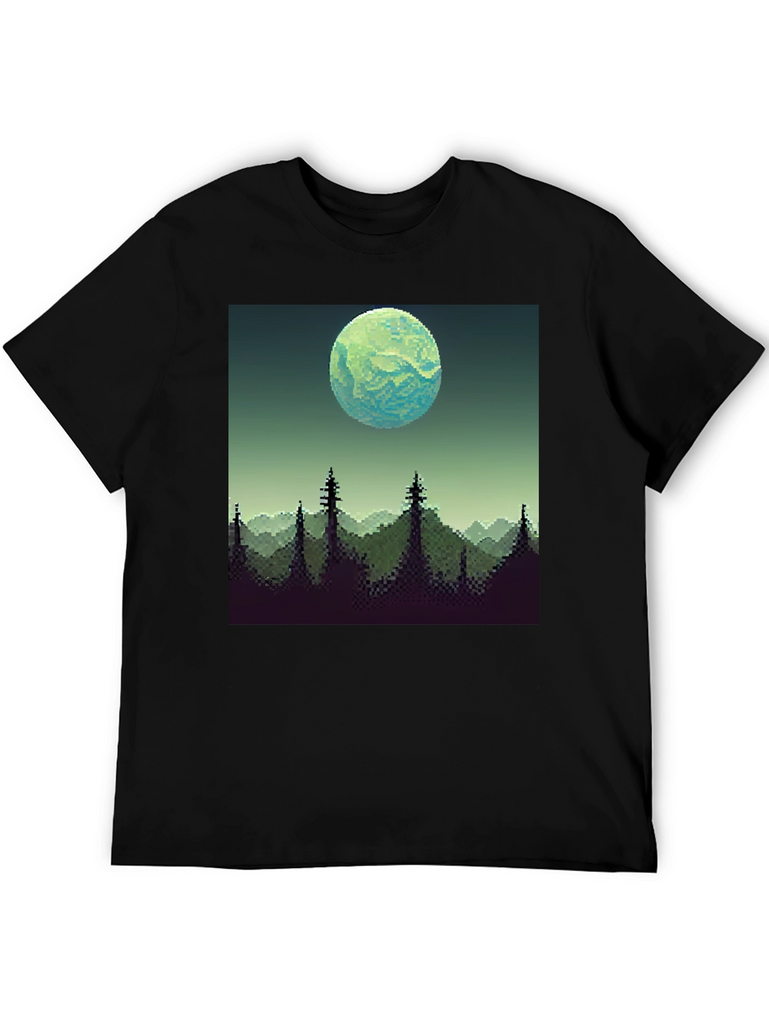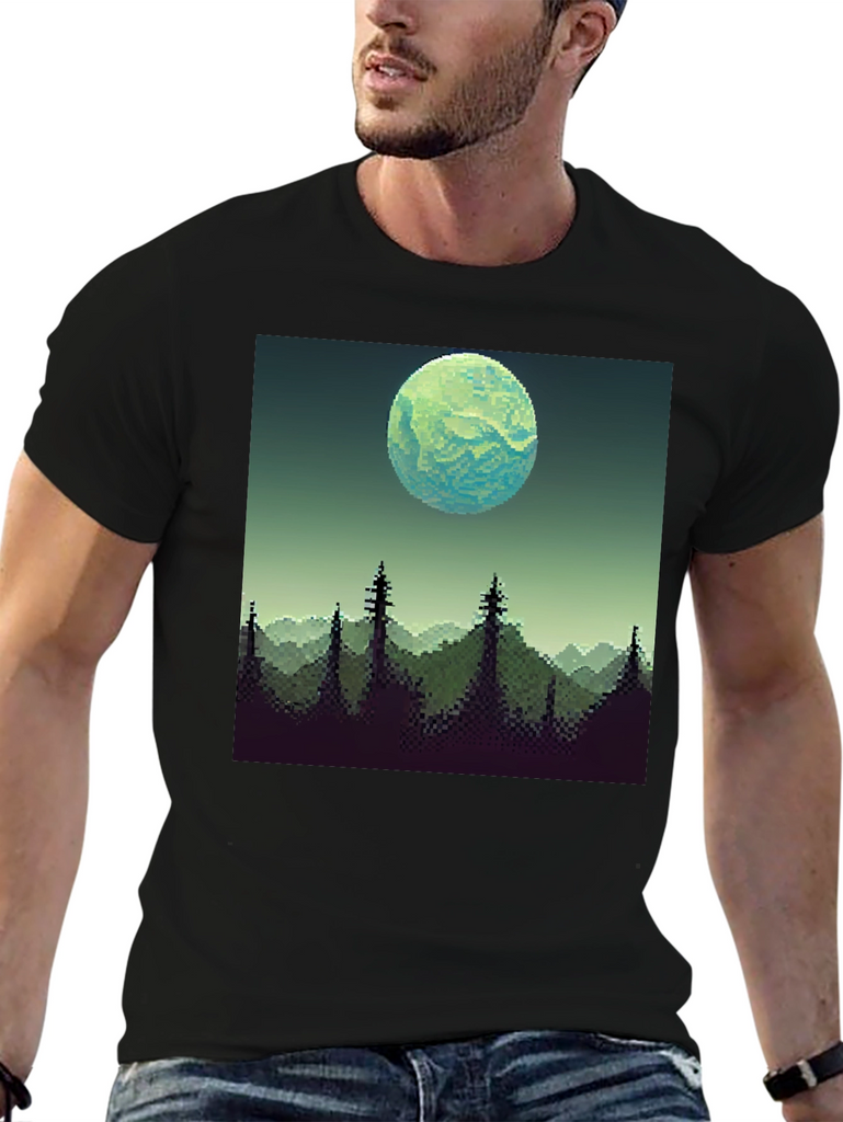 Embrace a retro aesthetic with this unique pixel art t-shirt. The shirt features a striking design of a moon floating over a stylized landscape of silhouetted forests. The pixelated artwork lends a nostalgic, 8-bit feel, perfect for gamers and art lovers alike. The shirt is a classic fit, made from soft, comfortable cotton in a sleek black color. This tee is a conversation starter, ideal for casual wear, gaming events, or as a standout piece in your everyday wardrobe. Show off your love for retro art with this eye-catching graphic tee.