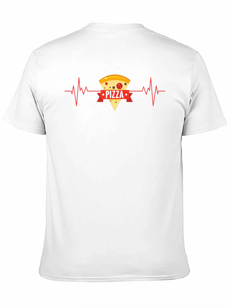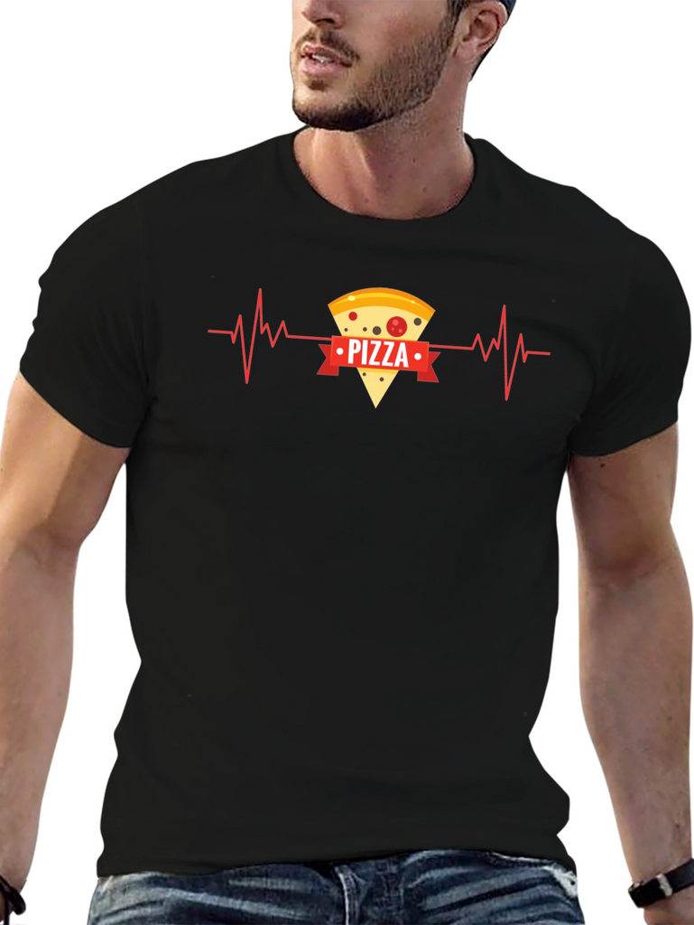 Show off your love for pizza with this unique graphic t-shirt! The black tee features a fun design of a pizza slice integrated into a heartbeat rhythm, symbolizing a passion for food. The word "PIZZA" is prominently displayed on a red ribbon across the slice, making it a playful and eye-catching statement. Crafted from comfortable, breathable fabric, this shirt is perfect for casual wear, pizza nights, or as a fun gift for the pizza enthusiast in your life. Get yours today and wear your pizza heart on your sleeve (or chest)!