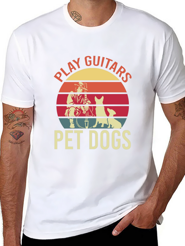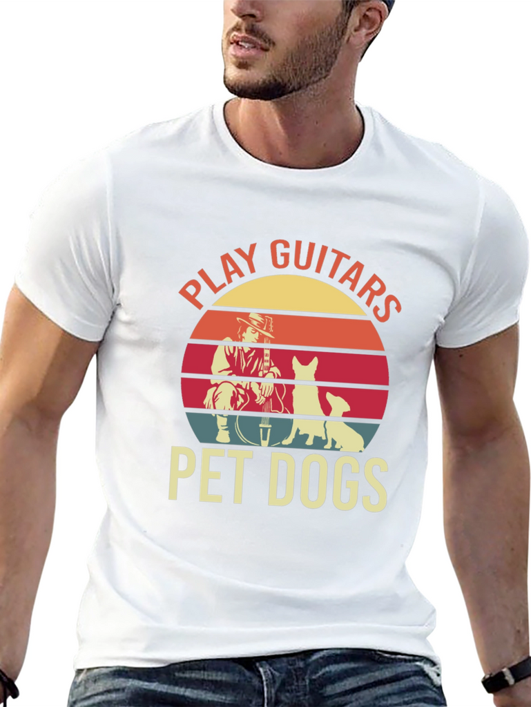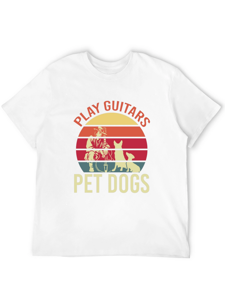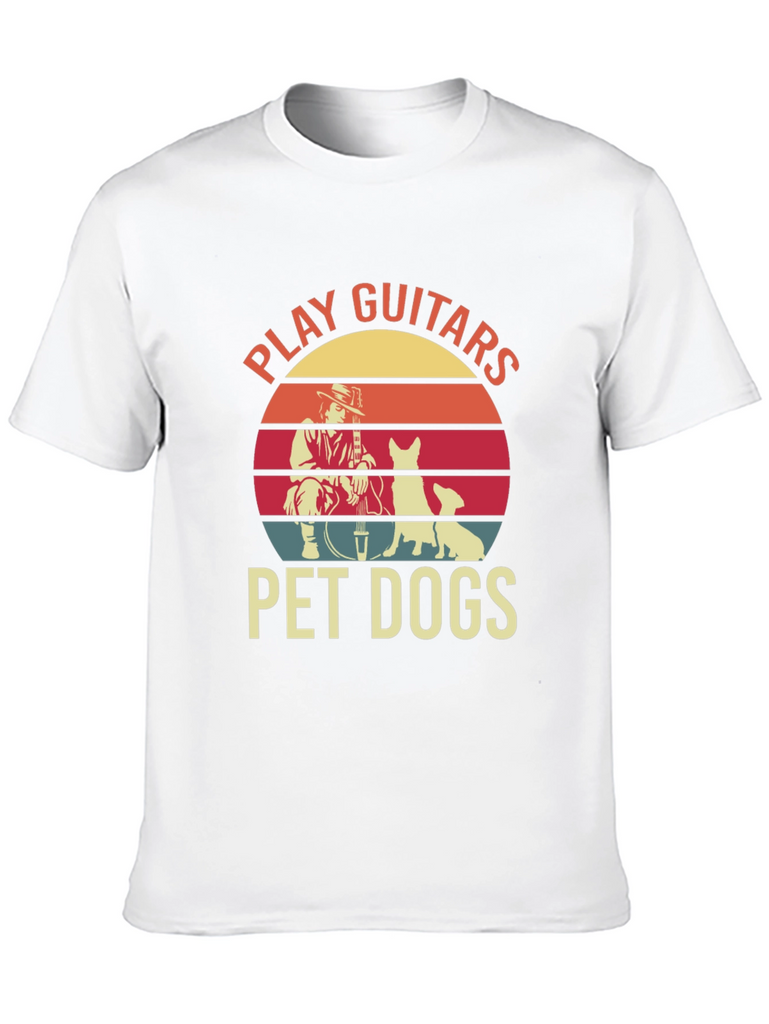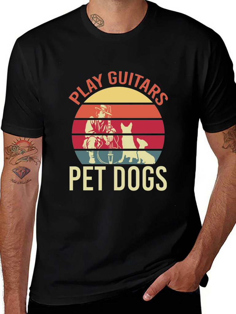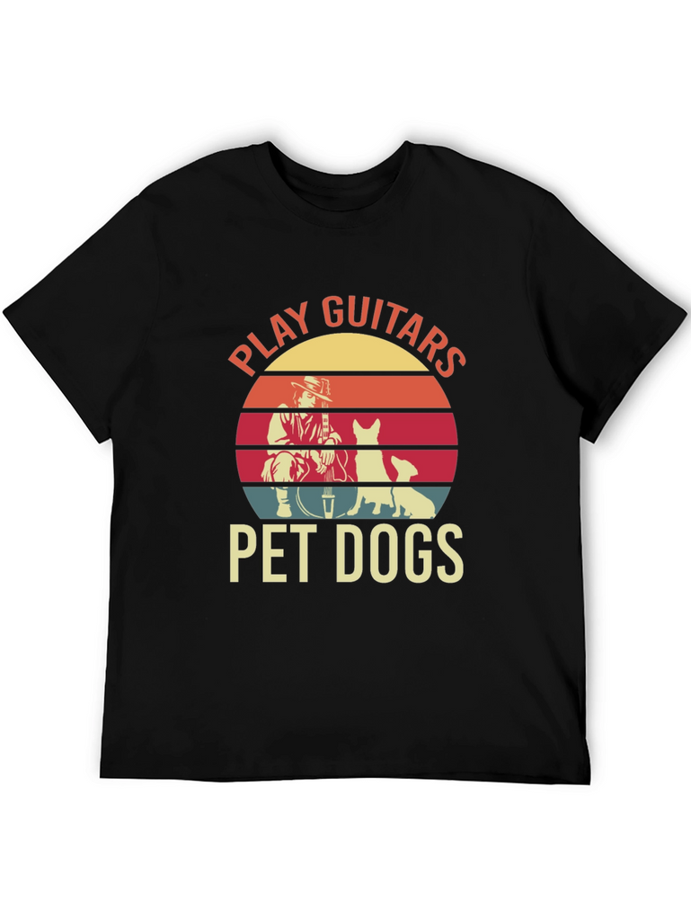 Show off your passions with this unique graphic tee! This black t-shirt features a vintage-inspired sunset design with a musician, dogs, and the words "Play Guitars Pet Dogs." It's made from a comfortable, soft-looking fabric, perfect for everyday wear. The bold design makes it a great conversation starter and a fun way to express your love for music and animals. Ideal for casual outings, concerts, or just relaxing at home with your furry friends. Add this eye-catching tee to your wardrobe today!