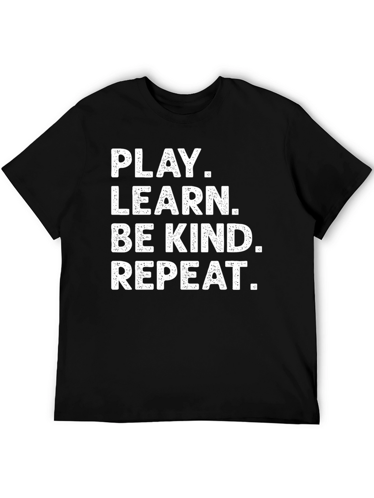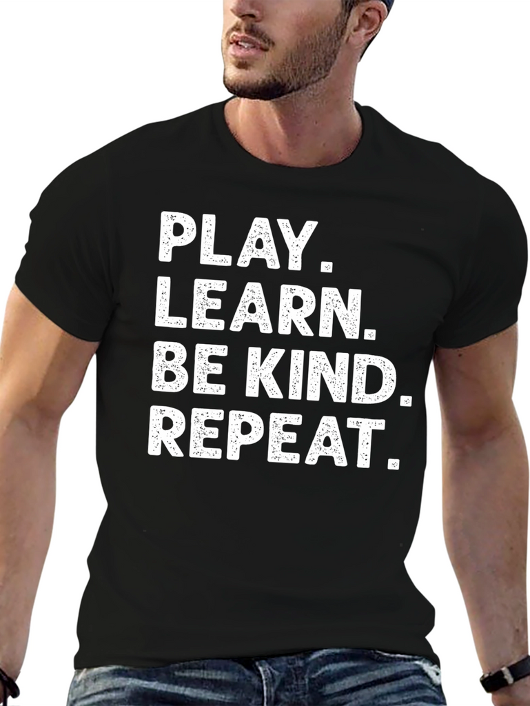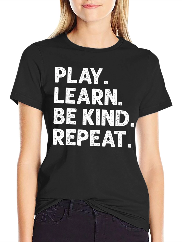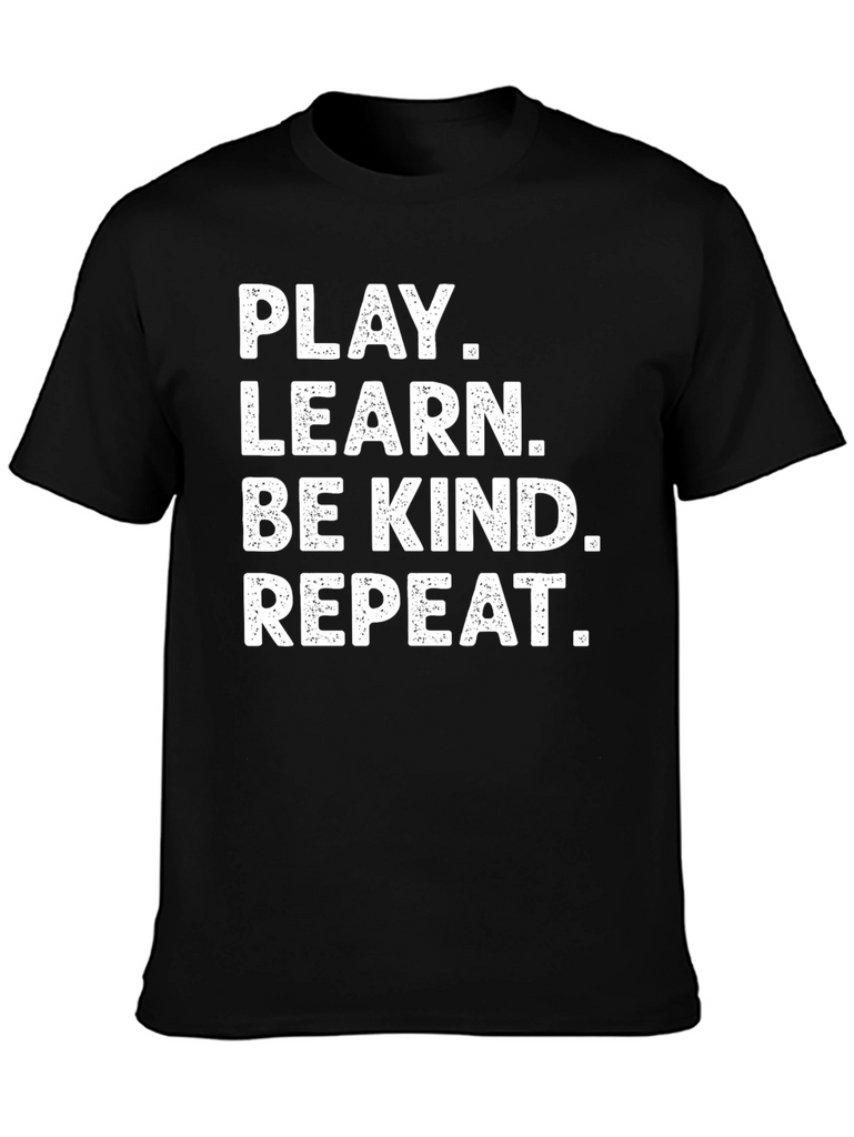 This classic black t-shirt features a bold, white text design that reads "PLAY. LEARN. BE KIND. REPEAT." vertically down the center. The shirt has a classic crew neck and short sleeves, making it a comfortable and casual choice for everyday wear. The relaxed fit allows for easy movement and a laid-back style. Ideal for teachers, students, or anyone who values kindness and continuous learning, this shirt is perfect for wearing to school, casual outings, or lounging at home. It is a simple yet meaningful way to spread a positive message and inspire others. A must-have addition to any wardrobe, this t-shirt is both stylish and socially conscious.