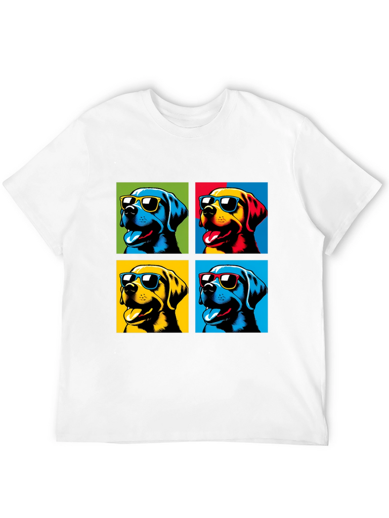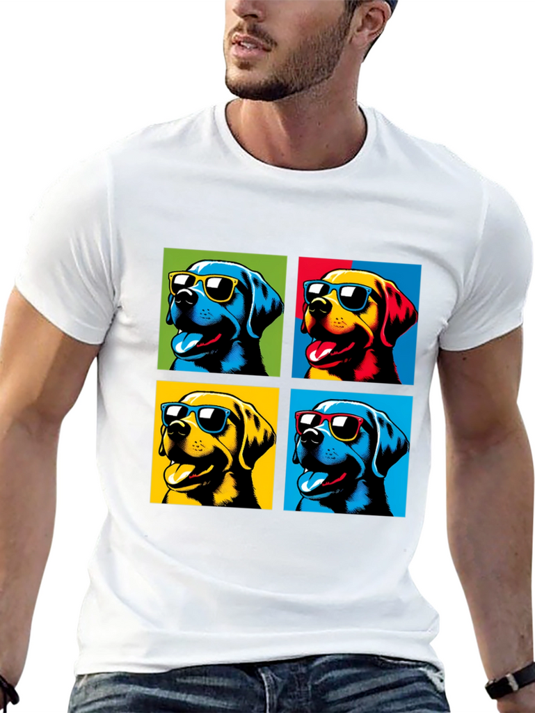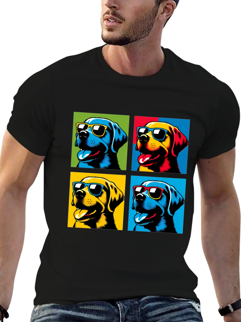 Show off your love for dogs with this unique pop art t-shirt. The shirt features a vibrant four-panel design showcasing a stylish canine wearing sunglasses in different color palettes. Made from a comfortable, breathable fabric, this tee is perfect for casual wear, dog park visits, or as a gift for the dog enthusiast in your life. The eye-catching design is sure to turn heads and spark conversations. Express your passion for pets with this trendy and comfortable t-shirt. Get yours today!