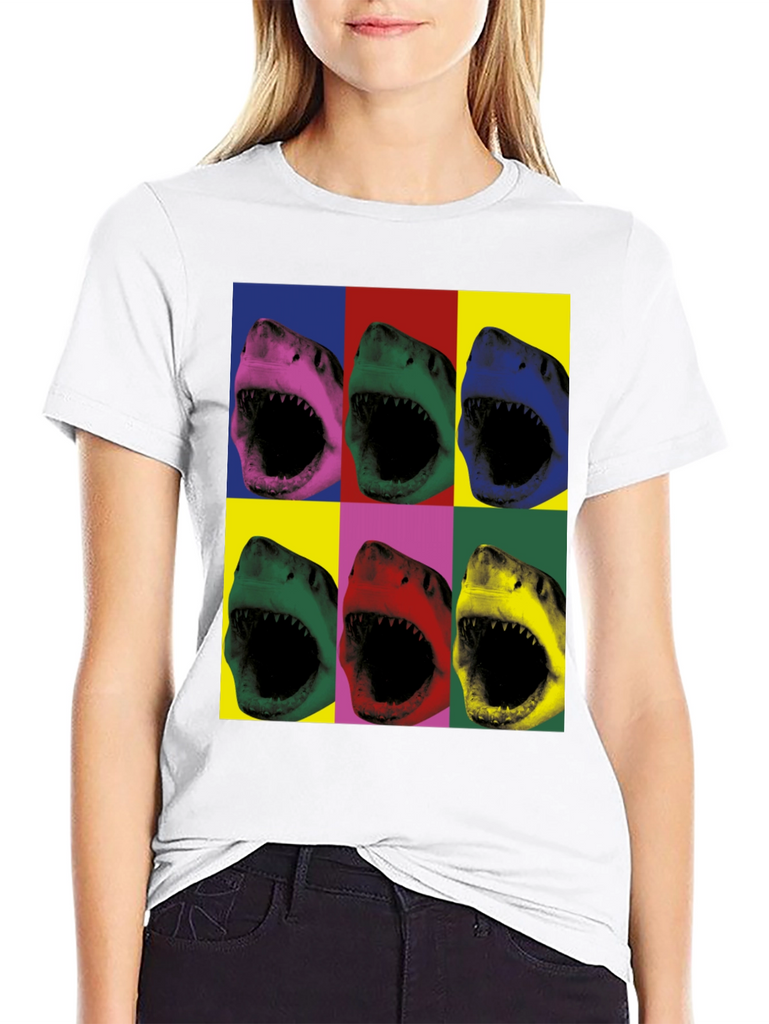 This black t-shirt features a vibrant pop art design with six different shark head illustrations in various bold colors. The playful, eye-catching graphic adds a unique twist to a classic wardrobe staple. Made from a comfortable-looking fabric, this tee is perfect for casual wear, concerts, or making a statement. Stand out from the crowd with this conversation-starting piece, perfect for shark enthusiasts and art lovers alike. Add it to your closet today!