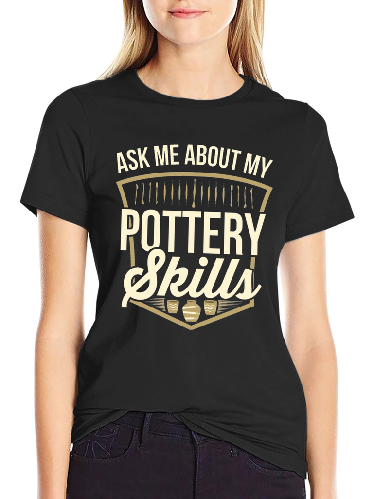 Showcase your passion for pottery with this eye-catching black graphic t-shirt. The tee features a unique design with pottery tools and vessels. The catchy slogan, "ASK ME ABOUT MY POTTERY SKILLS" makes it an instant conversation starter. Made from a soft, comfortable fabric, this casual t-shirt is perfect for everyday wear, pottery classes, or craft fairs. A stylish and unique addition to any pottery lover's wardrobe. Get yours today and let your pottery enthusiasm shine!