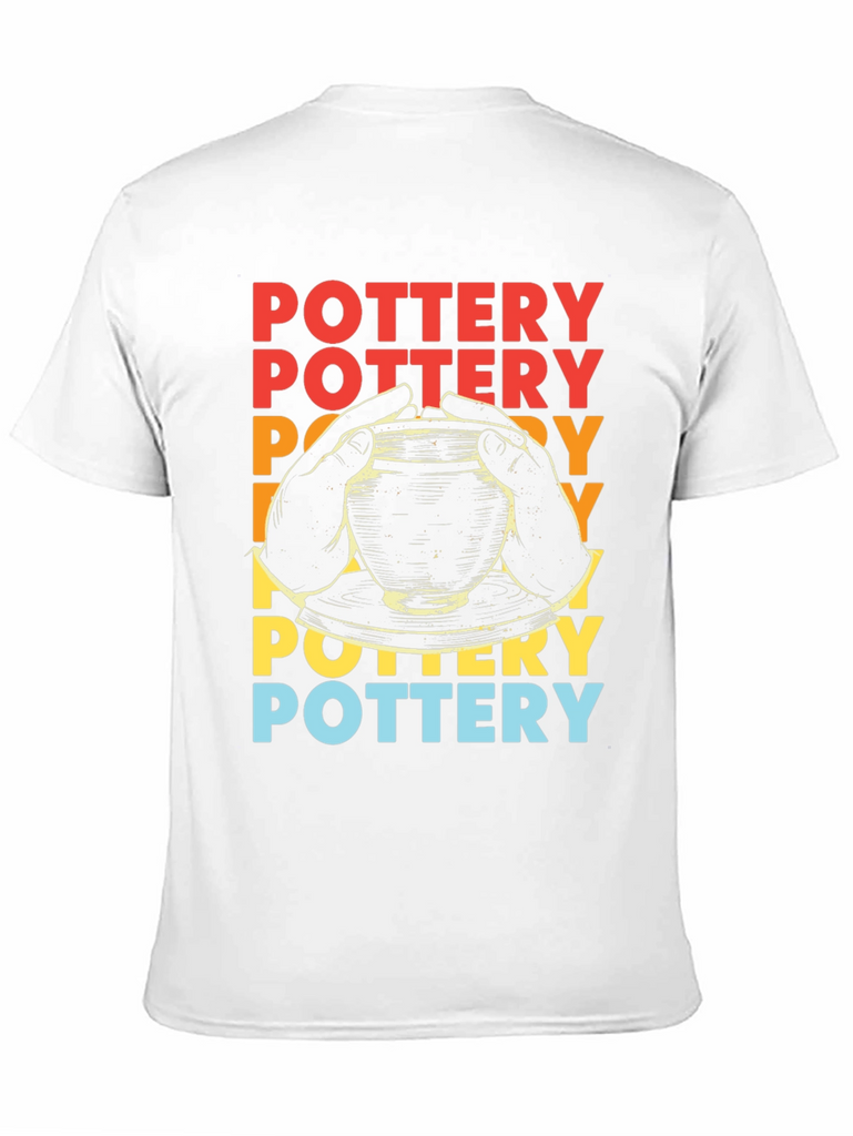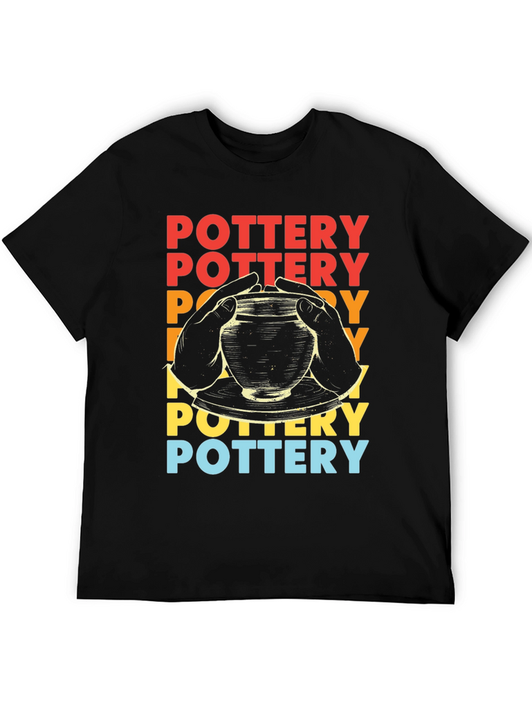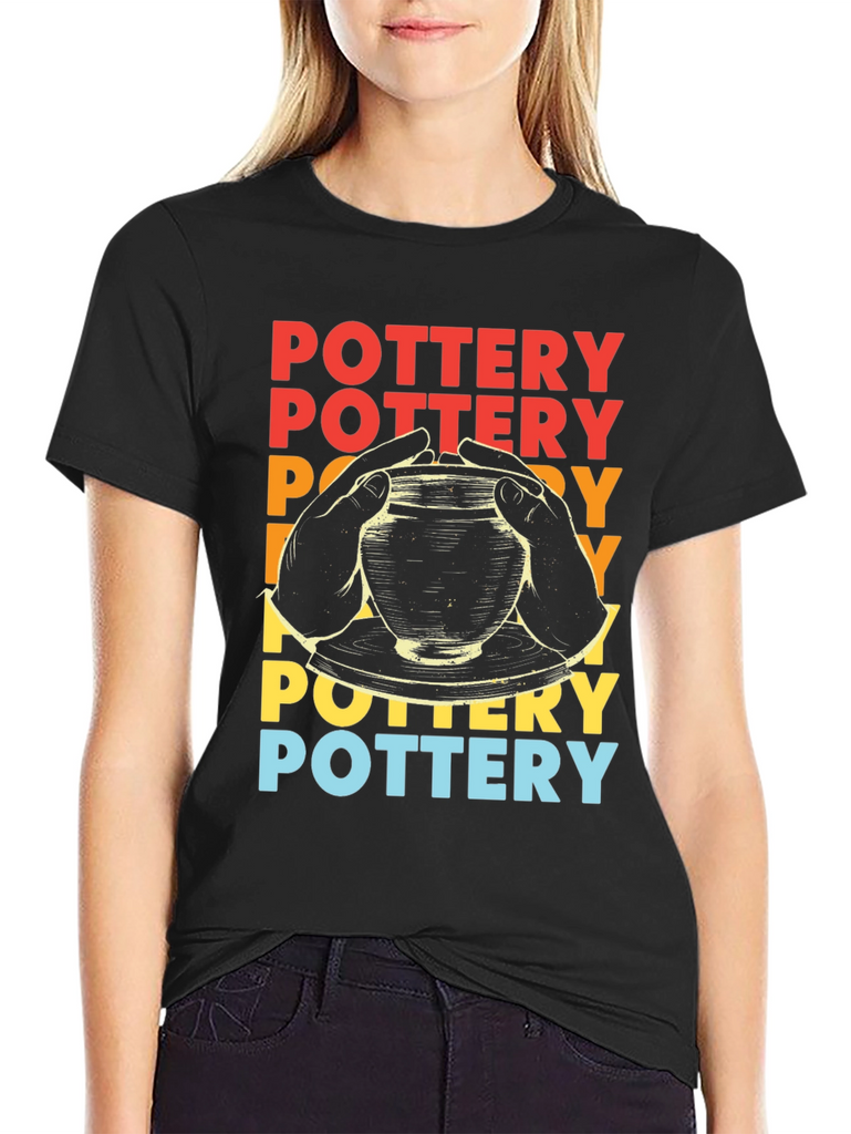 Show your love for pottery with this unique black t-shirt! Featuring a vibrant, stacked "POTTERY" design in red, orange, yellow, and blue, this shirt showcases a hand-crafted clay pot image. Made from a comfortable, breathable fabric, it's perfect for everyday wear. Whether you're a potter yourself or simply appreciate the art, this t-shirt is a great way to express your passion. Ideal for casual outings, pottery classes, or as a gift for the art enthusiast in your life. Stand out with this eye-catching and stylish tee!